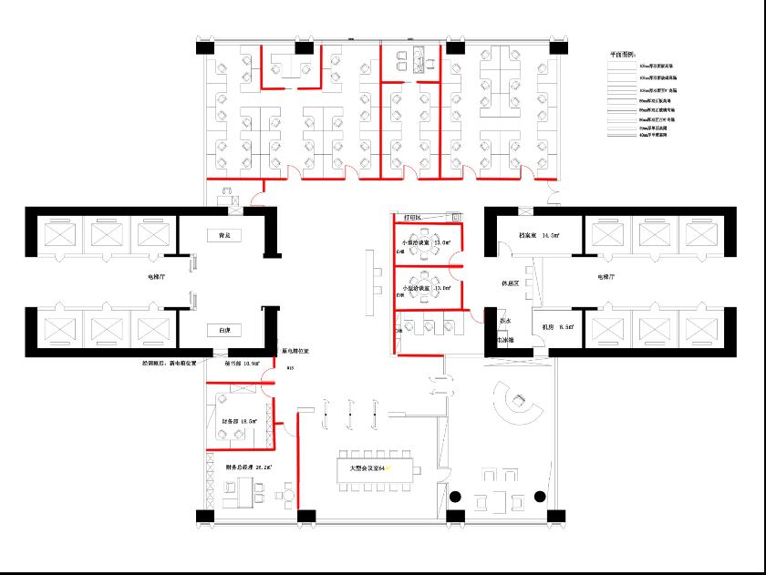 为此,本方案临走道的隔墙采用了双面108款玻璃隔断,为的是最大化的把自然光引进室内,图中表示,兰色线表达的是即将用高隔断的墙体。