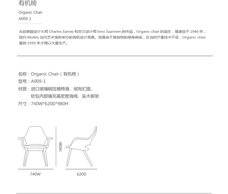 出自美国设计大师Charles Eames和芬兰设计师Eero Saarinen的作品,Organic Chair的诞生,是源自于1940年,纽约MoMa当代艺术馆所举办的有机有机设计竞赛。但是由于其独特的椅身曲线,及当时产量技术不足。Organic Chair一直到了1950年,才得以大量生产。Organic Chair是一张舒适的阅读椅,柔软的乘坐质感,贴心的扶手收边,加上榉木打造的椅脚造型,让他格外的具有收藏价值,在茶几边,书房中,搭配上优美的Organic Chair,悠然自得的午后时光,舒心惬意!