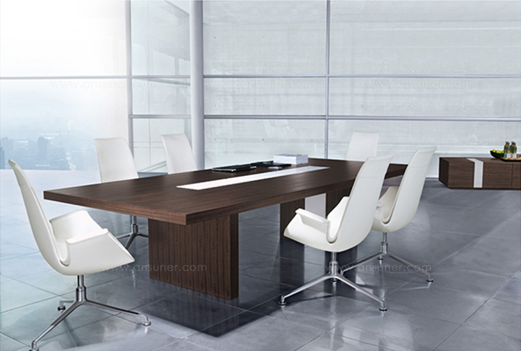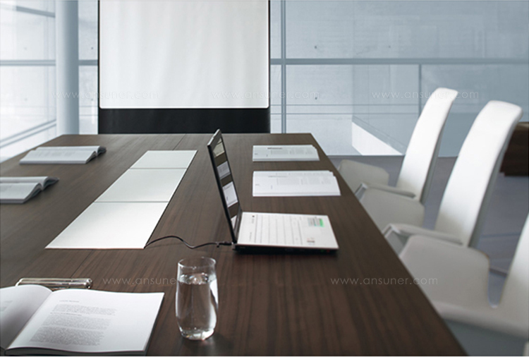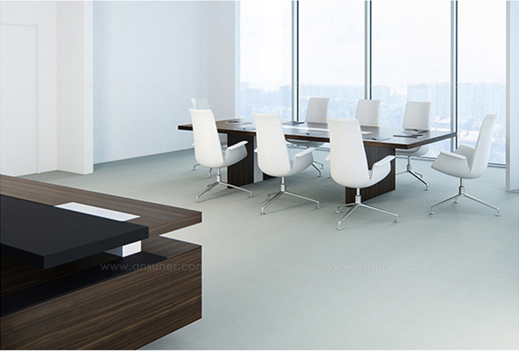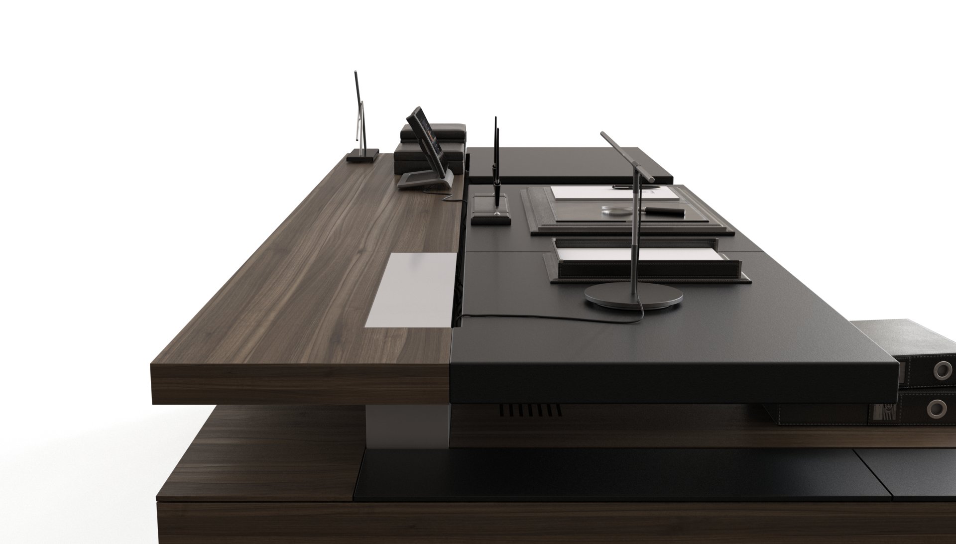 这是EOOS的新总部和会议项目设计团队对该产品强大的美学诉求,比例和维度在优雅的材料的相互作用下给人深刻的印象。在几何基础上,材料的拼贴形成了它的气场。海洋胡桃木饰面可以给你和你的客人带来一种很好的体验;扶手处采用精美的皮革覆盖。由Corian制成的白色方块盖住了集成线盒,看不见的触点是打开的关键。每个设备的连接器都在方块之下,所有的电缆都隐藏在侧板和桌子上,衔接到各种设备。在工作台表面的旁边,一个隐藏的抽屉,里面可以收纳你日常所需的小物件。