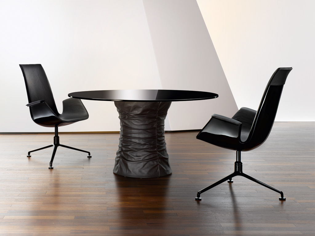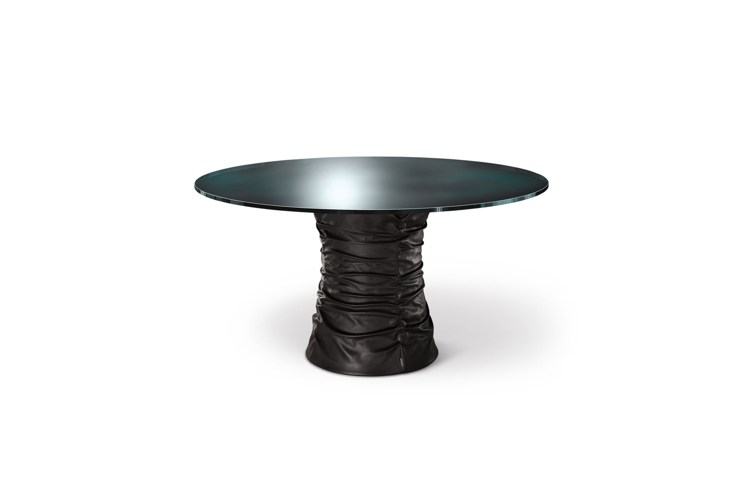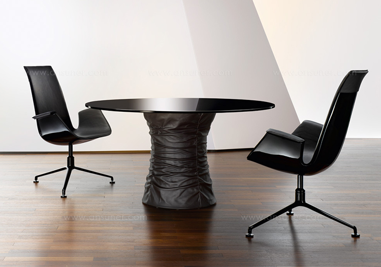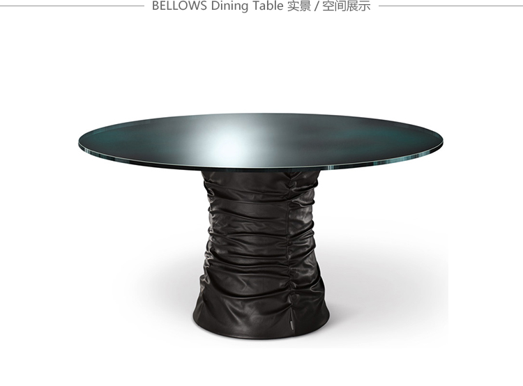 圆形茶几,这是一个家人、朋友聚在一起的地方,在这里,你们可以一起讨论一件事或者享受美食。最原始的欢乐。风箱式的餐桌体现了魅力和生活态度。柔软的皮革和玻璃搭配,稳定的底座和精致的桌面,温暖而凉爽的材料组合在一起创造出独特的效果。