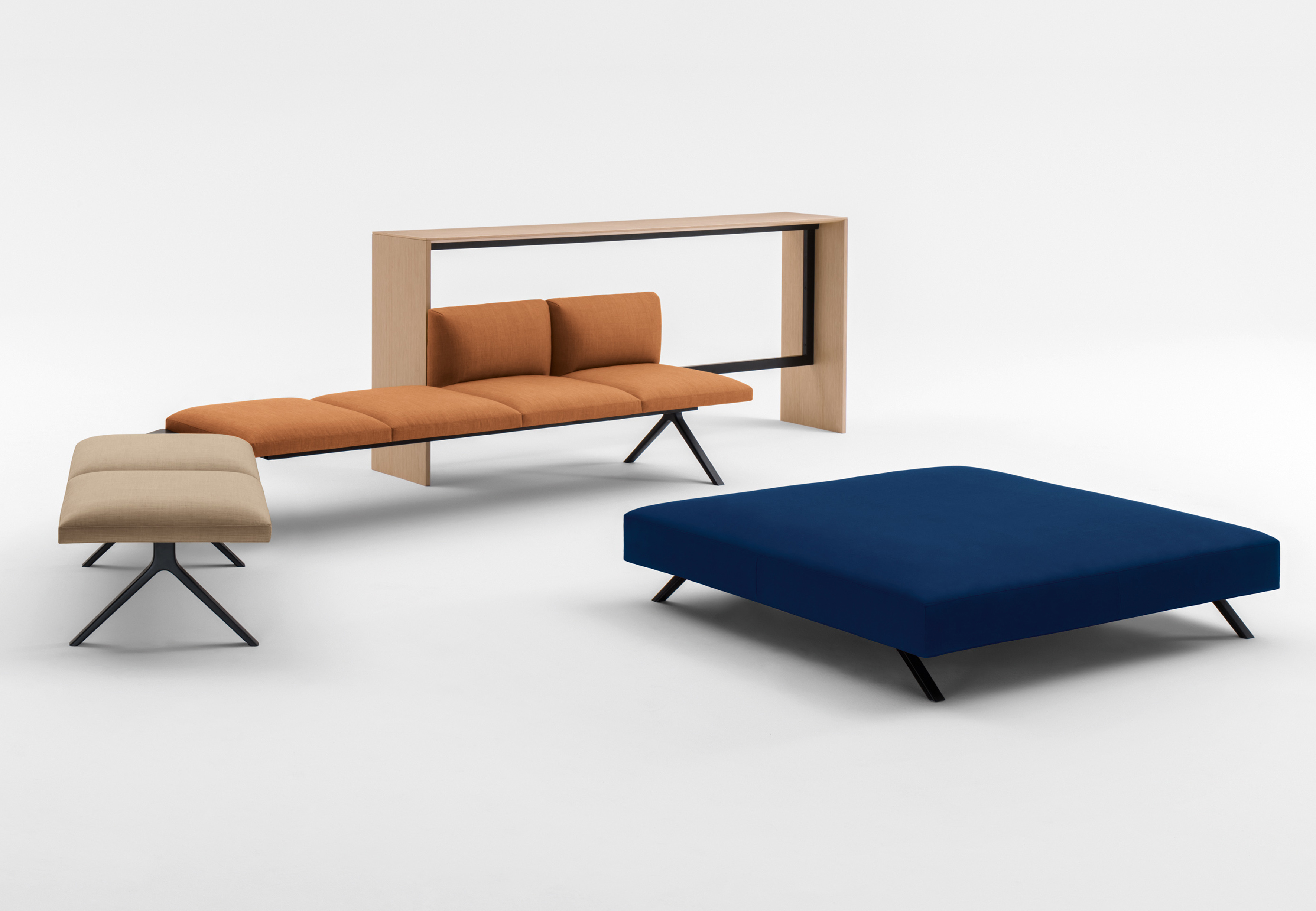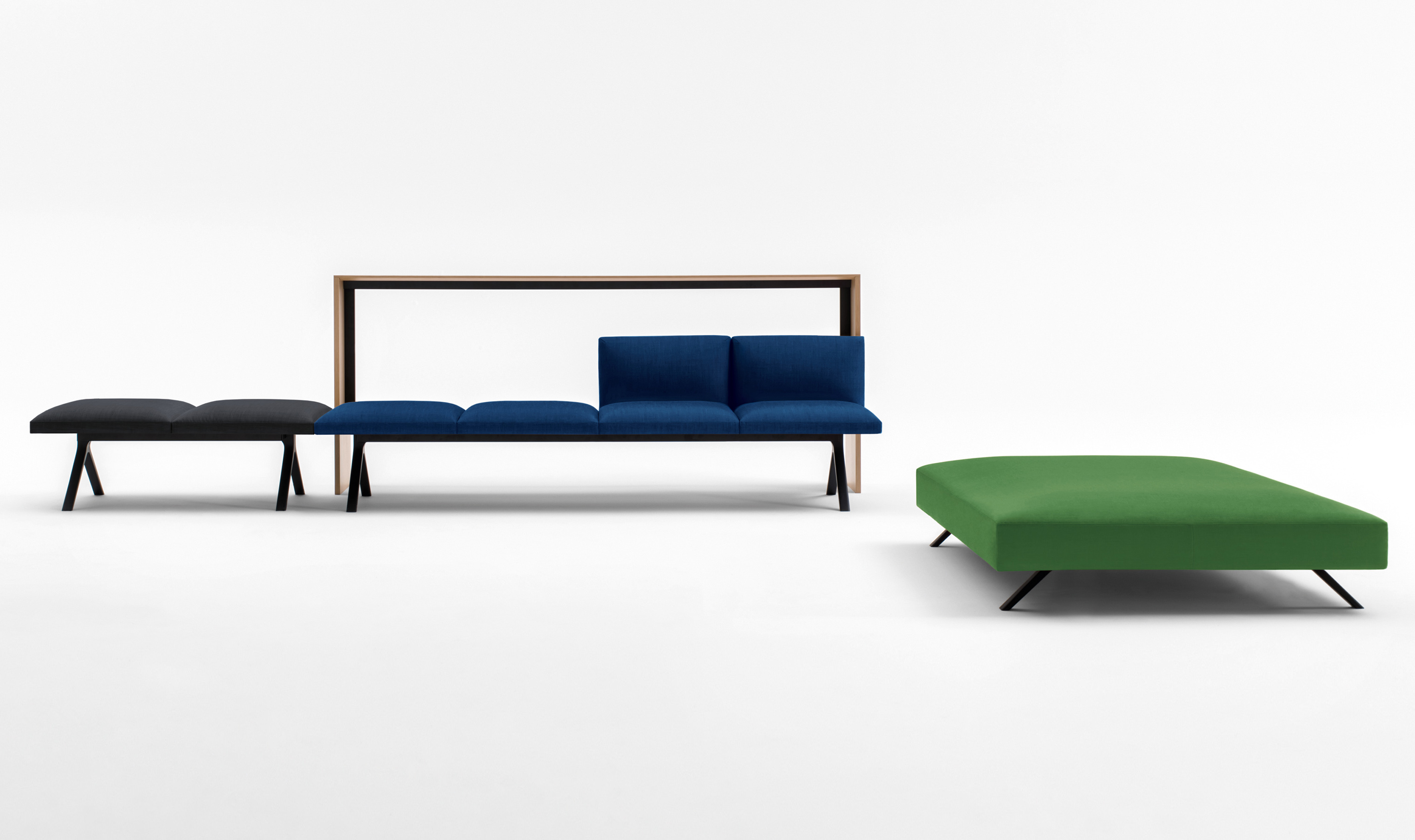 Kiik是一个模块化系统,由各种尺寸的框架组成,可与垫子结合,可提供或不提供63x63 cm靠背,座位高度为45 cm。Kiik桌子有不同的形状和尺寸(矩形、方形、三角形、四分之一圆形),因此允许线性和L形模块(120°和90°)。该系列的补充是一个控制台与252x40厘米的三个高度顶部:58,72 e 105厘米,和126x157.5厘米的座椅高度36厘米的搁脚凳。