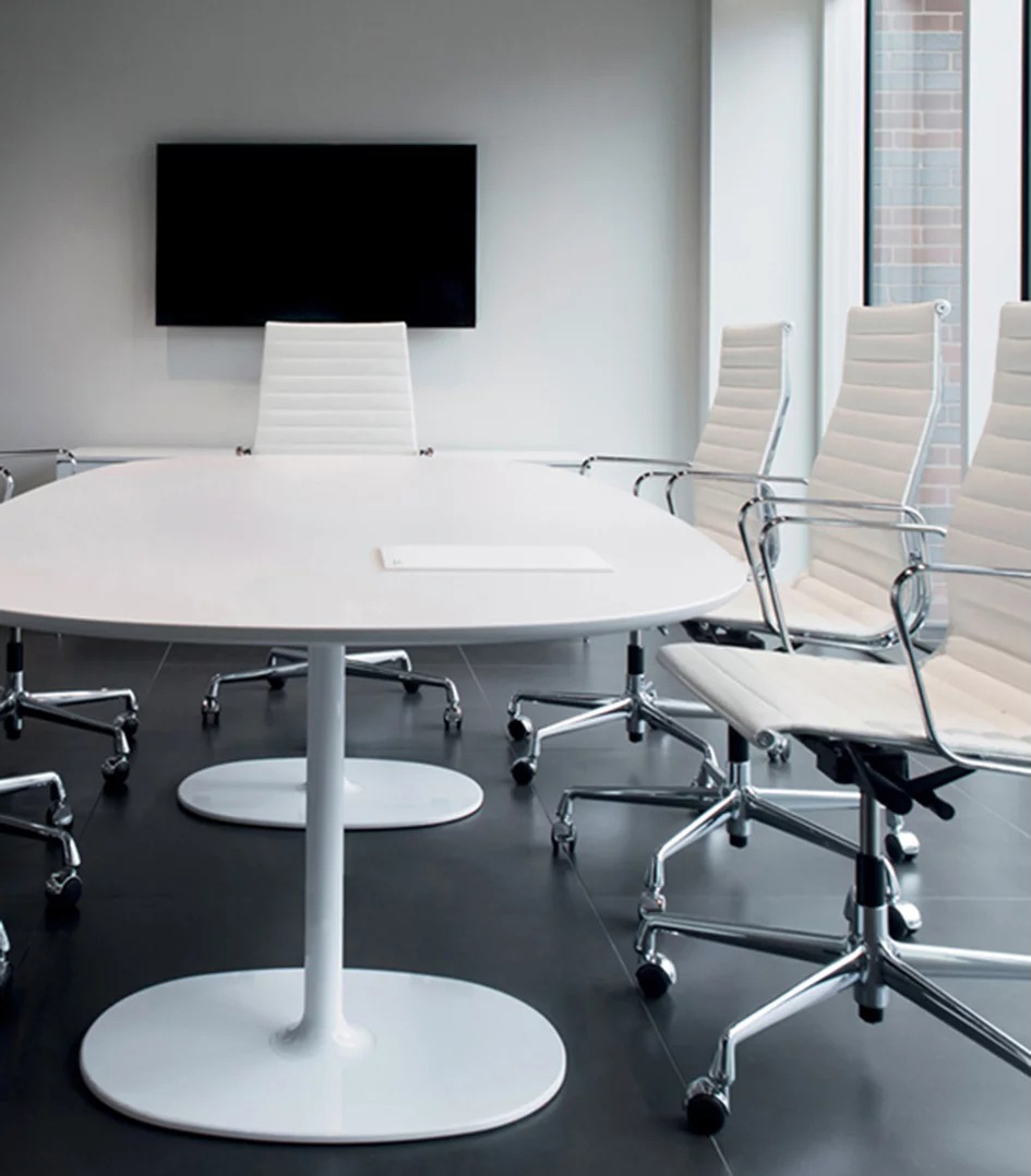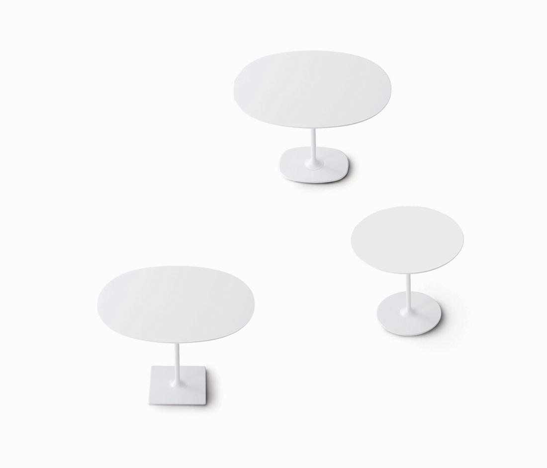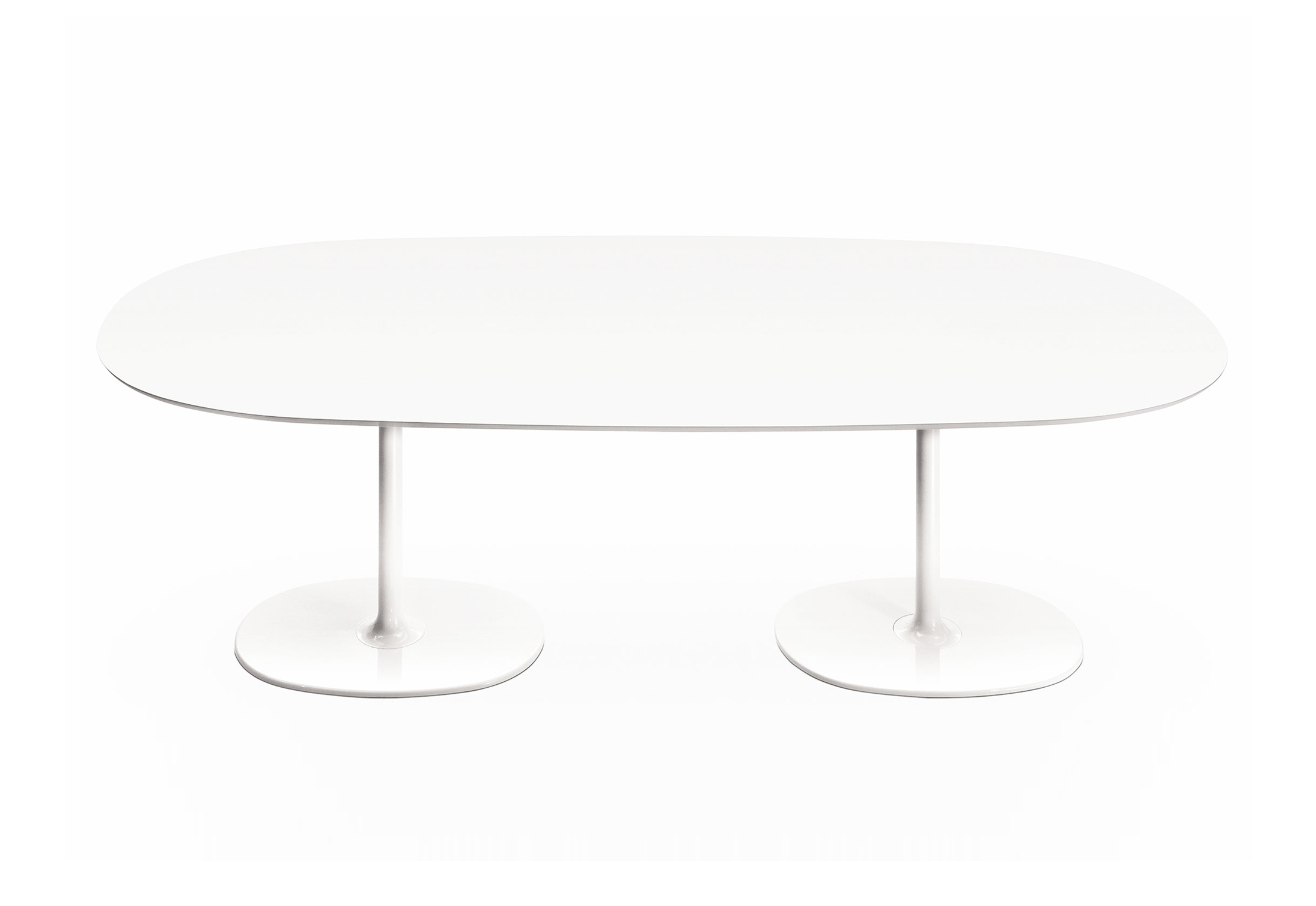 餐台带双椭圆形底座,白色有光泽或黑色哑光粉末涂层钢,顶部为白色压花MDF(厚2.5厘米)或层压板FenixⓇ(厚2,6厘米),有不同尺寸可供选择。 身高74厘米。