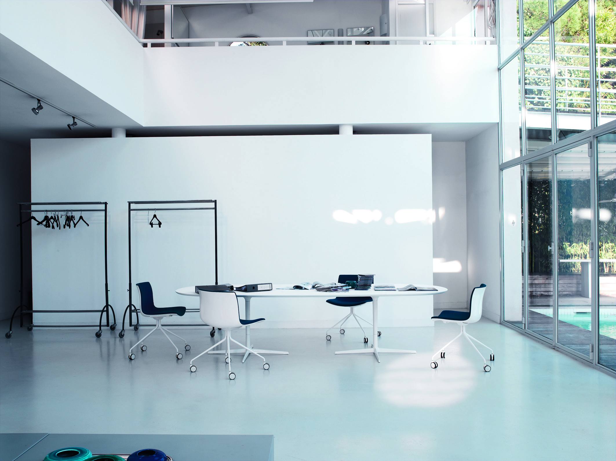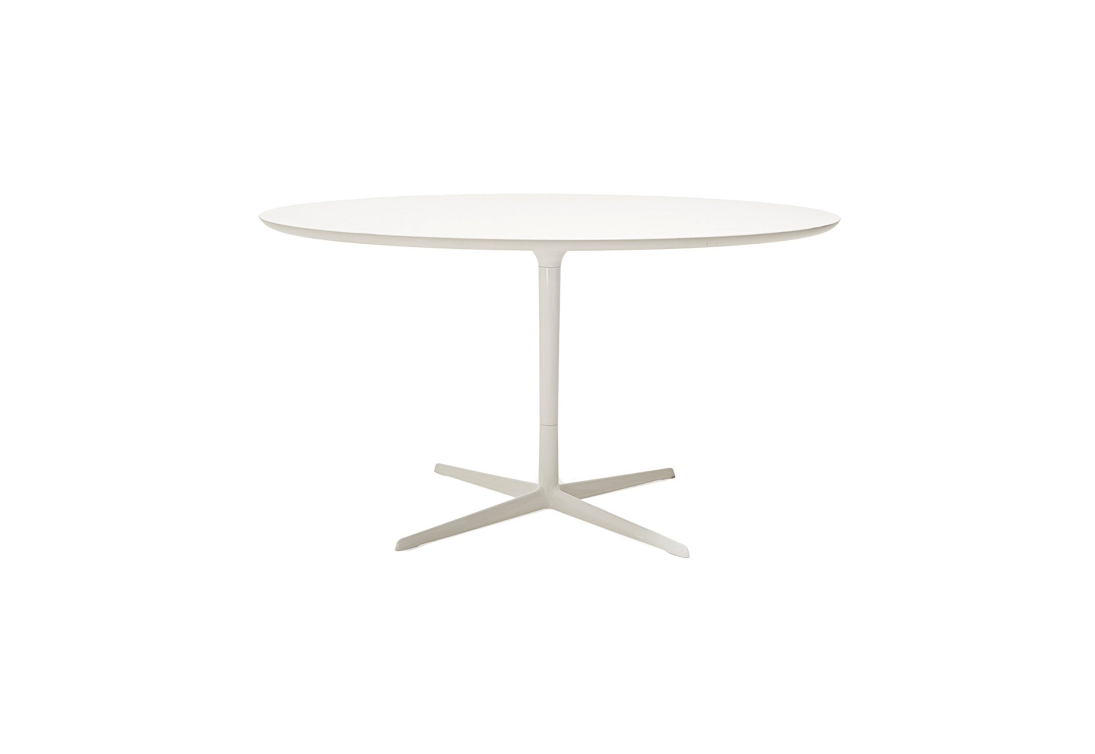 带粉末涂层铝制4向底座和顶部的桌子,白色压花MDF(厚2.5 cm)或层压Fenix(厚2.6 cm)。身高:74厘米。