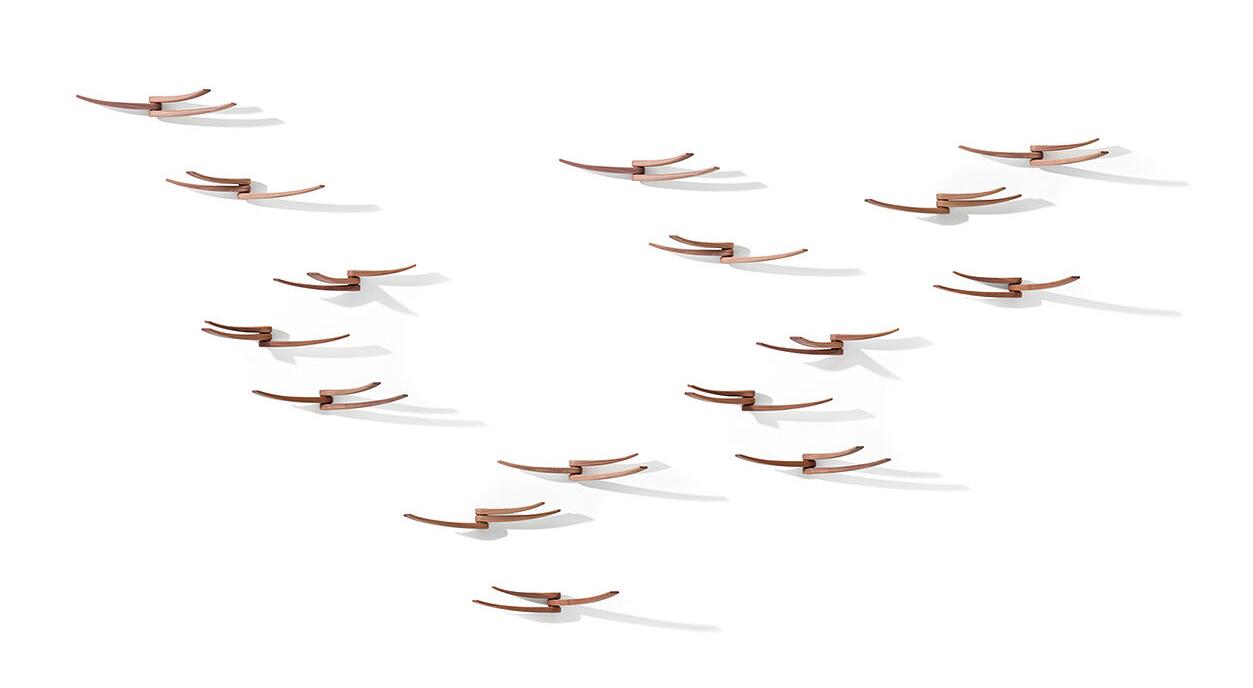 Wing是一个壁挂式衣架,其动画墙壁的流动和轻柔条纹臂的运动扭曲和转动,创造出雕塑般的构图。 它一起或单独投射出一种柔软,起伏的形状,通过使用进一步动画,是任何空间的完美补充。