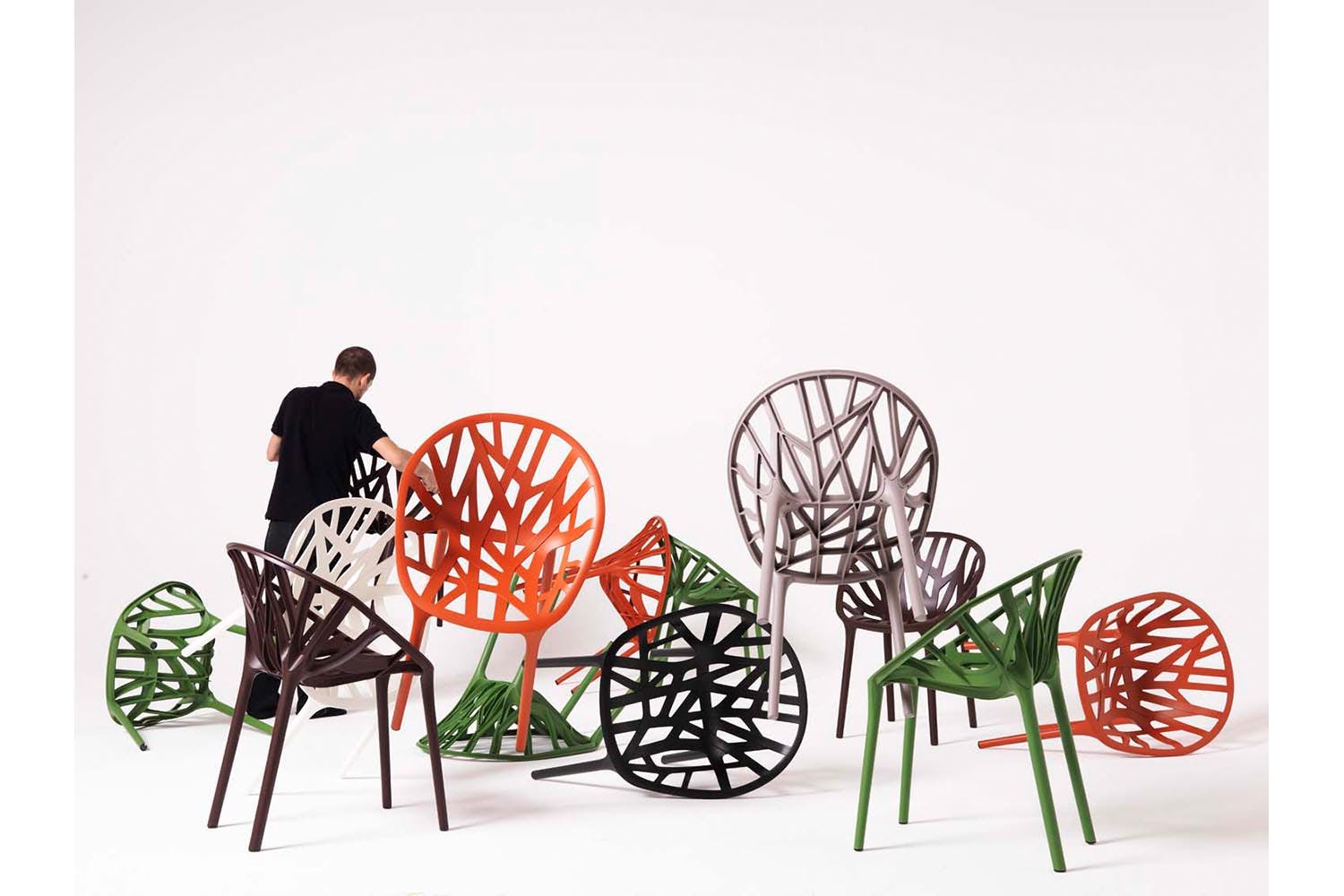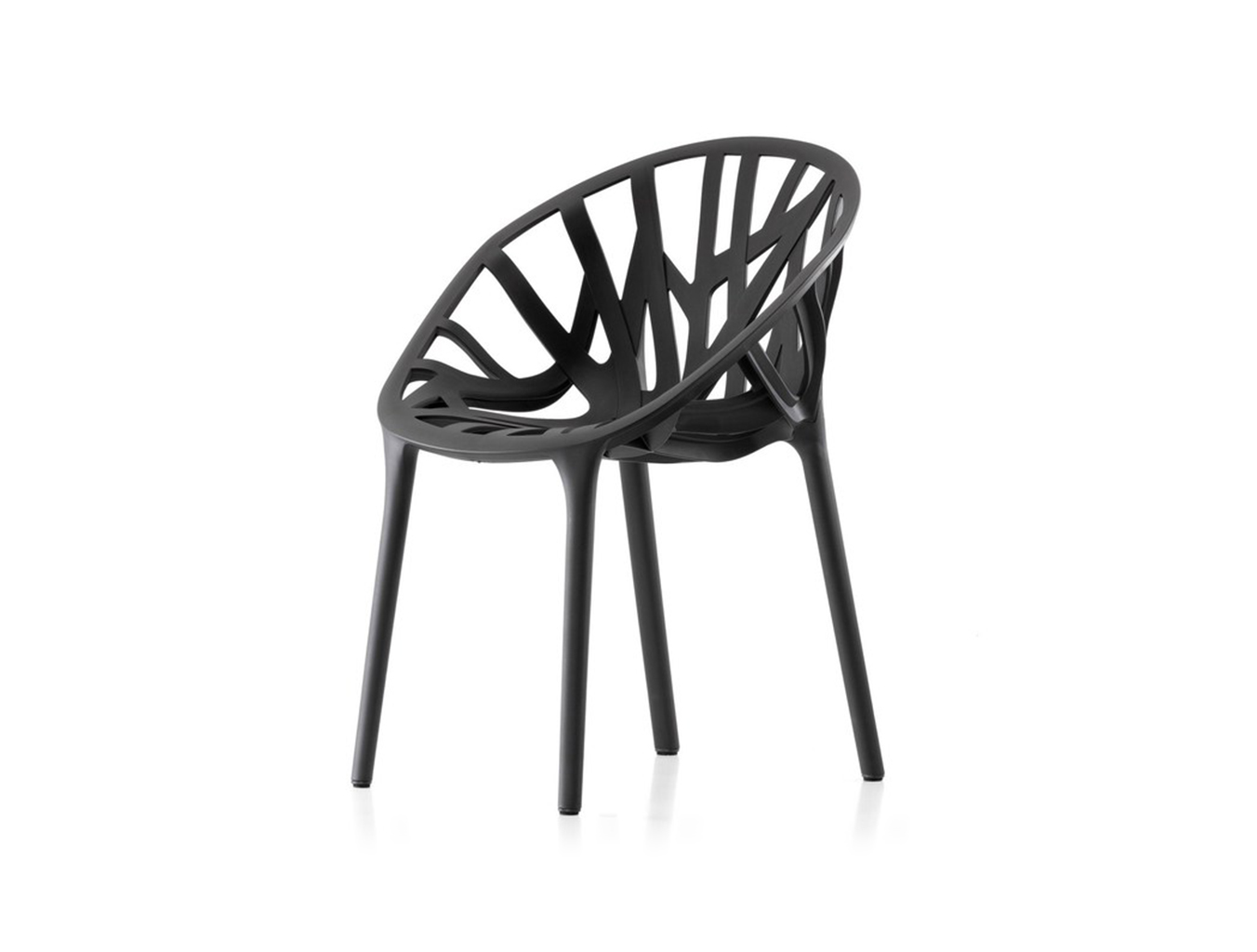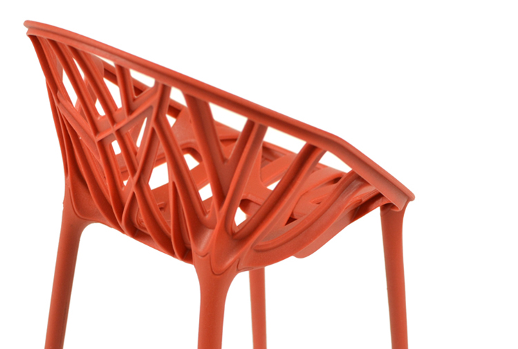 该过程涉及无数原型和对注塑技术的深入探索。我们的目标是创造一把椅子,希望看起来像自然植被,同时融入必要的力量,稳定性和舒适性。扁平的分支状肋条在三个层面上不对称地缠绕在一起以形成座椅壳体,座椅壳体成形为不规则的圆形并由四条腿支撑,这四条腿似乎从地面发芽。