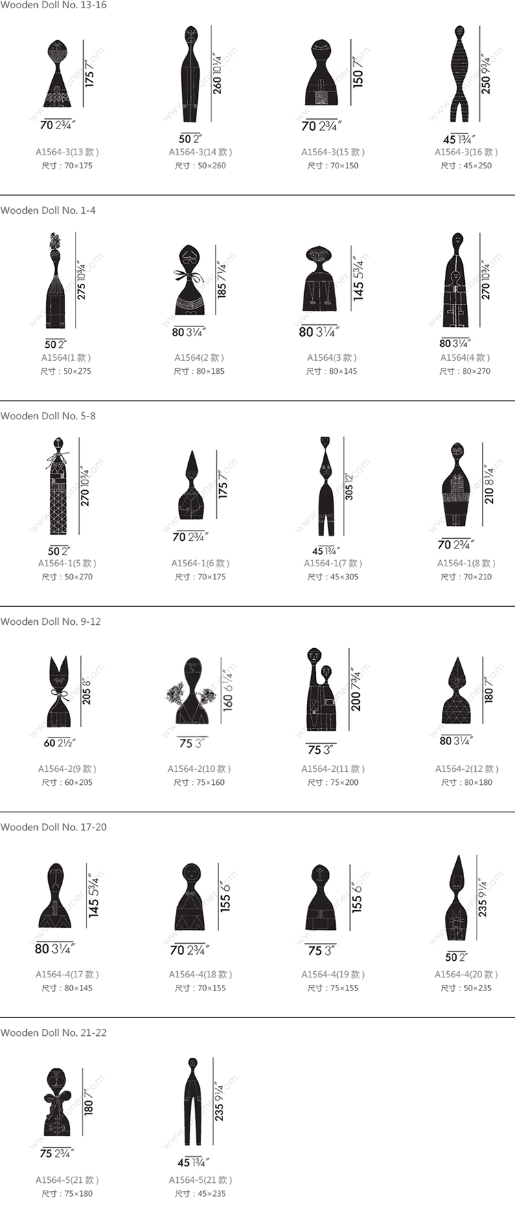 Wooden Doll No.13-16 系列尺寸/示意图
