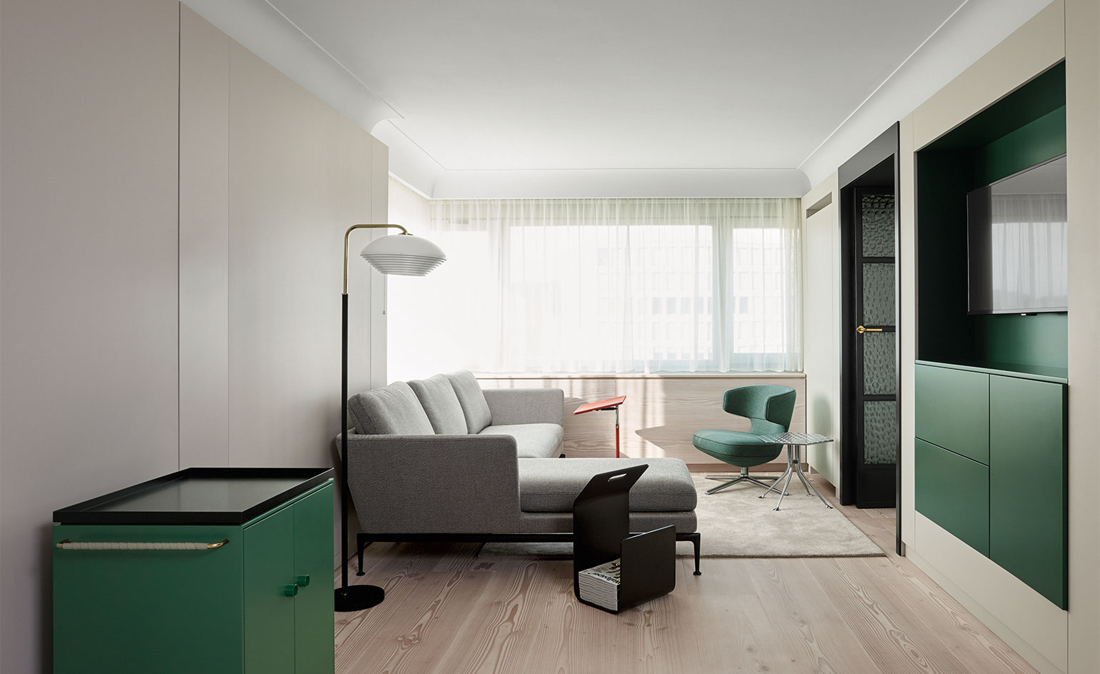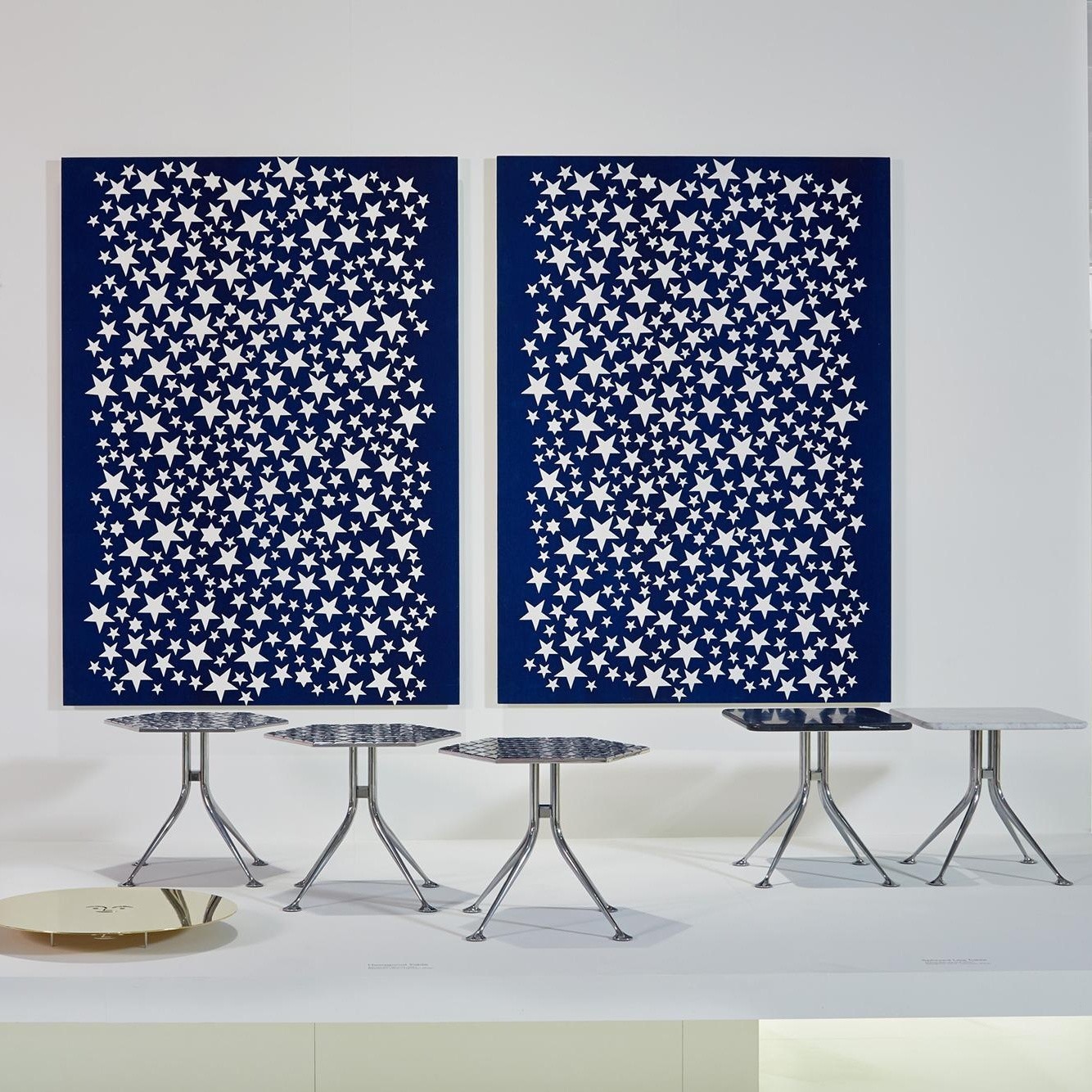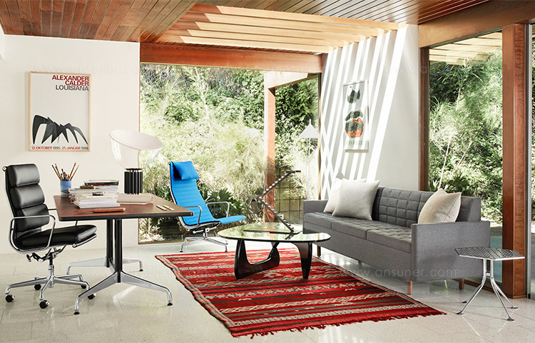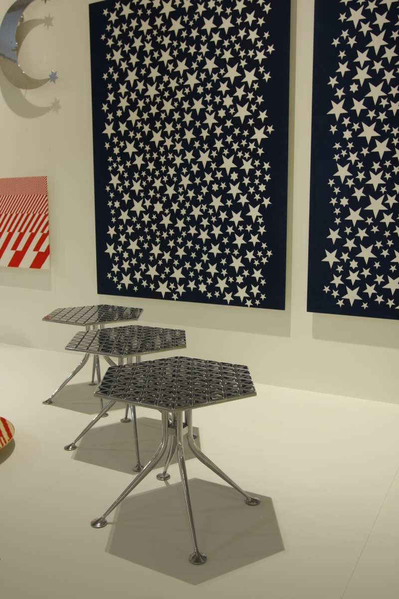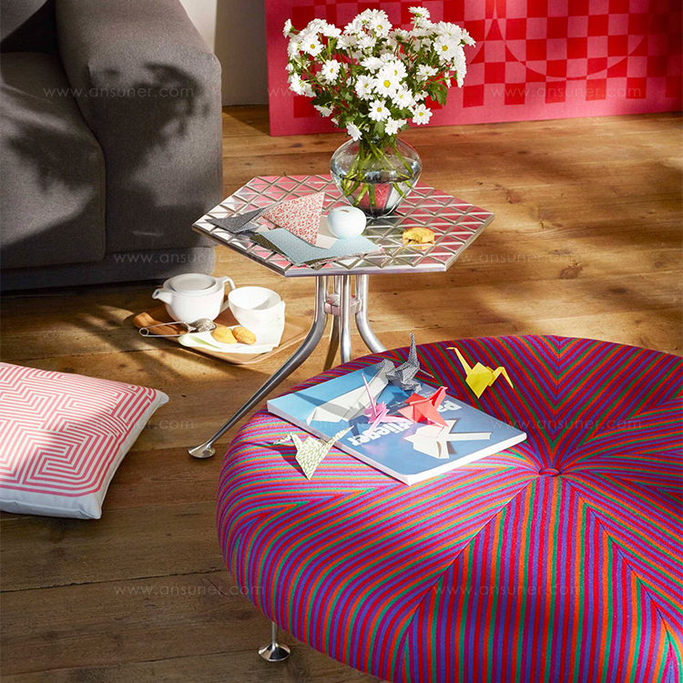 Girard被认为是面料、颜色、图案和纹理的大师级设计师。他的六角形桌子的铝制顶部刻有几何图案,在墙上的光线反射中可以看到。这种有趣的效果与Girard装饰性边桌的冷酷金属美学相得益彰。