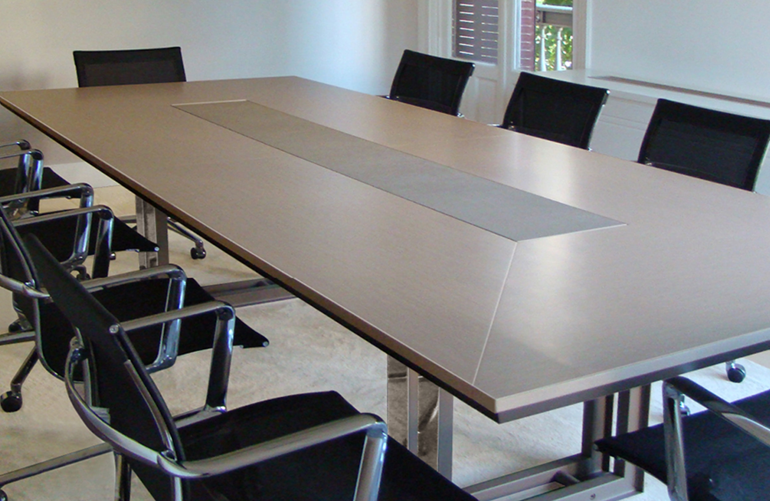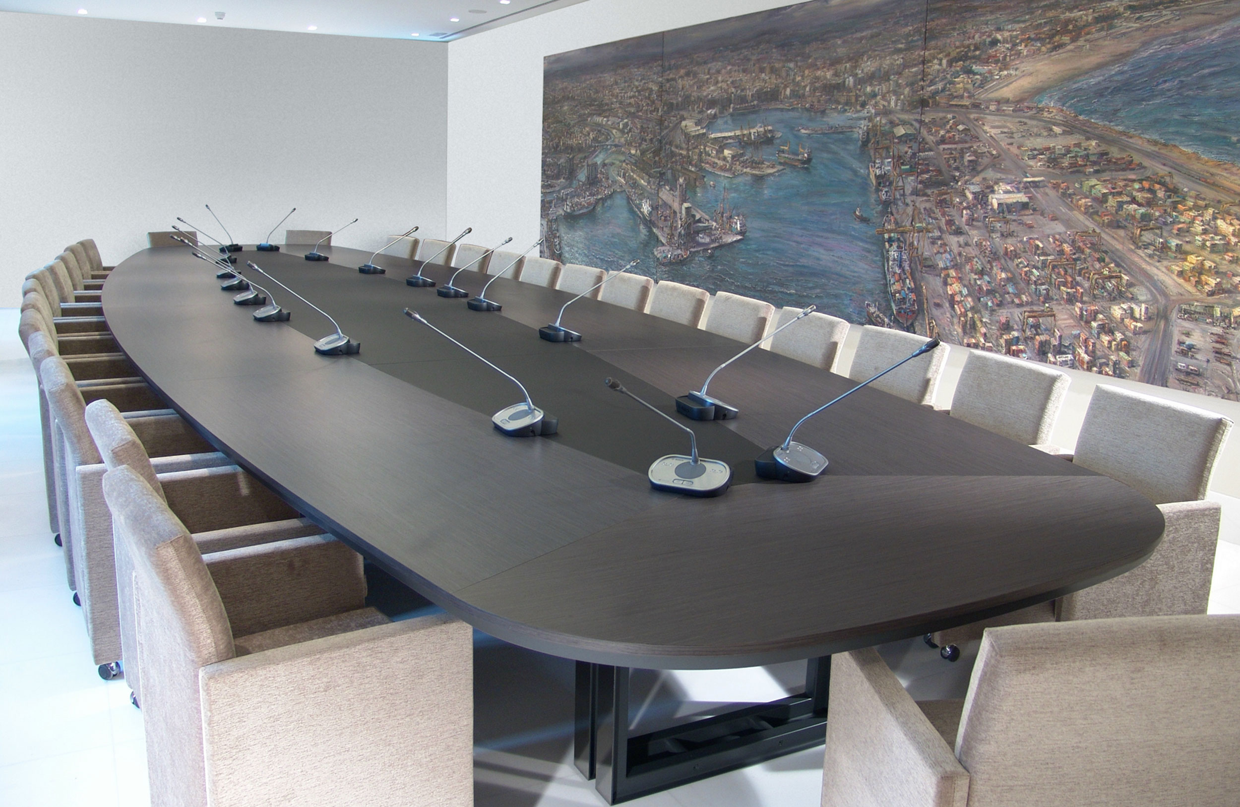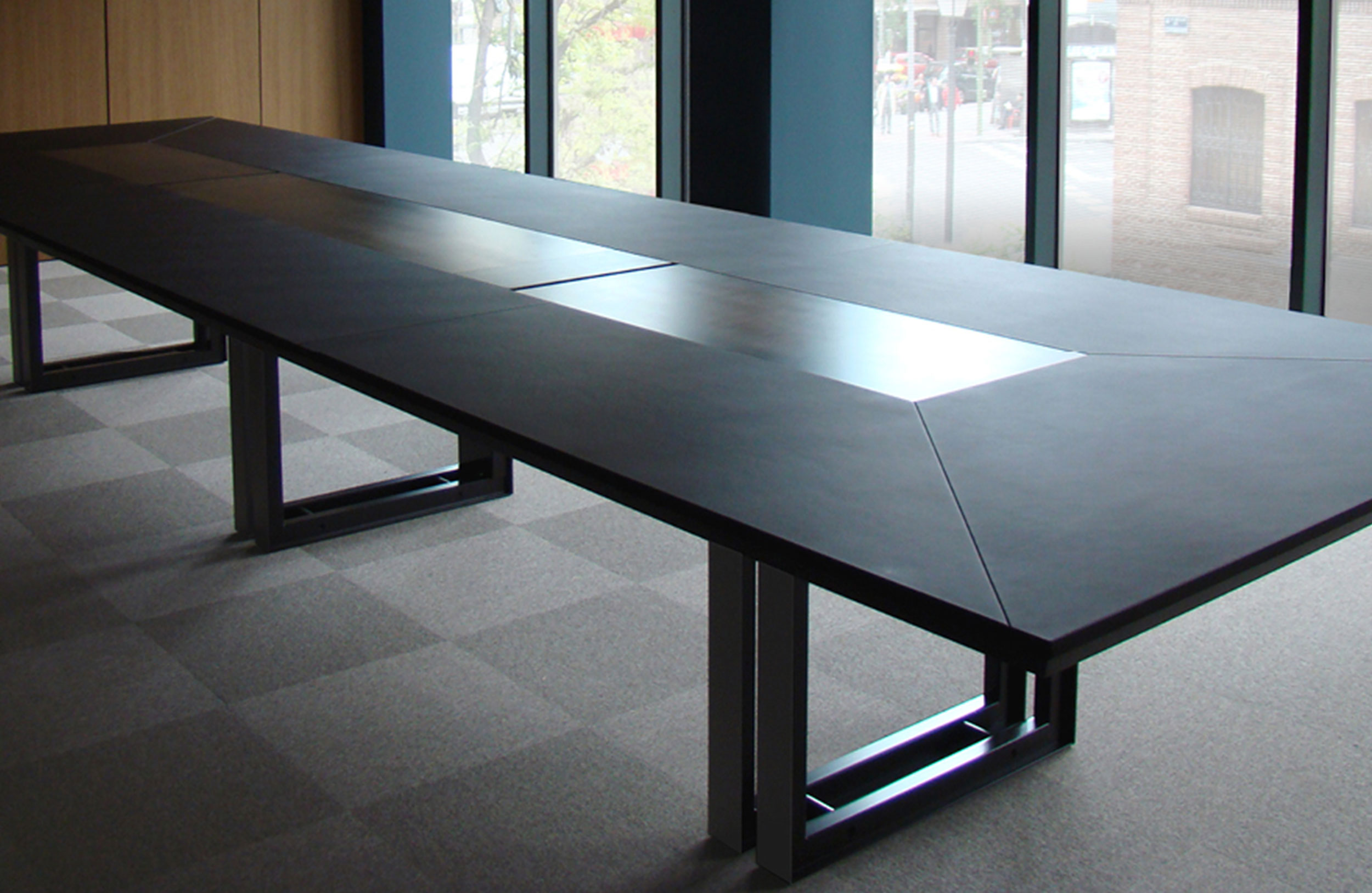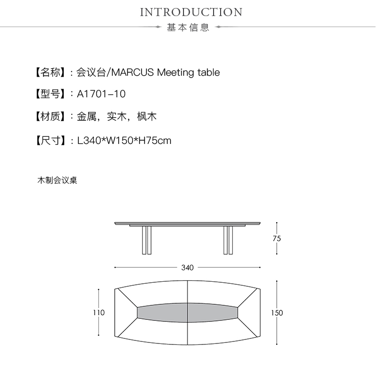 会议桌。椭圆形顶部,直头和Techno Leather软垫中央区域。50毫米厚的顶部,由顶盖和带45o斜边的底盖组成。底座由两个双框金属腿组成。表面处理:顶部采用木材,微纹理漆或Techno Leather的室内装潢。双框腿采用微纹理漆,外部表面采用不锈钢表面处理。