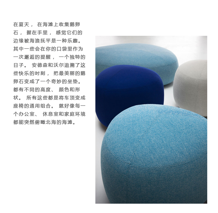 在夏天,在海滩上收集鹅卵石,握在手里,感觉它们的边缘被海浪抚平是一种乐趣。其中一些会在你的口袋里作为一次邂逅的提醒,一个独特的日子。安德森和沃尔追溯了这些快乐的时刻,把最美丽的鹅卵石变成了一个奇妙的坐垫。都有不同的高度、颜色和形状。所有这些都是将车顶变成座椅的通用组合。就好像每一个办公室、休息室和家庭环境都能突然俯瞰北海的海滩。