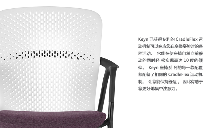 Keyn座椅系列是一套会议和单椅的组合,能为协作式的空间提供响应式的运动机制和即时的舒适感。由伦敦设计团队forpeople设计的这款产品,使用了四个关键部件来创作此系列中的每个型号的产品,所以每款产品都能保持一样的视觉吸引力。Keyn的CradleFlex运动机制能响应姿势的变换,倾仰角度可达10度,能为您带来令人愉悦的舒适感