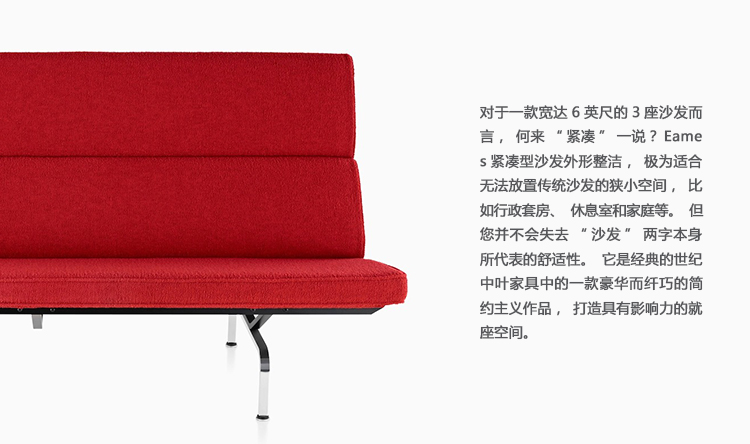 Eames紧凑型沙发既有传统笨重沙发的所有舒适性,又能轻松布置在无法使用大沙发的狭小空间内。以放在家庭的前厅、书房、工艺间或缝纫室,或是家庭办公室。可以放在行政套房、休息室和接待区。可以布置在小公寓中的起居室内,这款沙发可以提供足够的就坐位置,而且不会破坏房间比例搭配。