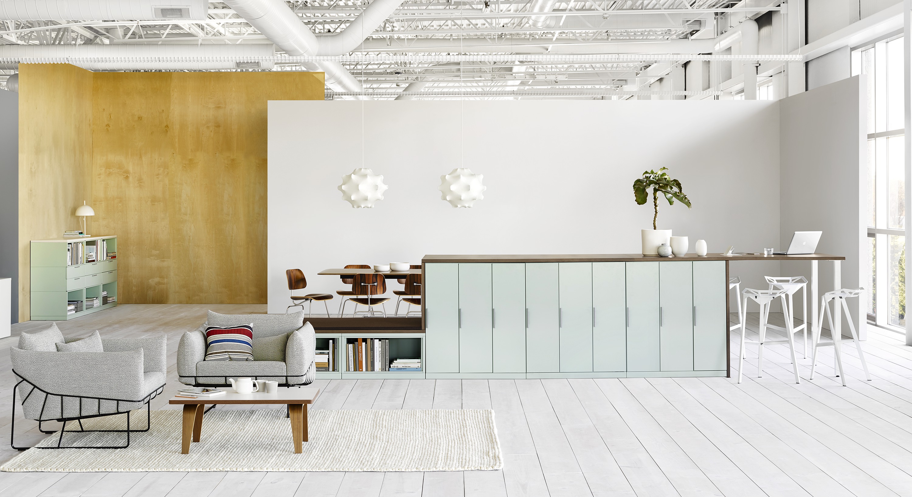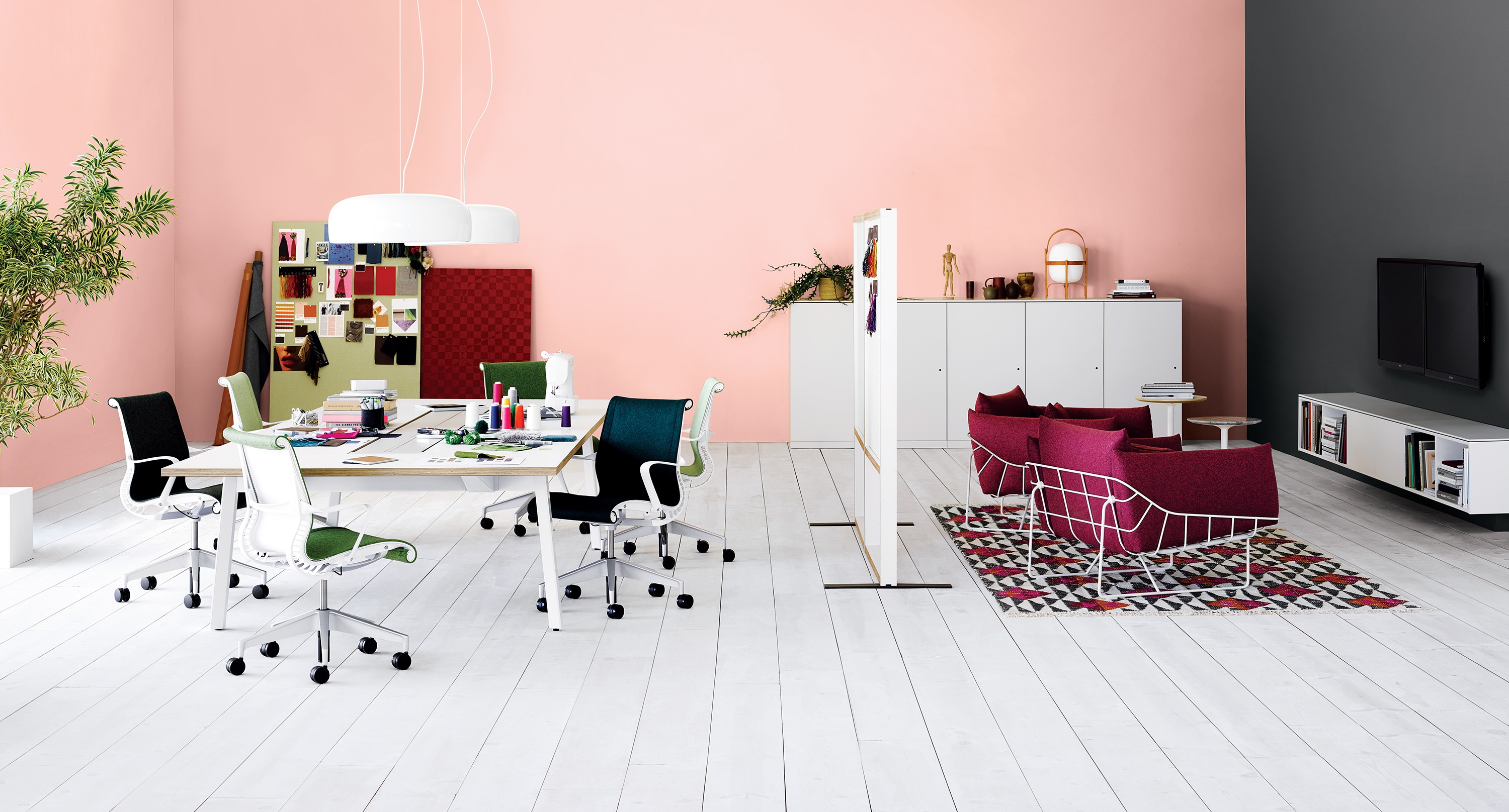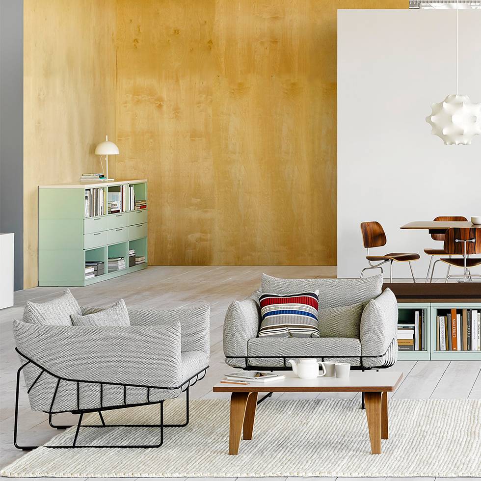 从视觉上说,柔软和体积包含在一个正式的框架,线框沙发组例证了一个反复出现的主题山姆赫克特和金科林:对比紧张。该设计的外部结构是由钢丝形成的——这是赫尔曼米勒经典设计中长期使用的材料,因为其强度和耐久性。车架内的坐垫是轮廓分明的,赫尔曼米勒(Herman Miller)最初为医疗行业开发的一种悬架技术让坐垫更加舒适。腰椎和抱枕是祭品的全部。轻便,大小不一,多用途的座椅可以轻松地变换位置,以满足不断变化的空间需求,以及在其中工作和放松的人。海克特和科林的设计体现了我们今天的生活方式。选择包括白色或黑色框架与多个室内装潢选择在两人和三人座位的沙发