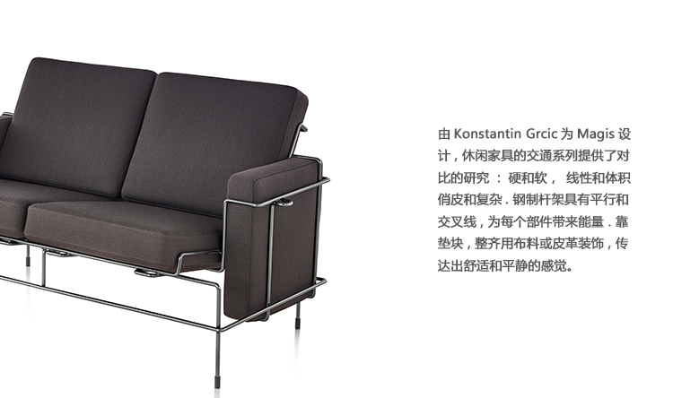 由Konstantin Grcic为Magis设计,休闲家具的交通系列提供了对比的研究:硬和软,线性和体积,俏皮和复杂。 钢制杆架具有平行和交叉线,为每个部件带来能量。 靠垫块,整齐地用布料或皮革装饰,传达出舒适和平静的感觉。