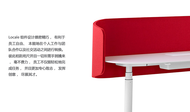 Locale能帮助机构利用和管理开放式的办公空间,通过该系统,员工能在坐姿或站姿,或是在团队工作与单独工作状态之间,实现无缝转换。Locale消除了视觉和实体障碍,并将整个开放式工作空间的建筑格局压缩成紧密联接的相邻结构,有助于员工更得心应手地工作,并保持彼此沟通顺畅。