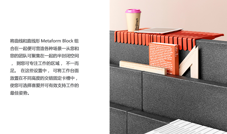 选择Metaform色彩丰富的系列多用途附加组件和工作台面,可创造出无限可能的工作空间。