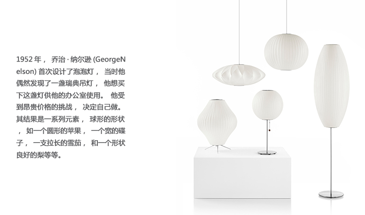 雪茄莲花落地灯将这个经典的乔治·尼尔森设计带到地板上。纳尔逊雪茄莲花落地灯具有细长的球形灯罩和稳定的钢制底座,为任何室内带来雕塑效果。它有三种尺寸,并配有一个9英尺的插件线。1952年,乔治·纳尔逊第一次设计泡泡灯时,他偶然发现了一盏瑞典吊灯,他想买这盏灯到他的办公室。他受到了昂贵的价格的挑战,决定自己做。结果形成了一系列基本的球形形状,比如圆形的苹果、宽碟子、细长的雪茄、以及形状优美的梨等。