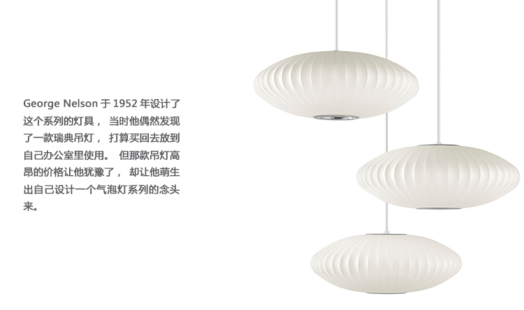 Nelson气泡灯是一组形形色色、具有球状轮廓的灯具,能散发出均匀柔和的光线。Nelson Saucer Bubble Pendant杯托型气泡吊灯宽大的形状及其不锈钢的下层结构能给人带来柔和流动的线条感,造型可爱,光线宜人,适合任何室内风格。本款吊灯有小号、中号、大号和加大号几种不同规格。George Nelson于1952年设计了这个系列的灯具,当时他偶然发现了一款瑞典吊灯,打算买回去放到自己办公室里使用。但那款吊灯高昂的价格让他犹豫了,却让他萌生出自己设计一个气泡灯系列的念头来。