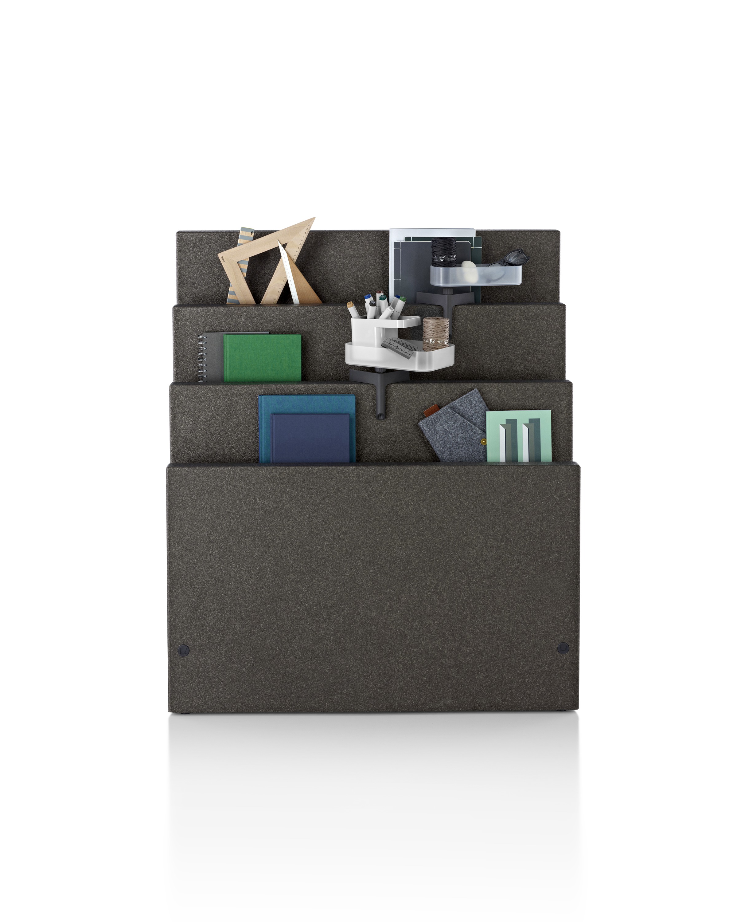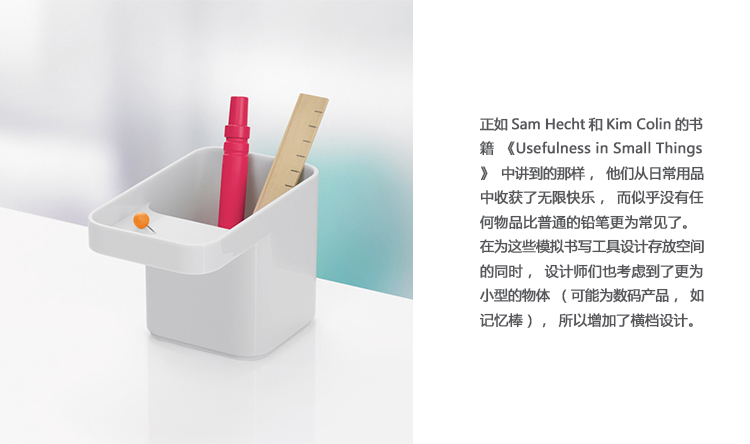 正如Sam Hecht和Kim Colin的书籍《Usefulness in Small Things》中讲到的那样,他们从日常用品中收获了无限快乐,而似乎没有任何物品比普通的铅笔更为常见了。在为这些模拟书写工具设计存放空间的同时,设计师们也考虑到了更为小型的物体(可能为数码产品,如记忆棒),所以增加了横档设计。