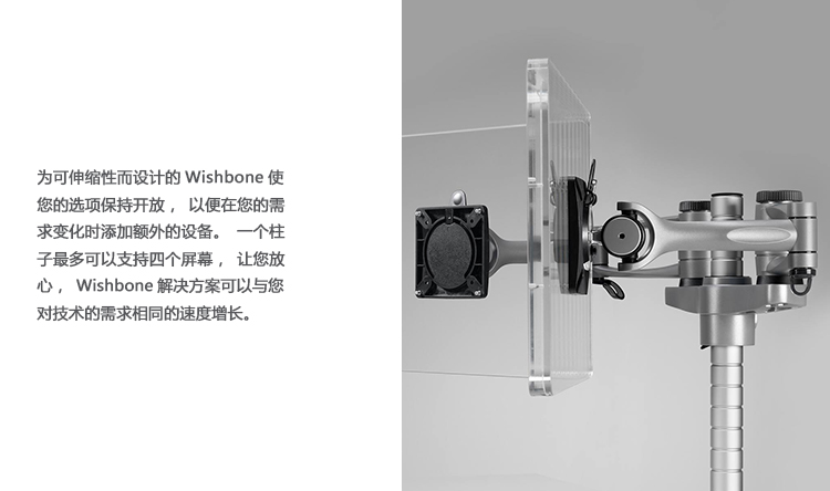Wishbone系列的精致设计释放了工作台面上的空间,同时允许您将屏幕定位在适当的距离,以缓解颈部和眼睛疲劳。