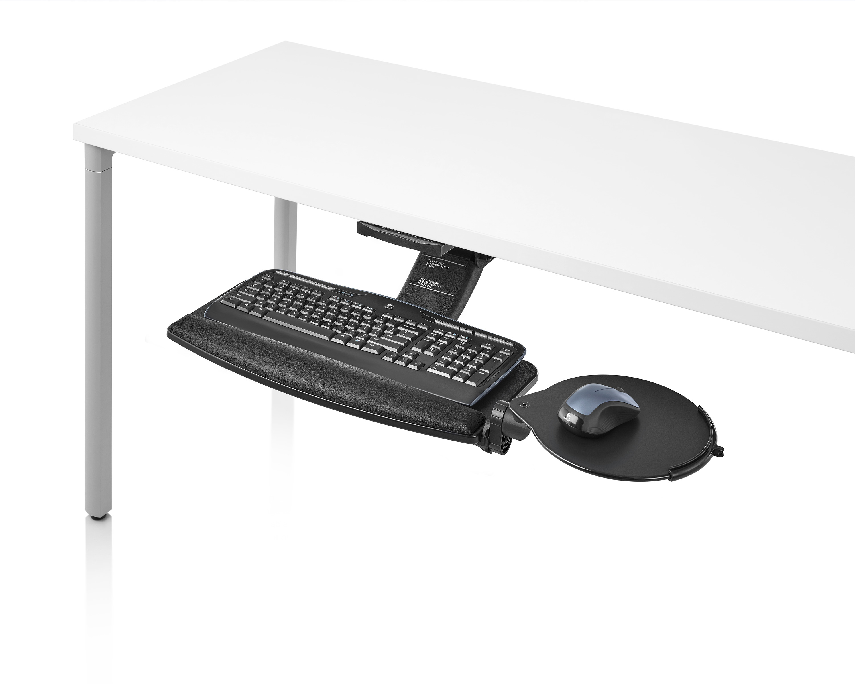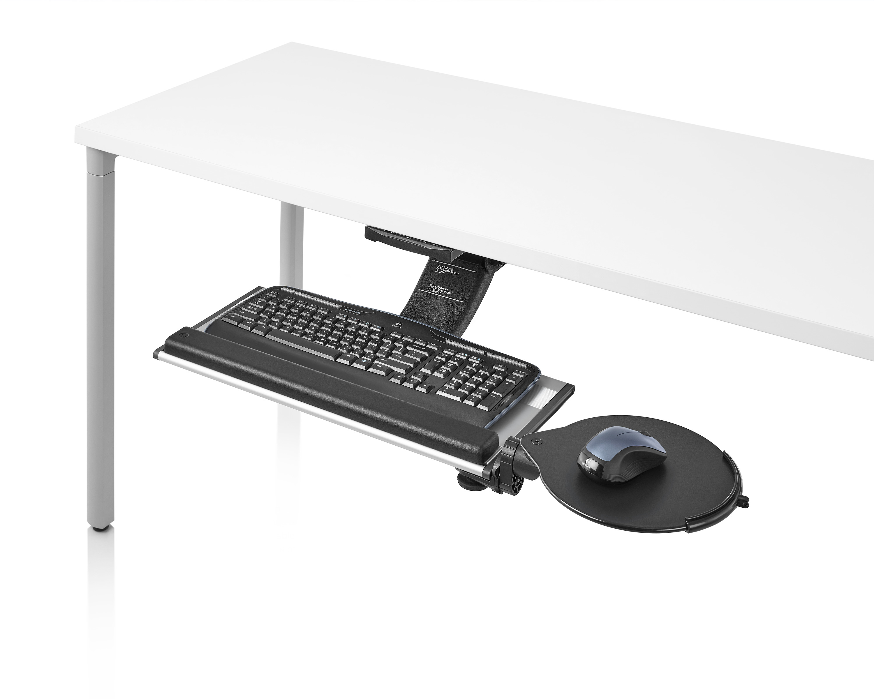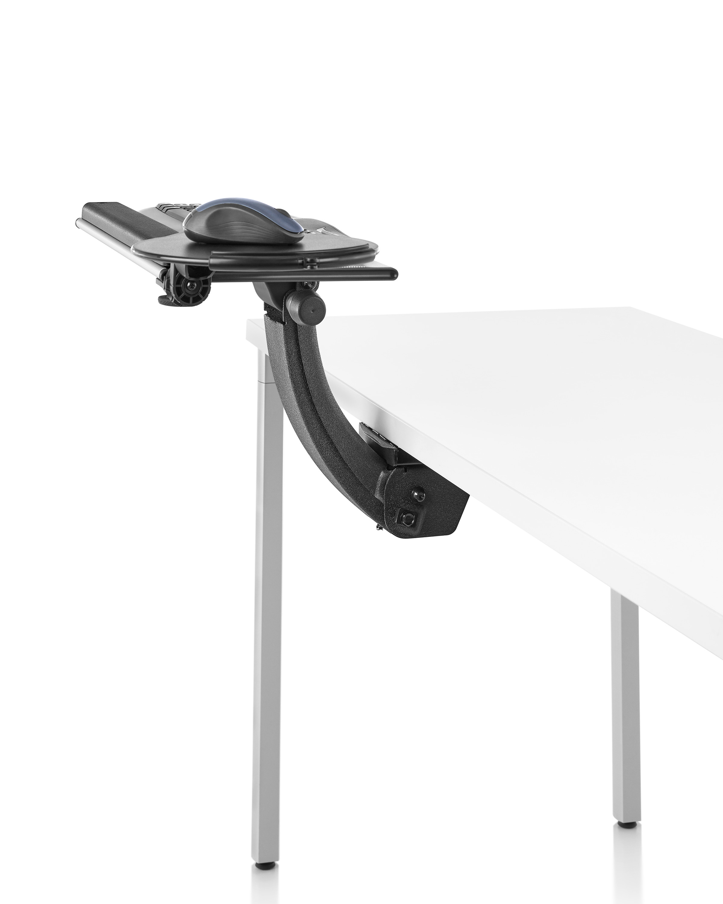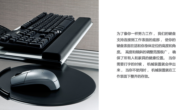 为了像你一样努力工作,我们的键盘支持连接到工作表面的底部,使你的键盘表面在适和你身体定位的高度和角度。高度和倾斜的调整范围很广,确保了所有人和家具的健康位置。当你需要打字的时候,机械装置就会伸出来,当你不使用时,机械装置就在工作表面下整齐的储存
