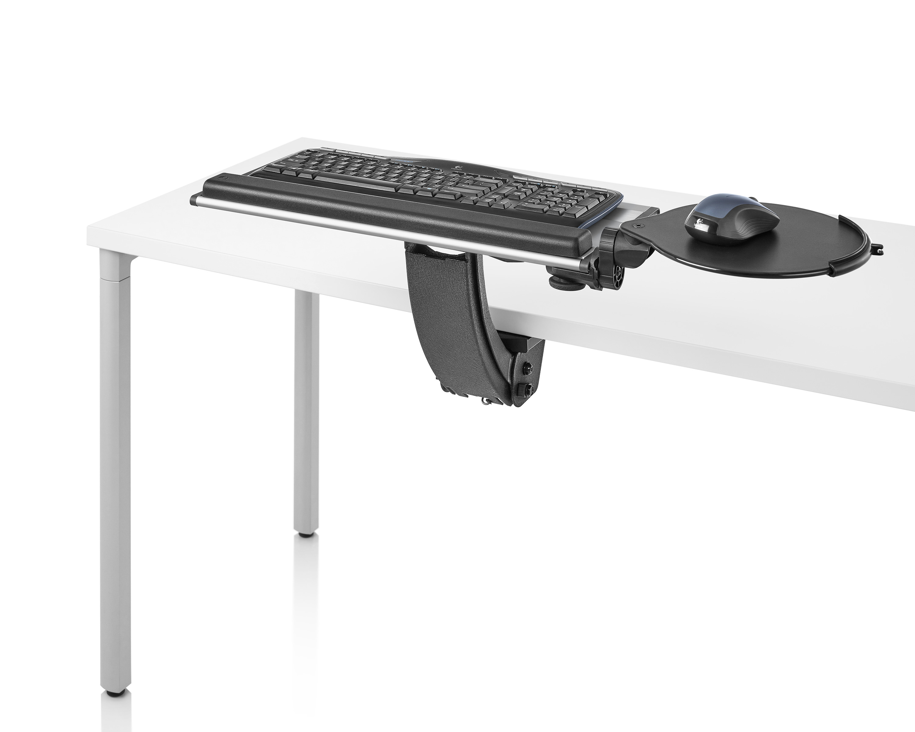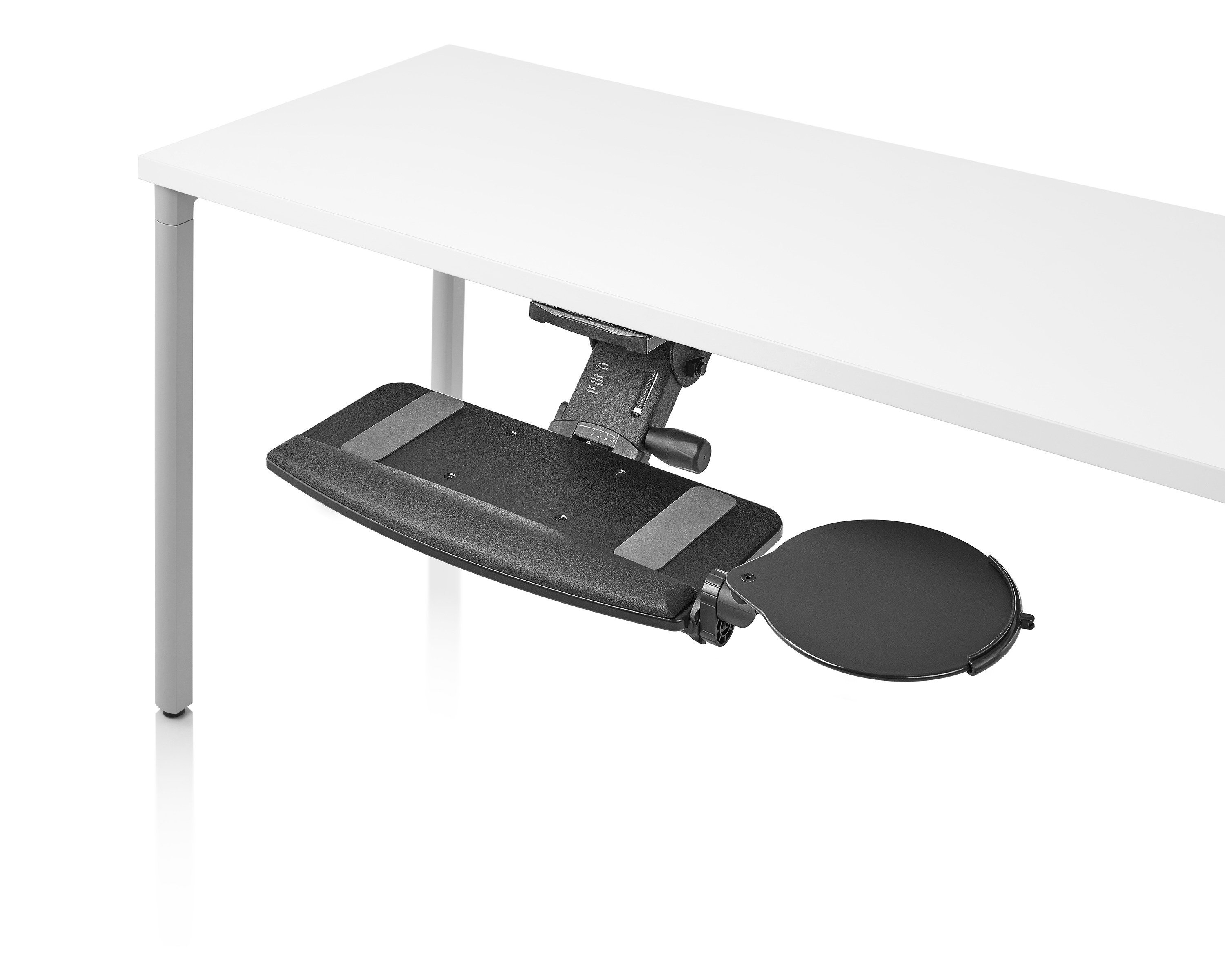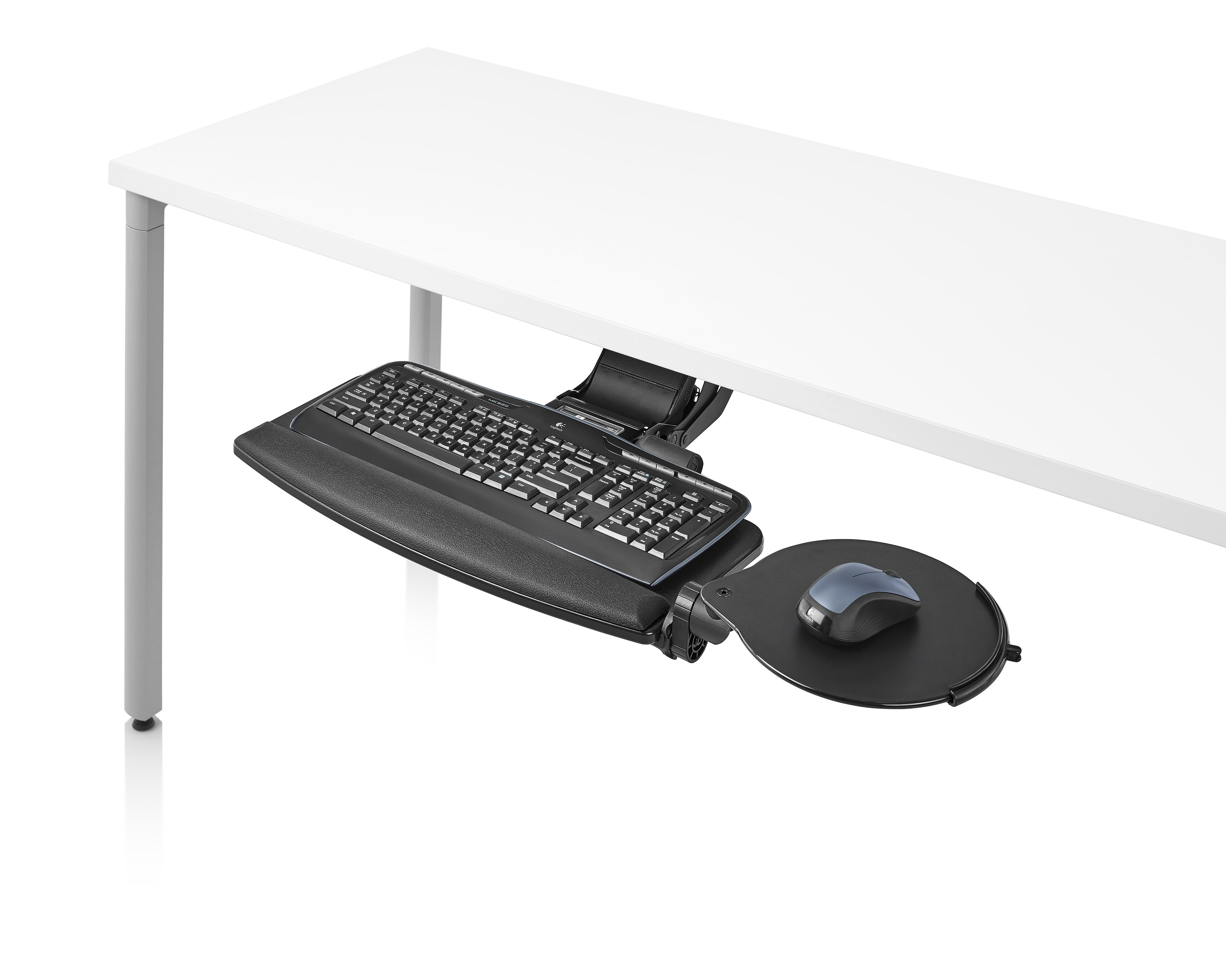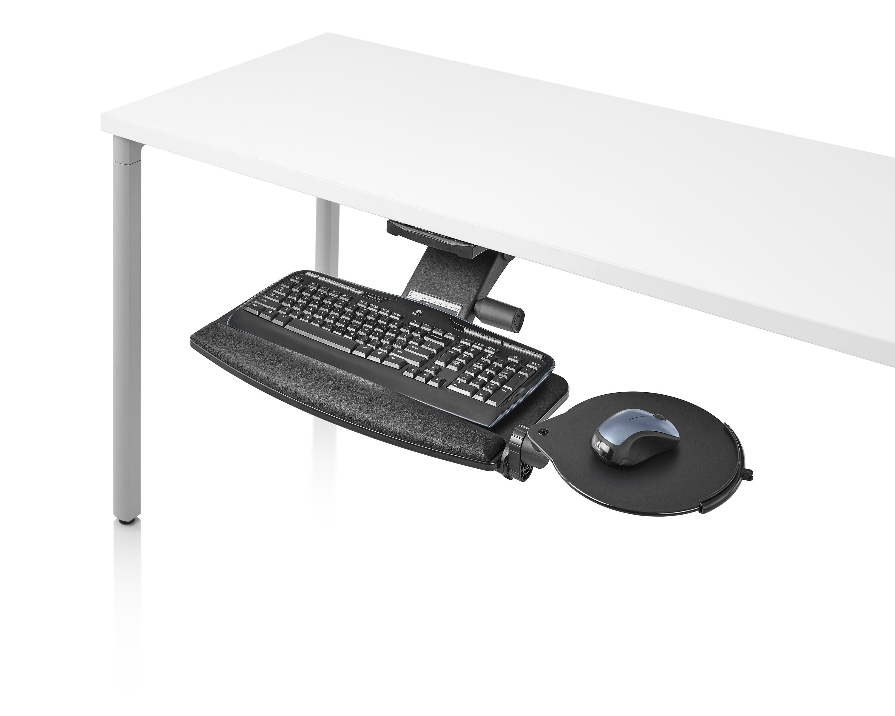 为了像你一样努力工作,我们的键盘支持连接到工作表面的底部,使你的键盘表面在适和你身体定位的高度和角度。高度和倾斜的调整范围很广,确保了所有人和家具的健康位置。当你需要打字的时候,机械装置就会伸出来,当你不使用时,机械装置就在工作表面下整齐的储存