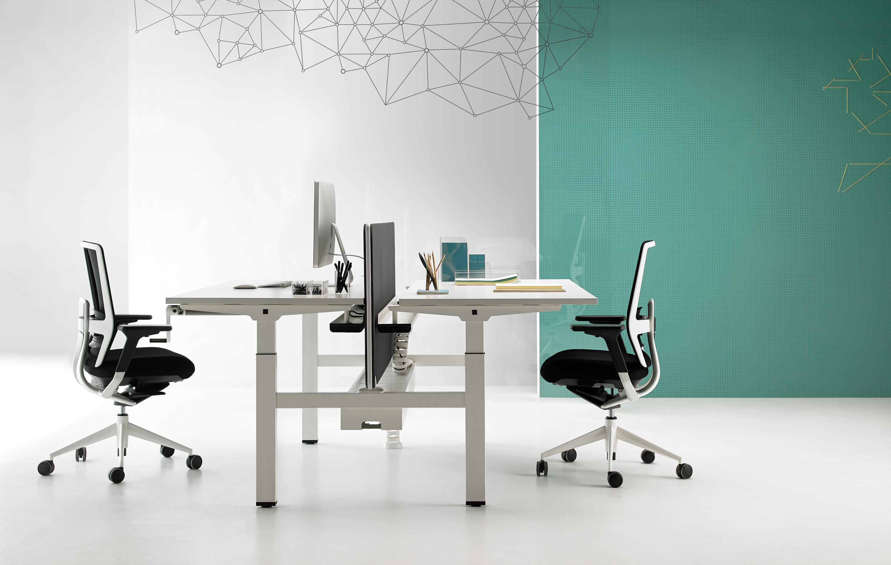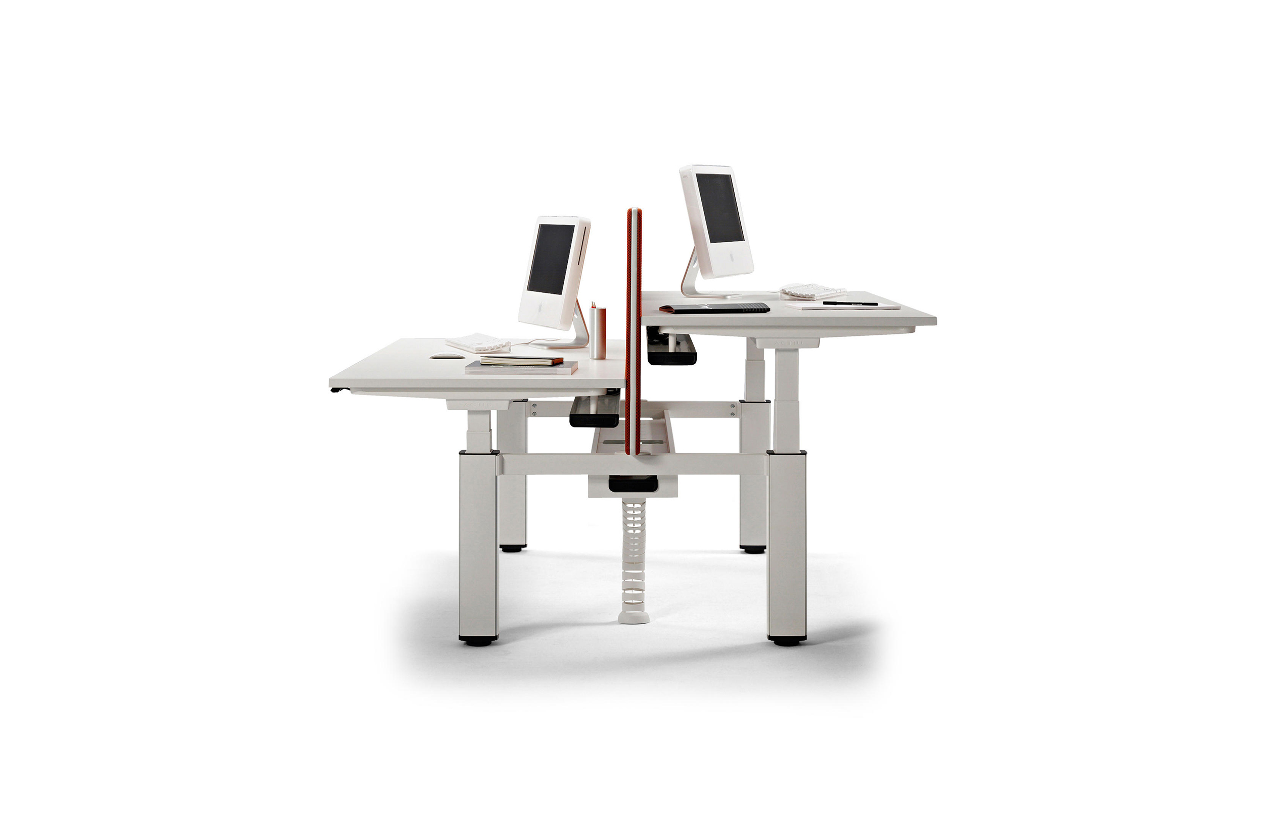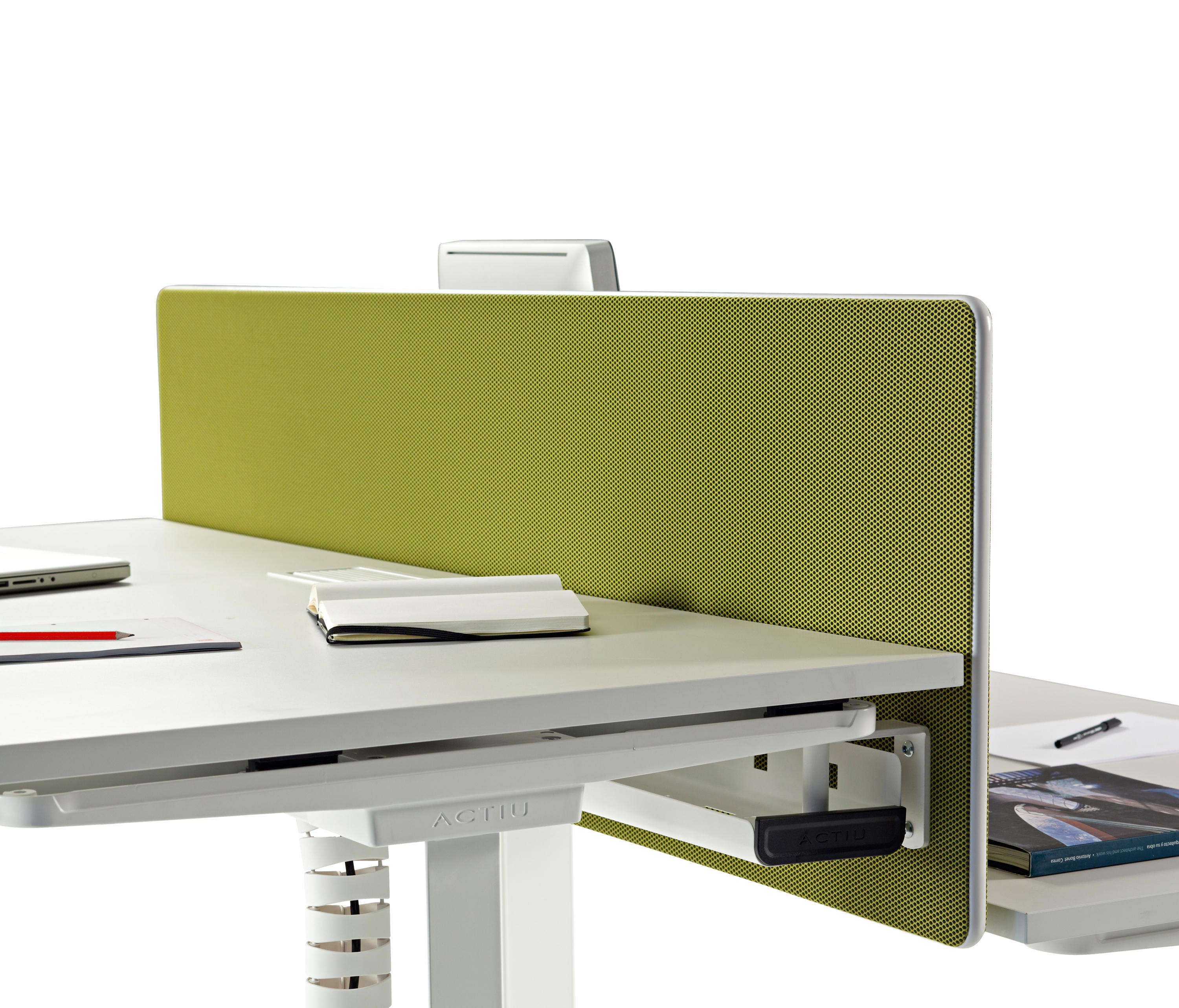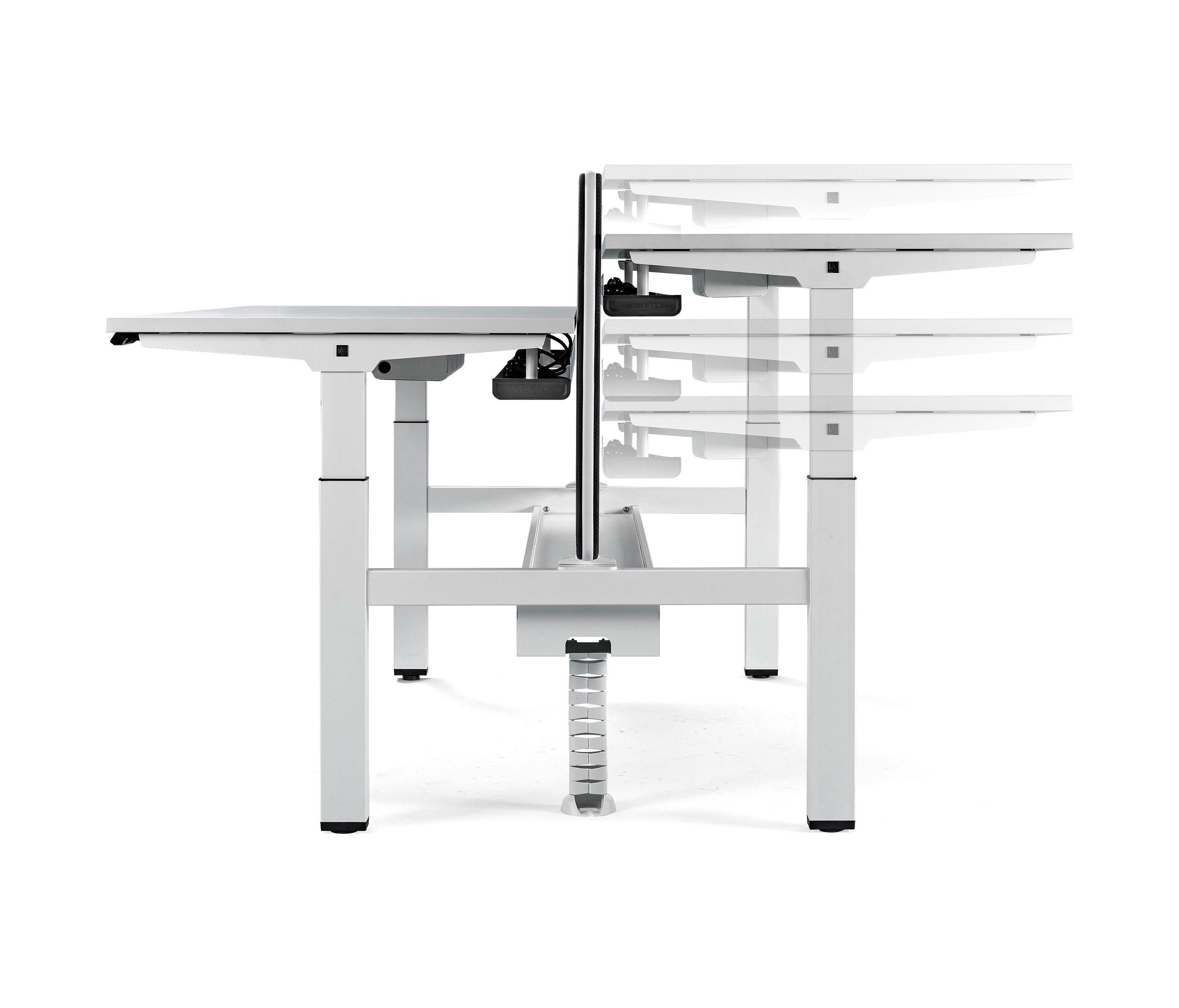 双人桌上配备了中央托盘式电缆桥架,软垫隔板和桌面上的电脑屏幕有20 至 40毫米的距离,有良好的隔音性能