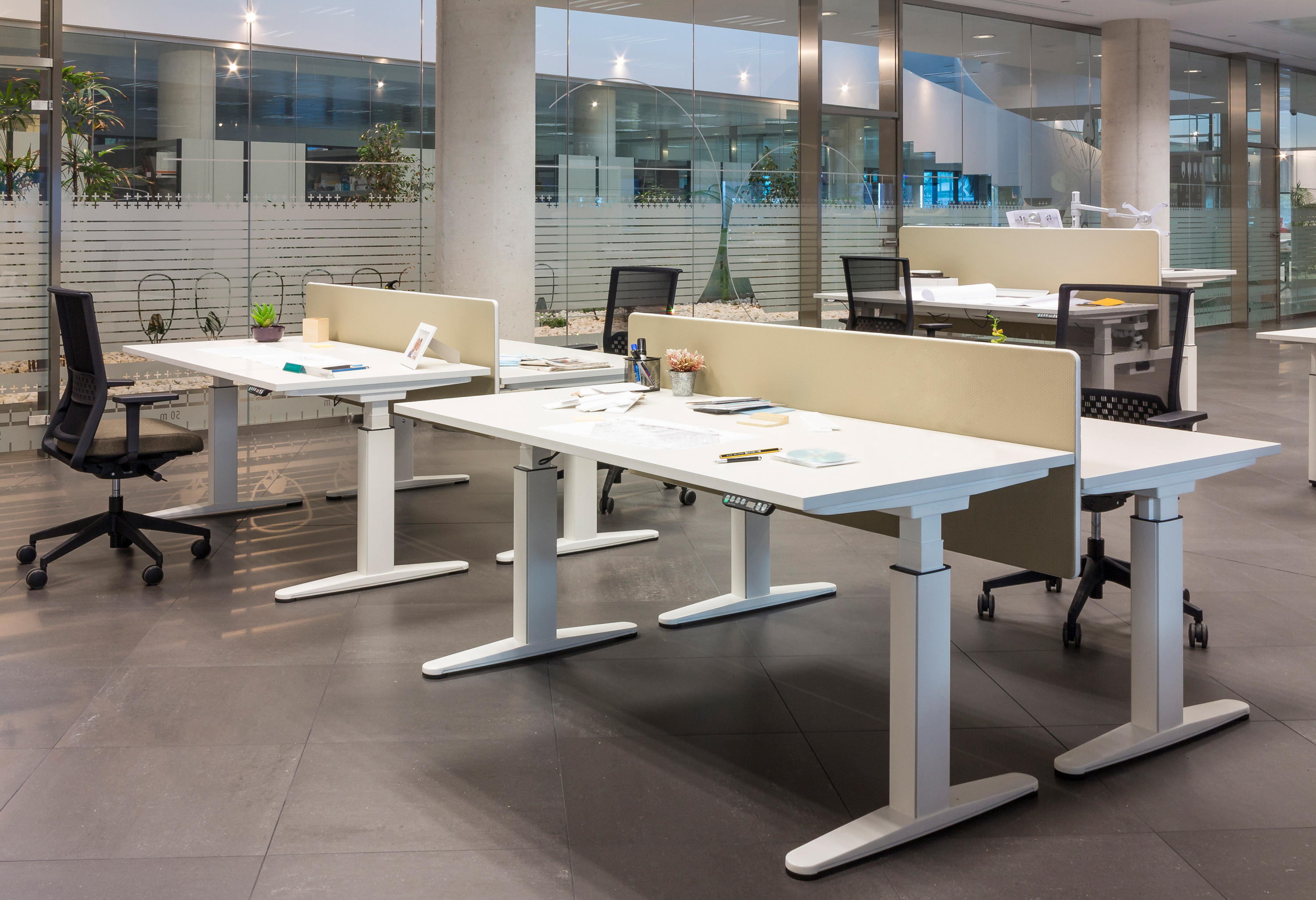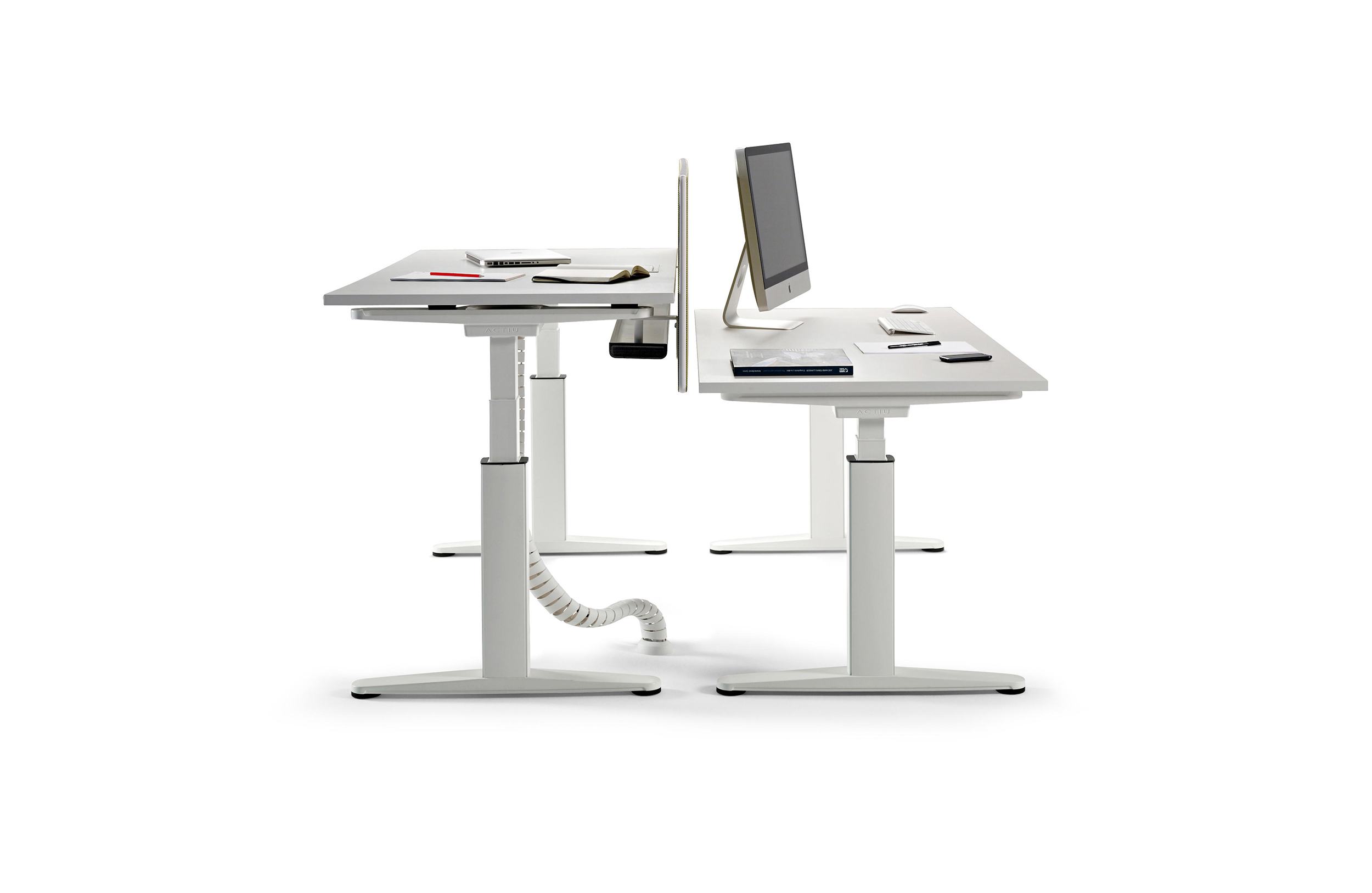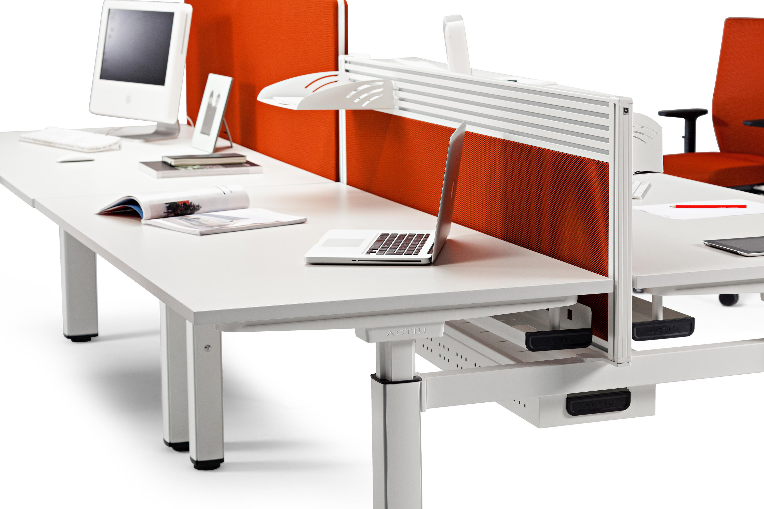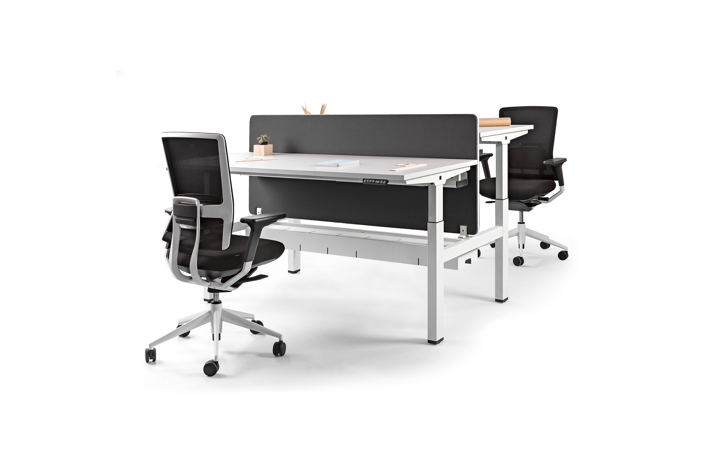 双人桌上配备了中央托盘式电缆桥架,软垫隔板和桌面上的电脑屏幕有20 至 40毫米的距离,有良好的隔音性能