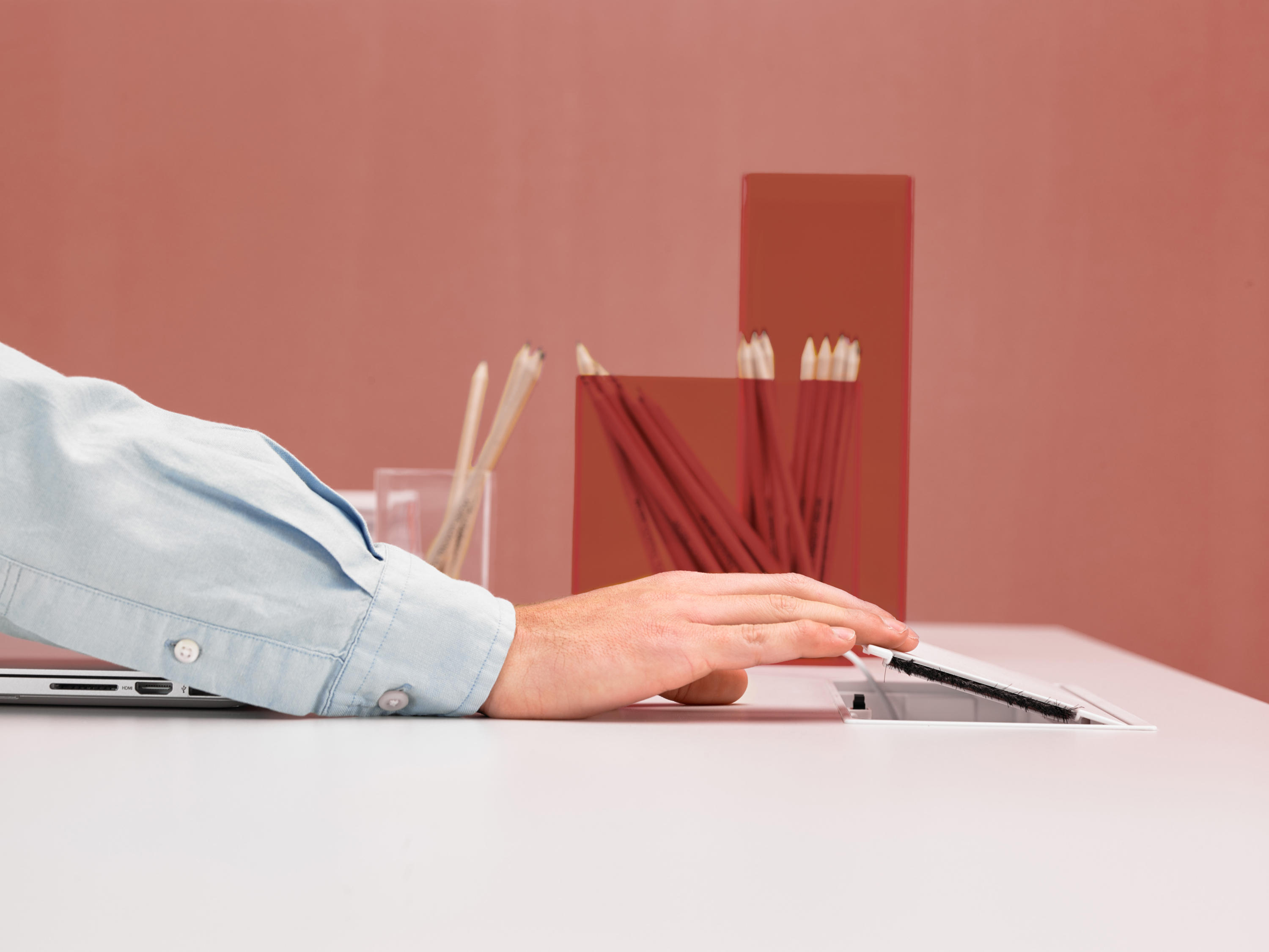双人桌上配备了中央托盘式电缆桥架,内置聚苯乙烯材质的可伸缩电缆