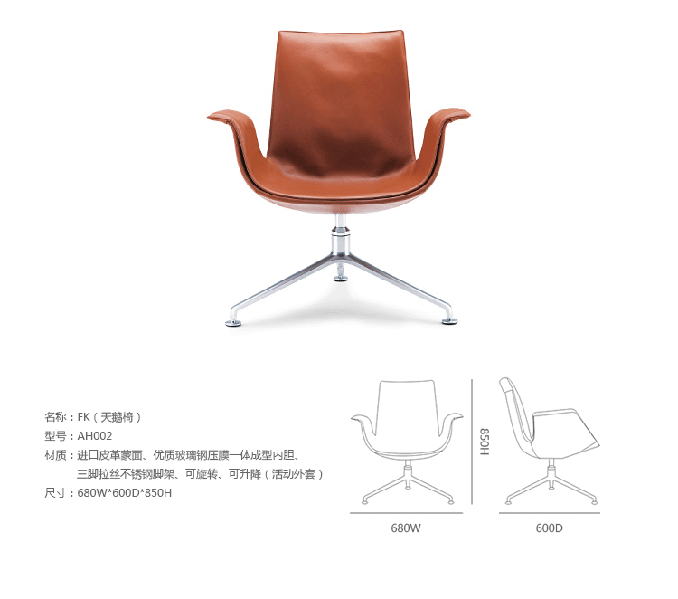 FK(天鹅椅)由北欧著名设计师Fabricius 和 Kastholm设计的,著名家具公司walter knoll出品,是设计历史的经典作品。在六十年代,斗式座椅是当时的一种标志,FK(天鹅椅),以其独特的形式,清晰的轮廓,完美的线条,堪称设计经典。铲斗造型的三星脚架、 体积大和亮度度,都是FK(天鹅椅)引人注目的标志。在1969年FK(天鹅椅)荣获了《Gute Form》(好形状)奖最佳风采奖,并成为了极简主义设计中的一个典范,流行至今。