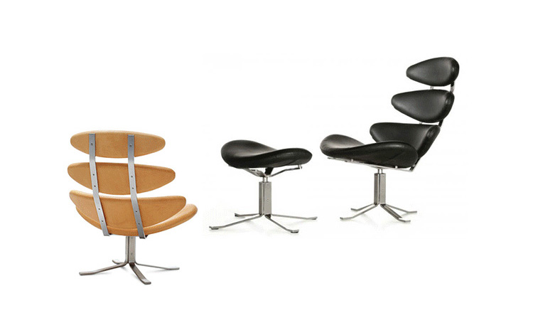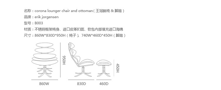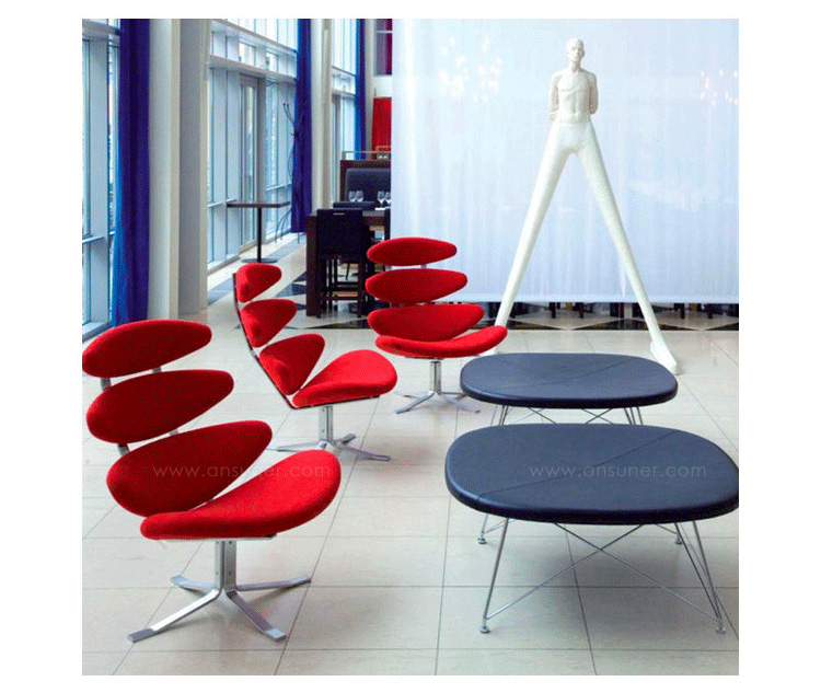 Poul M. Volther 于1964年的设计的王冠躺椅家具系列,是Poul M. Volther最知名的现代家具设计作品,此系列包括Corona Lounger Chair(王冠躺椅)、Corona Lounger Ottoman (王冠休闲脚踏)及其组合Corona Lounger Chair and Ottoman(王冠躺椅&脚踏)。历经40余年的今天,其作品在纷繁现代家具设计中仍占有一席之地。椅子充满了雕塑感,斯堪德维亚风格的简洁外形和舒适的坐感都是这张椅子成为创世之作的原因,四个椭圆形组成一张独特的椅子,无论摆放在哪,都令人过目不忘。此系列家具采用高强度钢材制作,表面电镀处理,外面为真皮或布艺制作,可360度旋转,不可后仰。适用范围广,酒店、会所、高档餐厅、夜总会、别墅等。