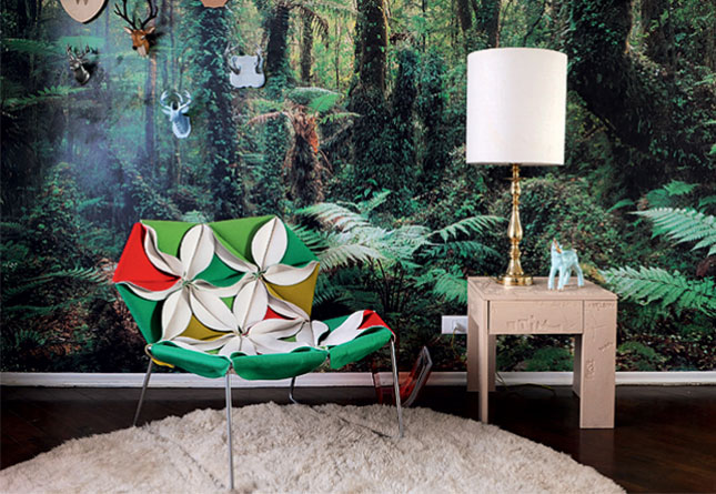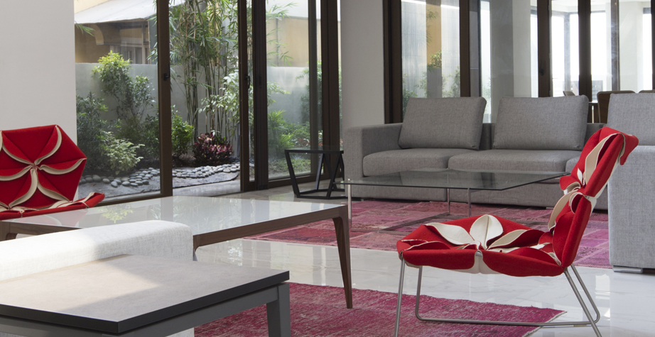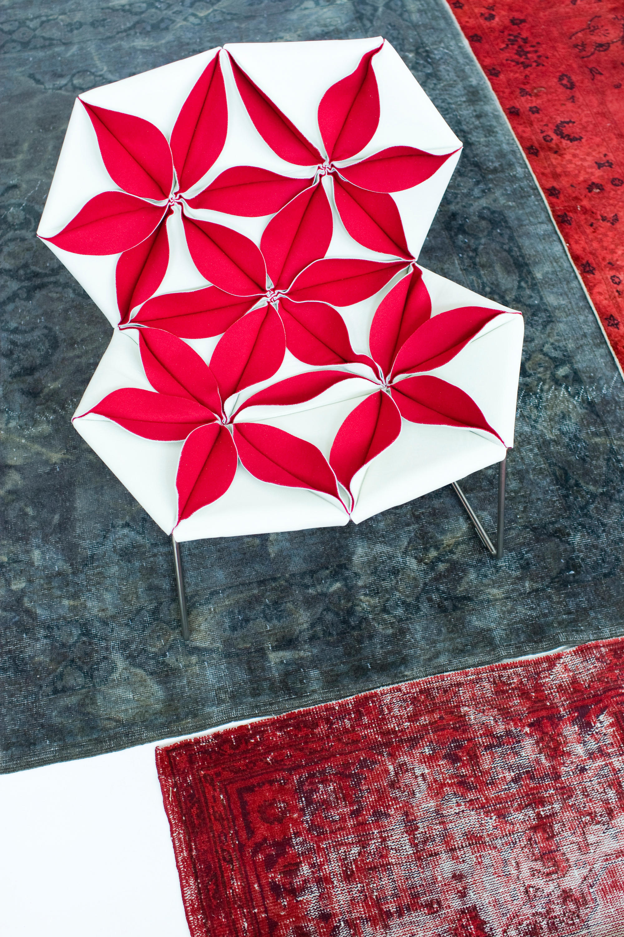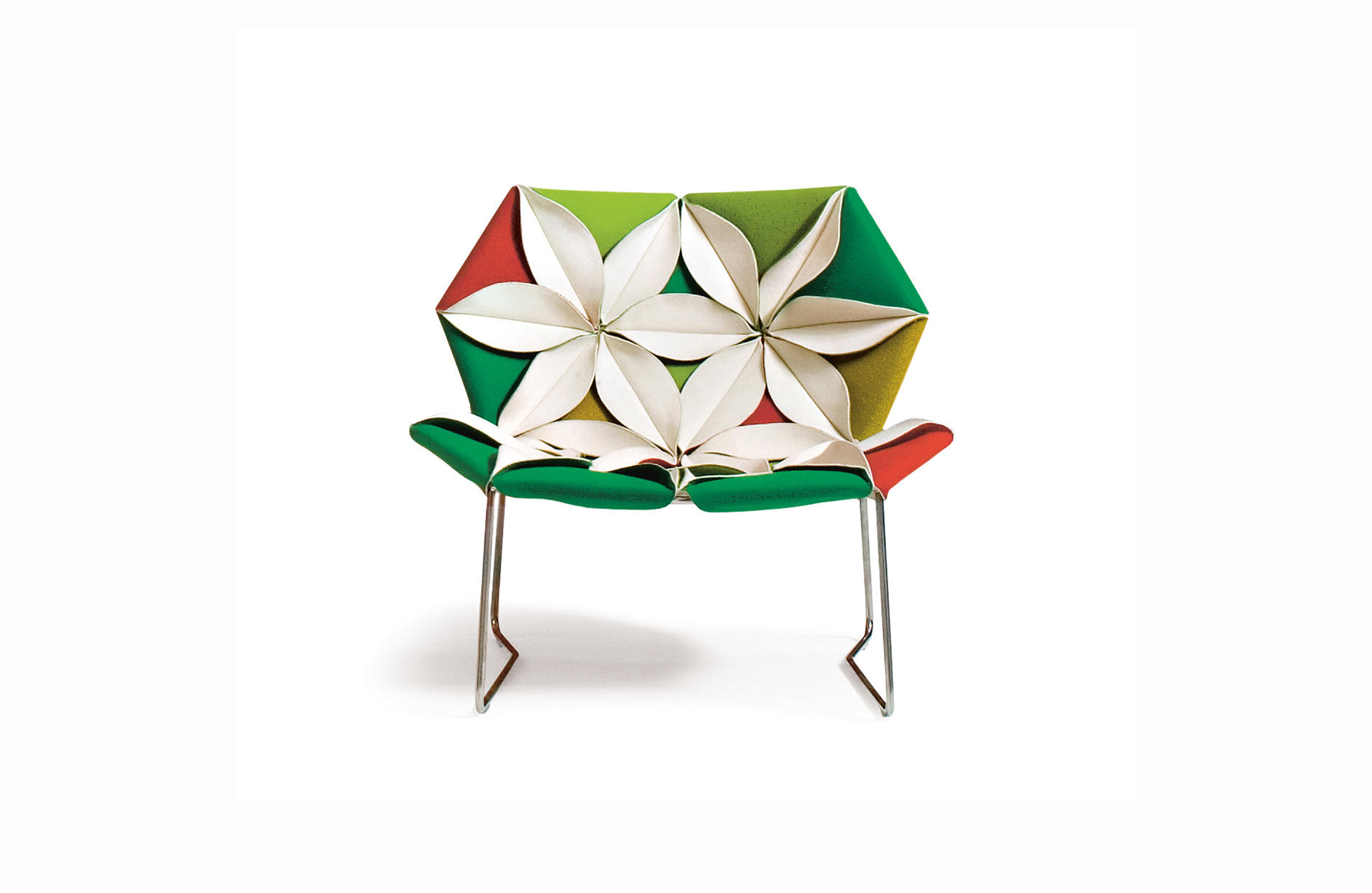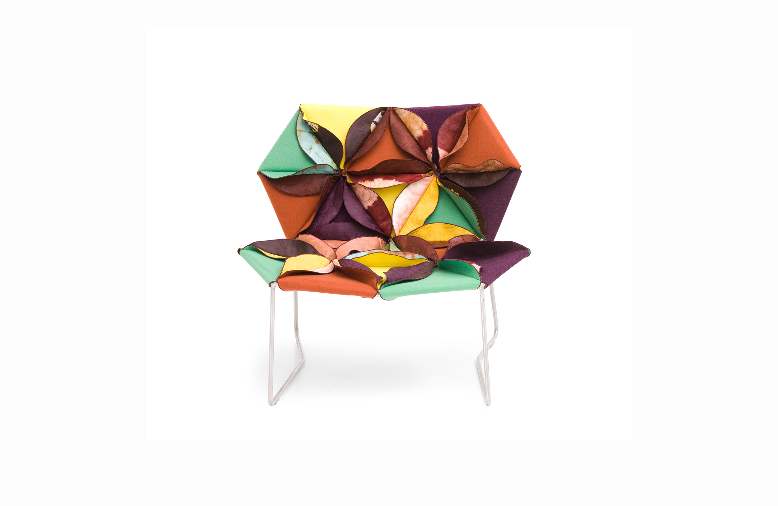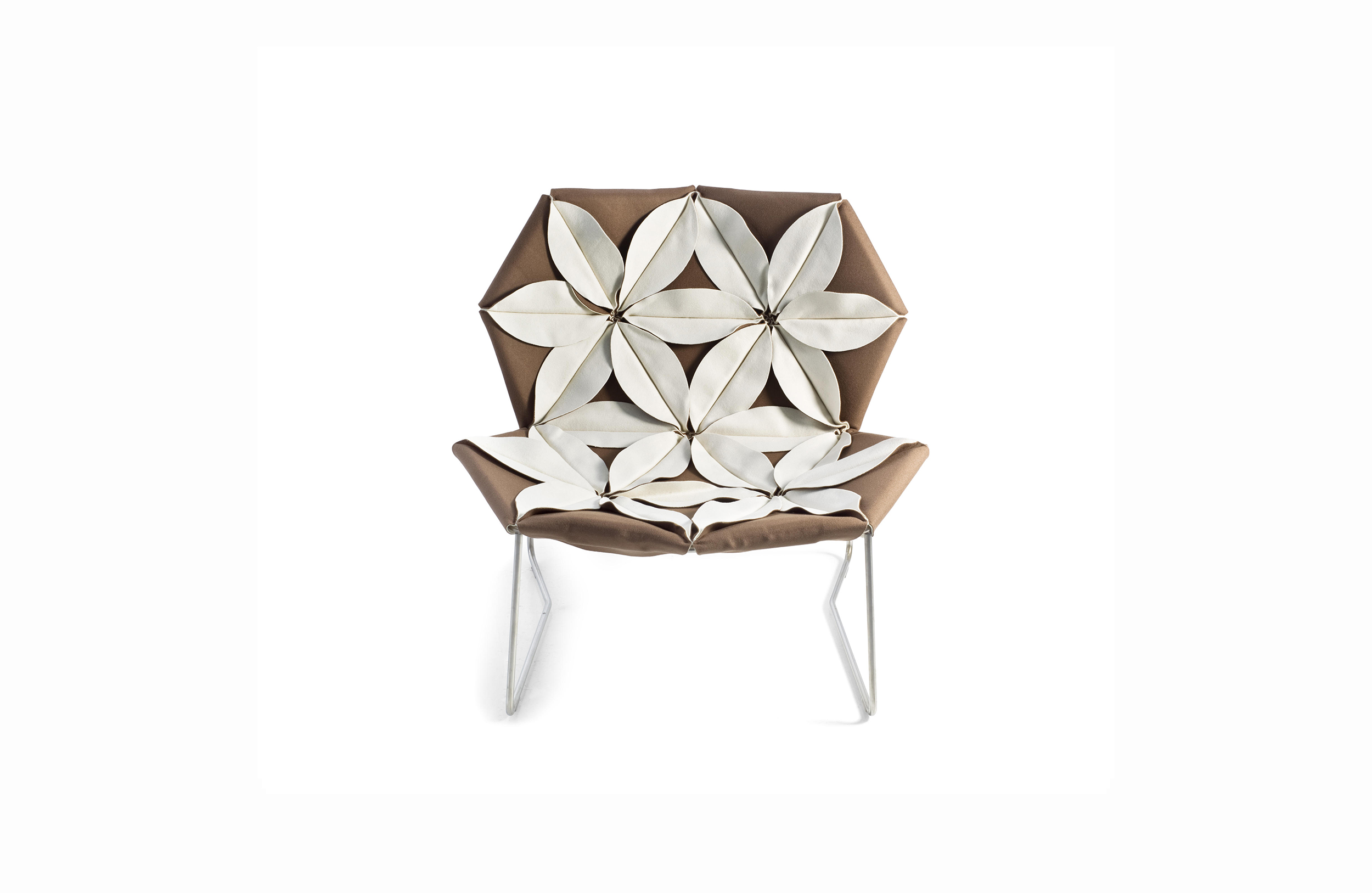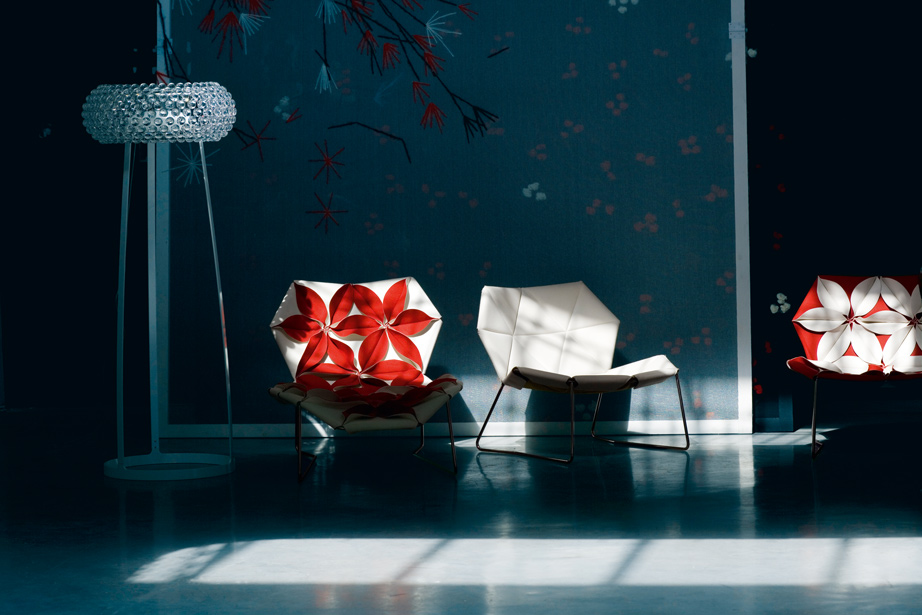 Antibodi 是 Patricia Urquiola 從一個花朵盛開的概念所創作的椅子,蜂窩式三角形花瓣串連縫製而成花朵散播在椅面上,片片花瓣的外型和多層次的材料,衍伸出豐富的圖案。