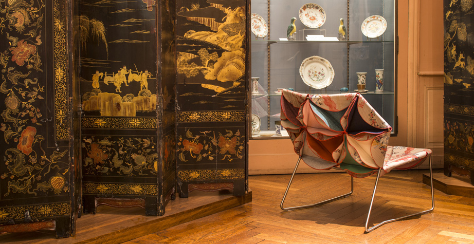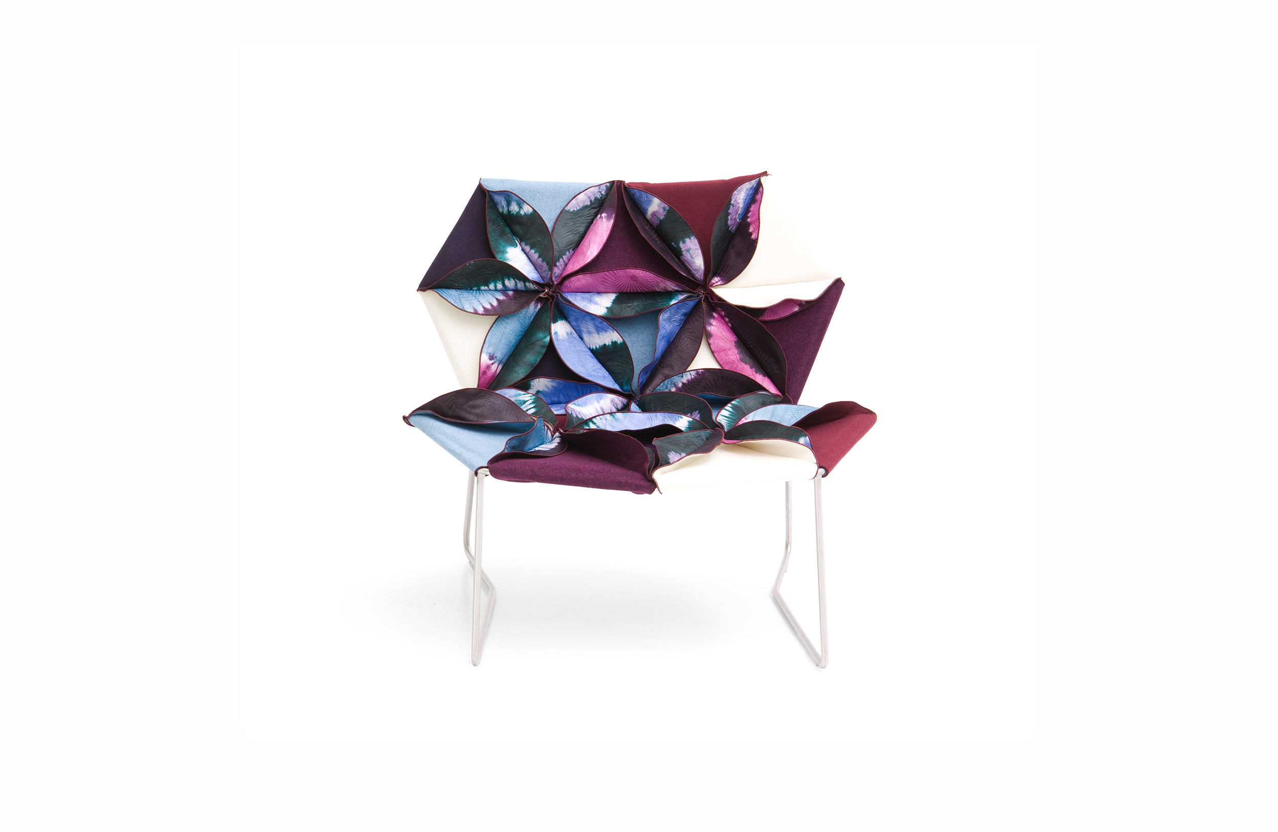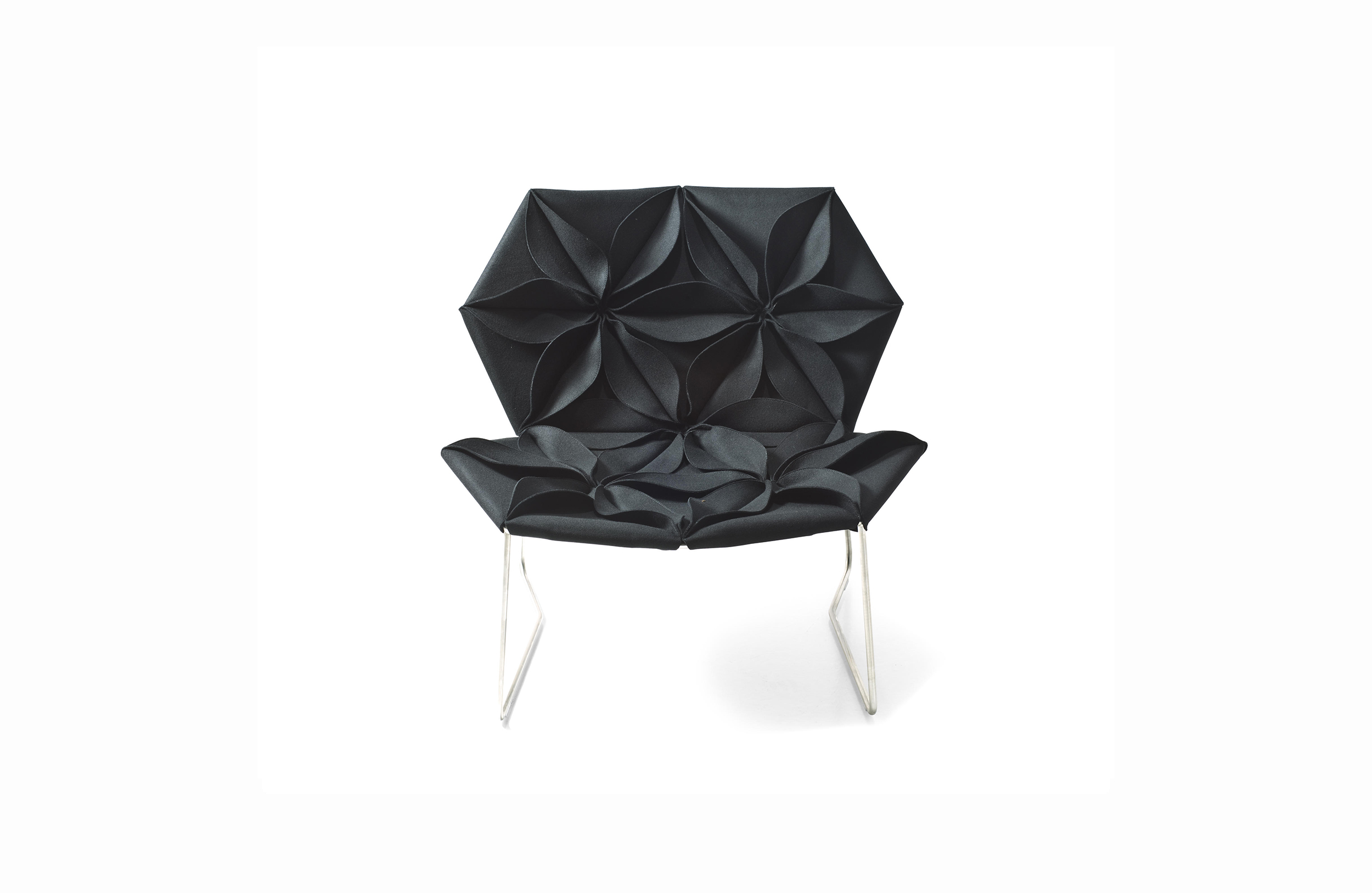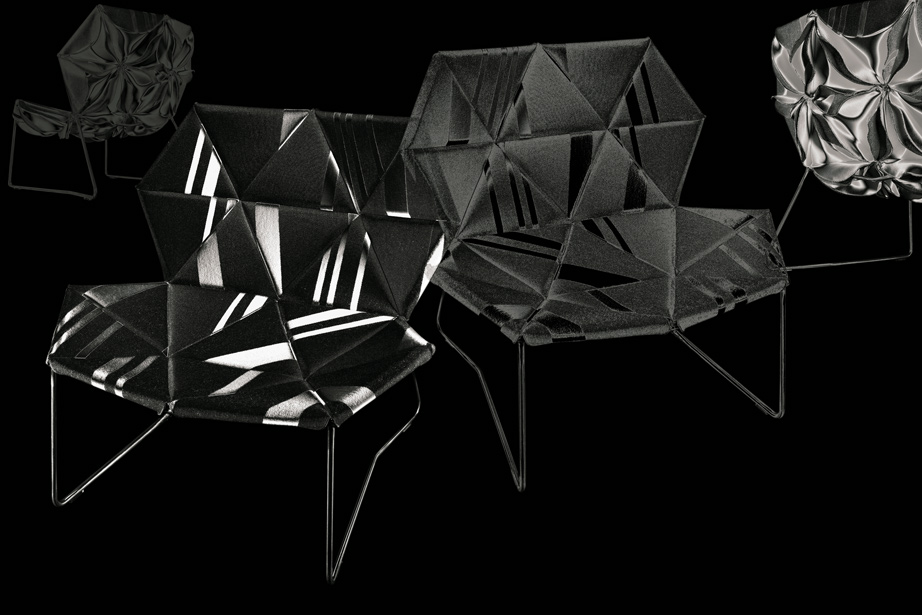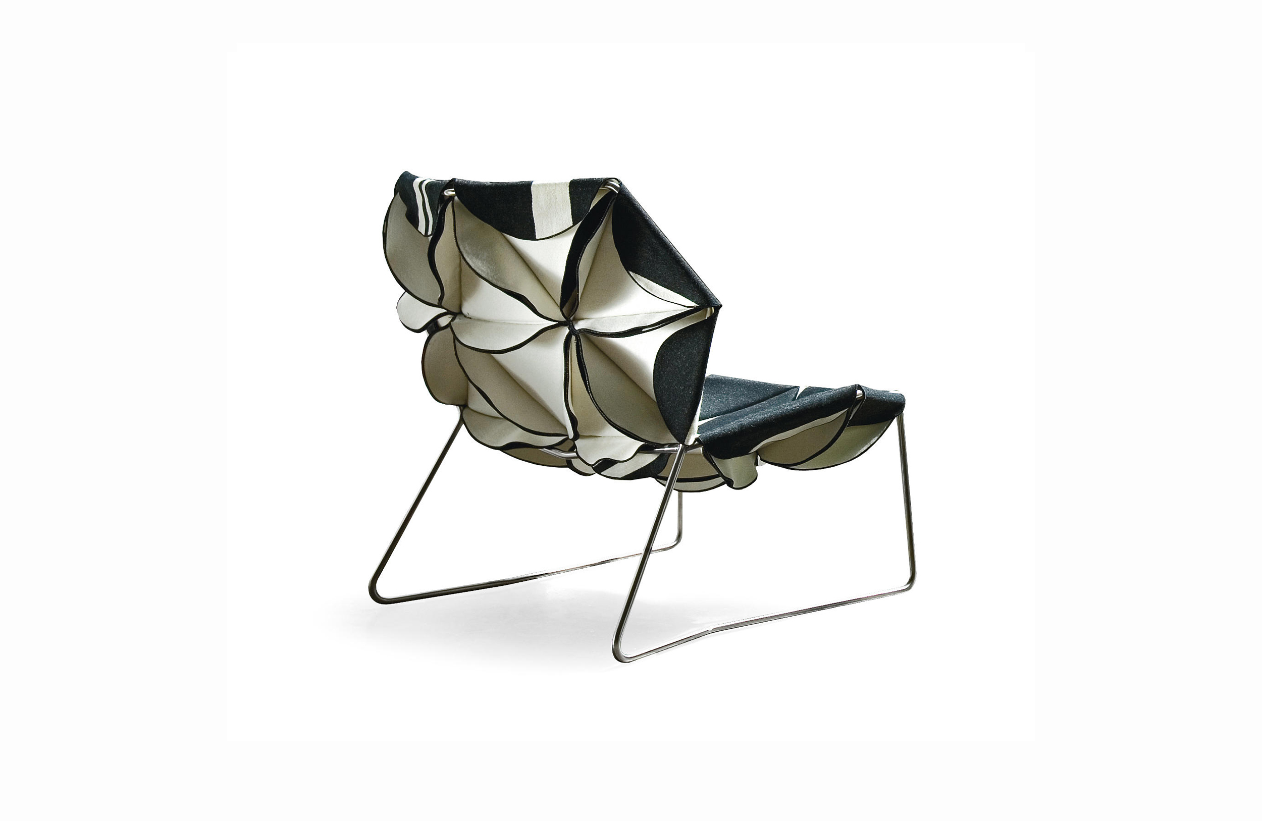 這是一件具有很高裁剪技術的作品,透過活潑的色彩和革新的材料,結合了時尚與設計。雙面可以用黑色和白色,或一個自然的色調搭配出如萬花筒般的錯落有致,極具表現張力的椅子。