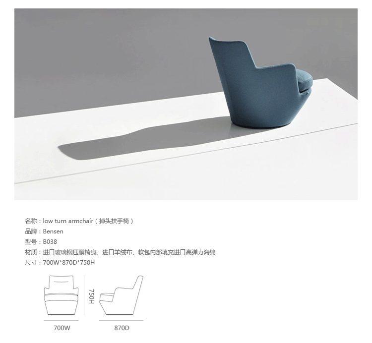Low Turn Armchair(掉头扶手椅)是Niels Bendtsen设计的低背转椅,可360度旋转。简洁利落的几何线条赋予Low Turn Armchair雅致的摩登感,进口玻璃钢压膜椅身、进口羊绒布、软包内部填充进口高弹力海绵,提供最佳的舒适度。椅身织布可拆卸,方便清洗。