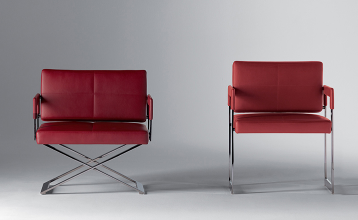 "Leather皮革椅系列家具线条干净简明,“X”交叉造型或者“H”造型脚架支撑着坐垫,新颖独特,由Jean-Marie Massaud设计。它采用外露的金属架,有三种不同的做工,座椅为聚氨酯泡沫材料,靠背较低,坐垫宽敞。有两种面料可供选择:天然皮革和纺织面料。两种款式都有皮革和染色纺织面料的扶手和同款的靠枕。沙发椅的造型形式严谨,它的特点和个性特征与Poltrona Frau现代室内家居的设计非常统一协调。