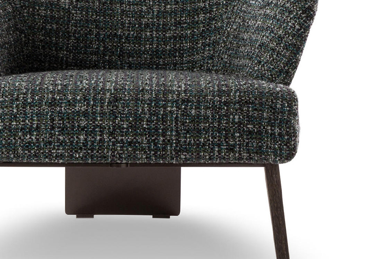 Creed “Lounge”沙发后方的地面支撑采用做工考究的弯曲金属架并搭配浅铜色亮光漆,前方支撑腿则为米灰色的鲍迪豆实木材质。支撑腿的上下方均采用精致的金属部件并搭配浅铜色亮面漆,用与众不同的细节设计来展现非同寻常的高超工艺。