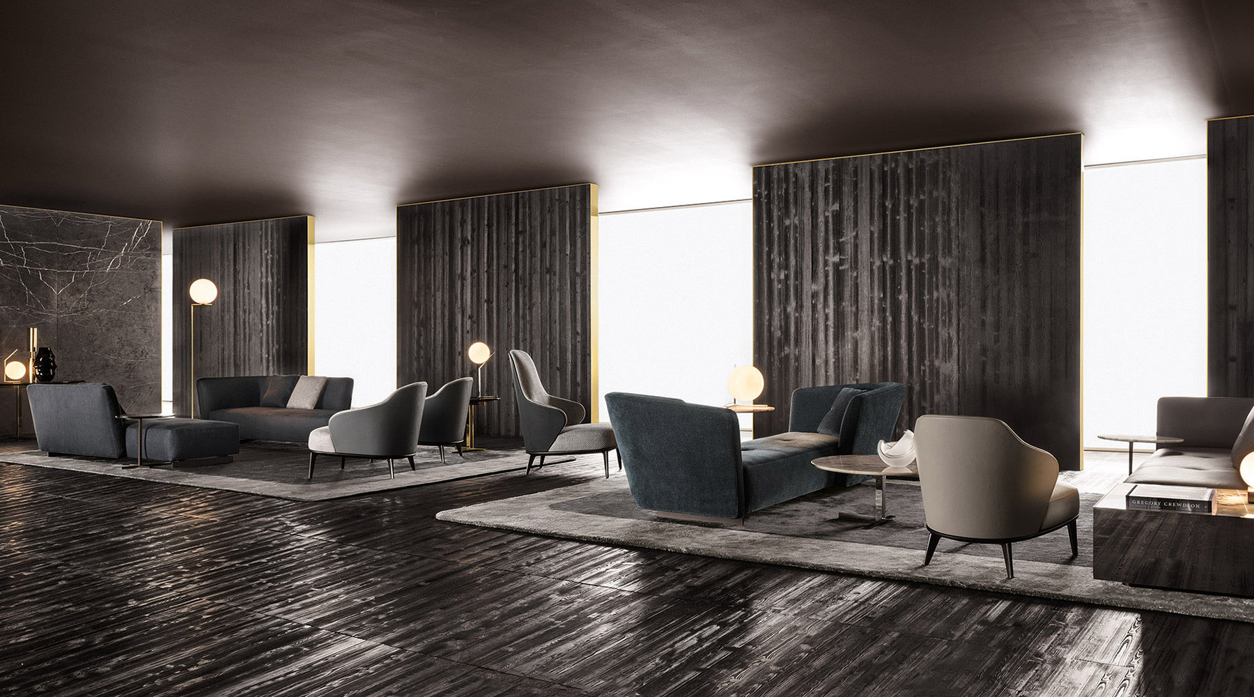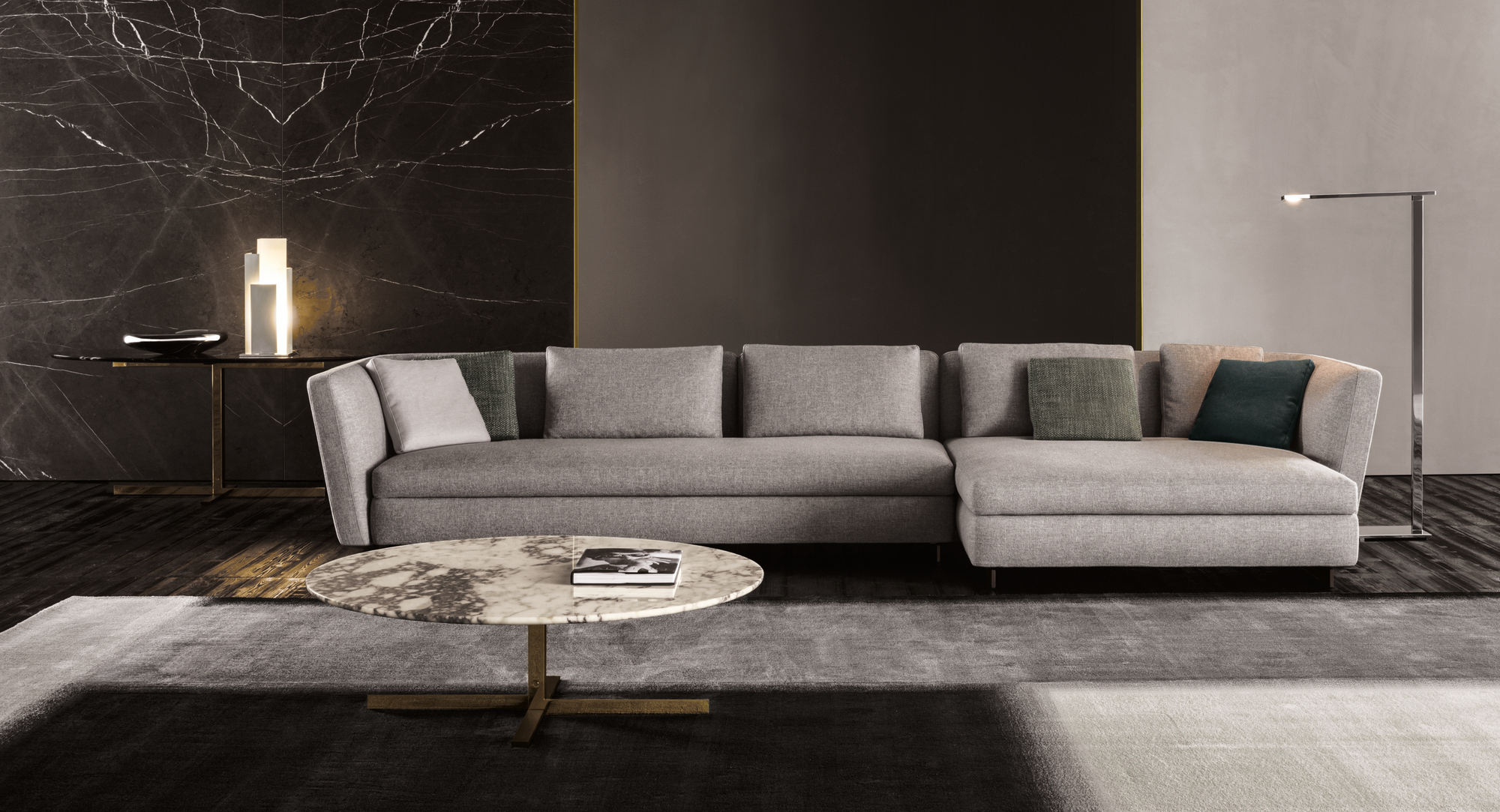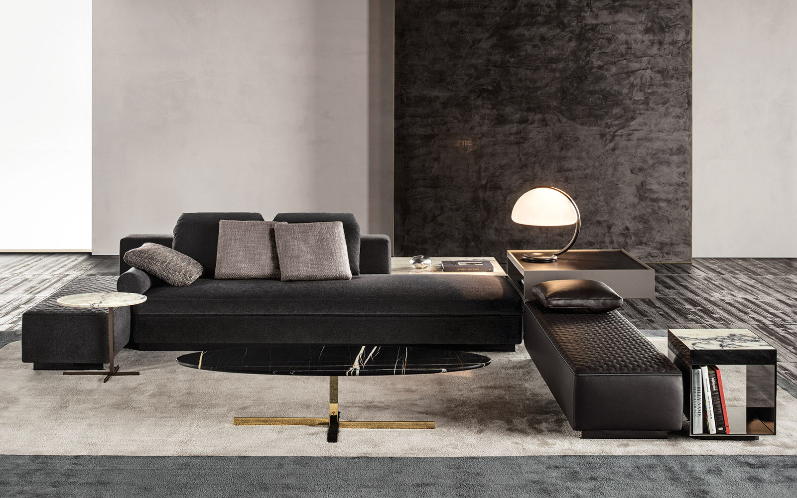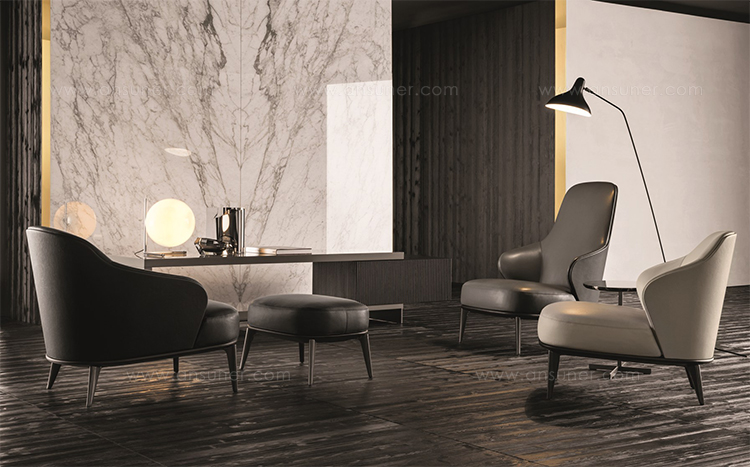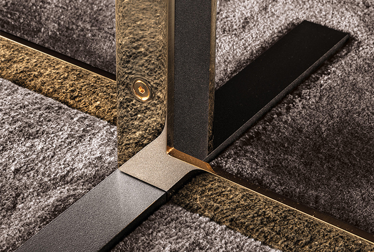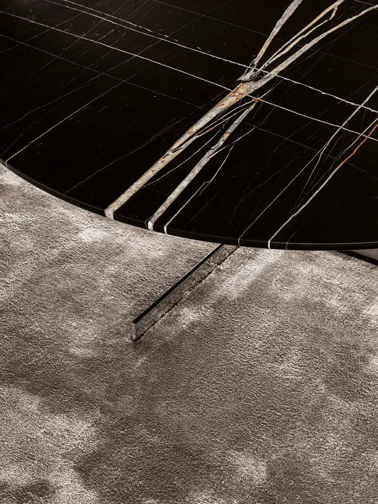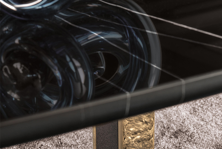 如果说Catlin边柜的设计崇尚简洁,那么材质的选择则旨在打造非凡的视觉和触觉效果。金属基座有着精致的十字形地面支撑腿,其中包括颇有趣味的组合:黑色压花搭配铬色或金色的抛光表面,打造出多种多样的风格。材料的搭配体现出非凡的优雅感,台面可以选择两种珍稀名贵的大理石,Arabescato Purple或Sahara Noir,两者都拥有抛光表面。