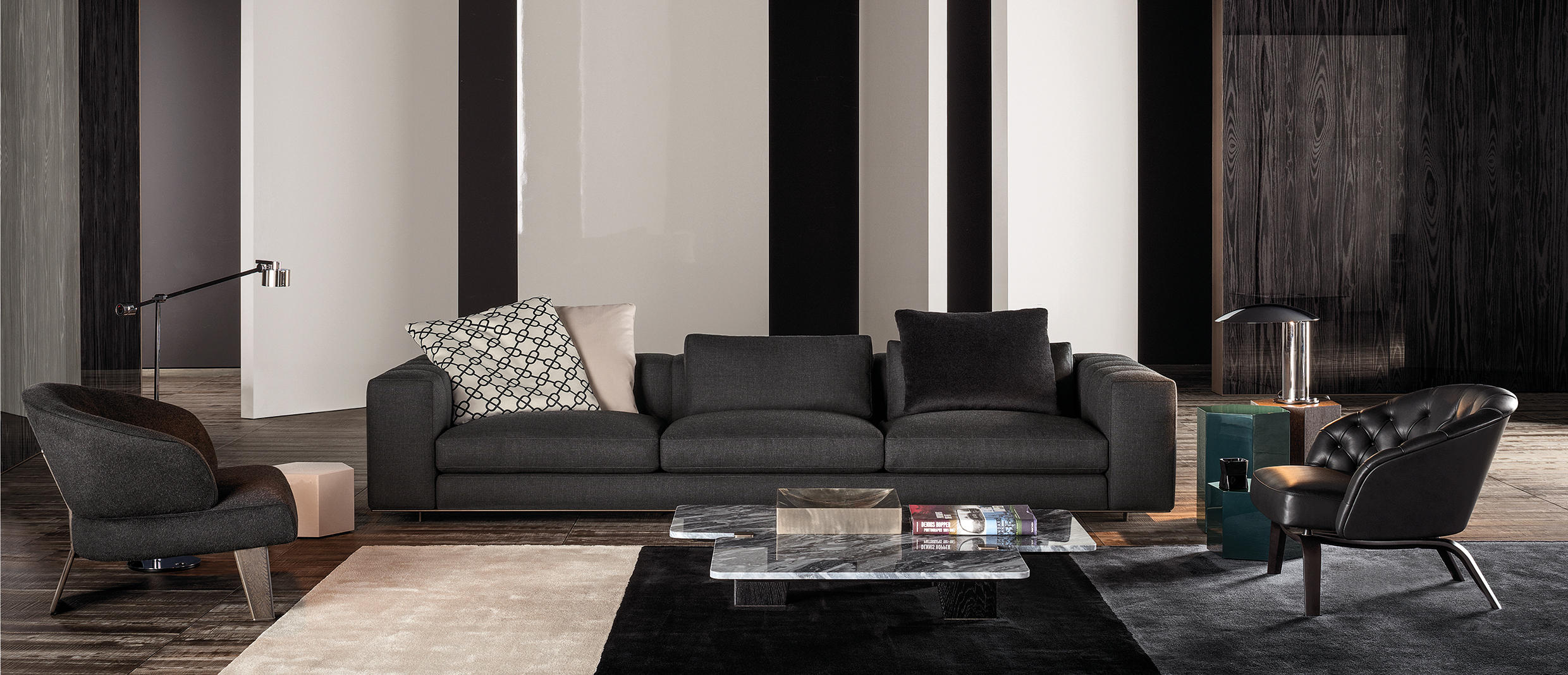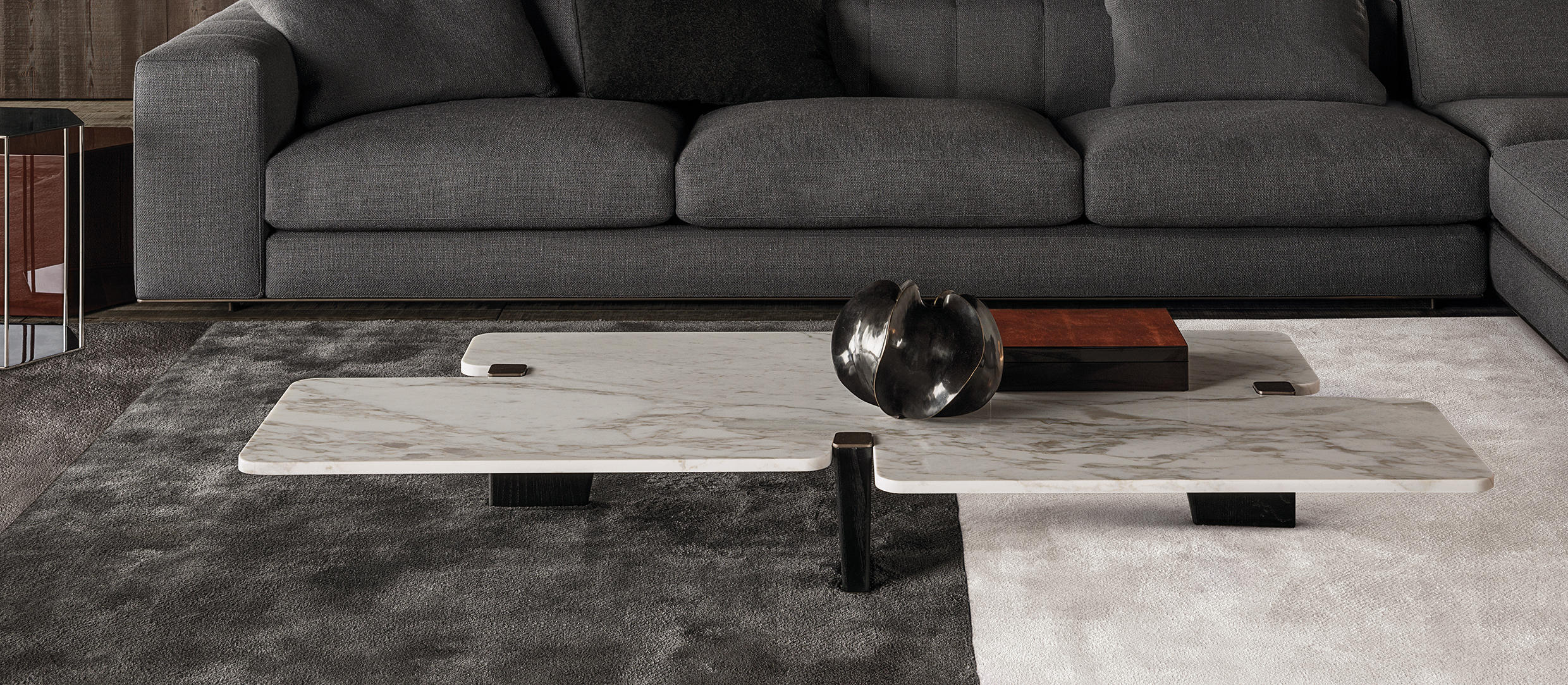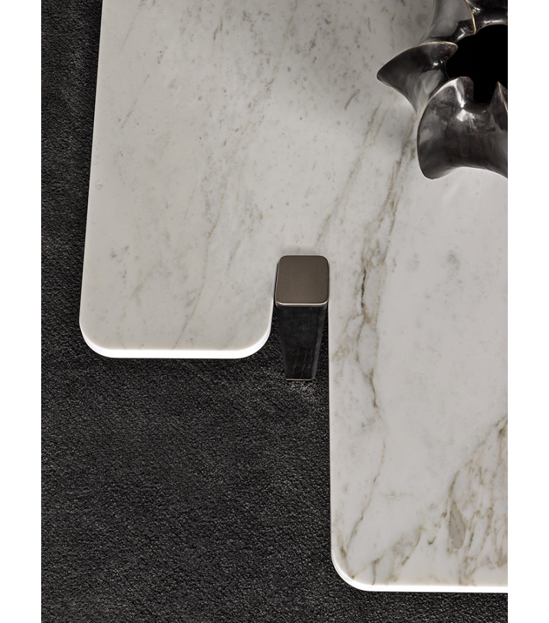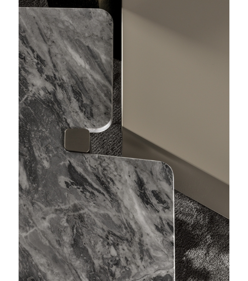 大理石是具有永恒魅力的材质,也为这组边几系列带来了优雅独特的灵感,产品摆放位置灵活多样,饰面种类繁多,此外还有多种造型和尺寸可供选择。桌面造型别具一格,支撑腿为黑色漆面的实心拉丝橡木。地面支撑的末端以及支撑腿顶端的部件采用铜色金属材质,这一细节设计为这款个性十足的产品平添一份精致的优雅感。饰面有不同材质可供选择:从米灰色的鲍迪豆木饰贴面,到精致考究的Calacatta或Bardiglio Nuvolato大理石台面,还有极具现代感的Sand色和灰褐色的亮光漆面。圆形桌面的边几样式不仅有米灰色的鲍迪豆木饰贴面,还有蓝绿色、花岗石色和Sand色的彩绘玻璃饰面。除了边几以外,Jacob家族的成员还包括一款写字台,其桌面样式有Sand色和灰褐色的亮漆饰面,还有米灰色的鲍迪豆木饰贴面。写字台还配有哑光黑漆的木制抽屉。