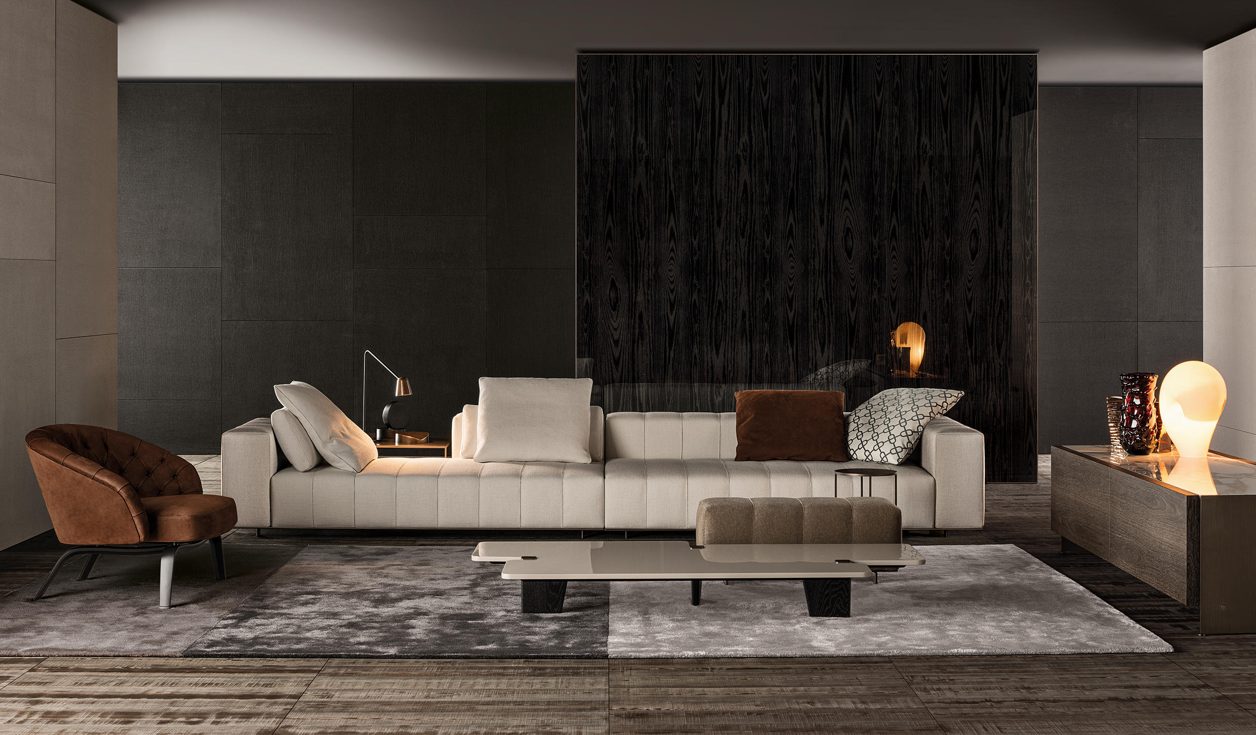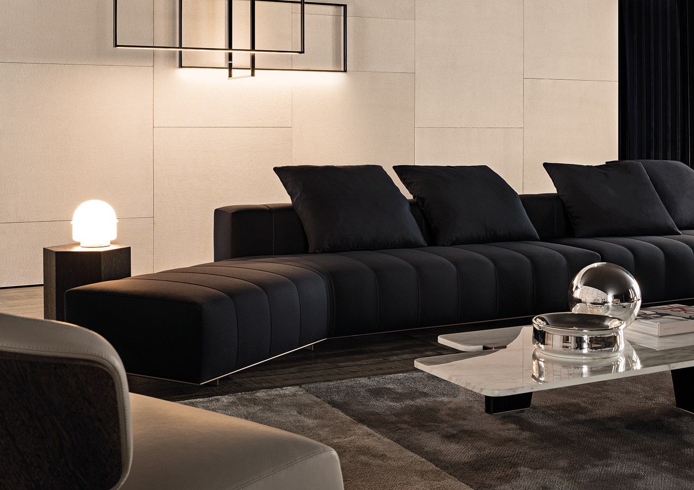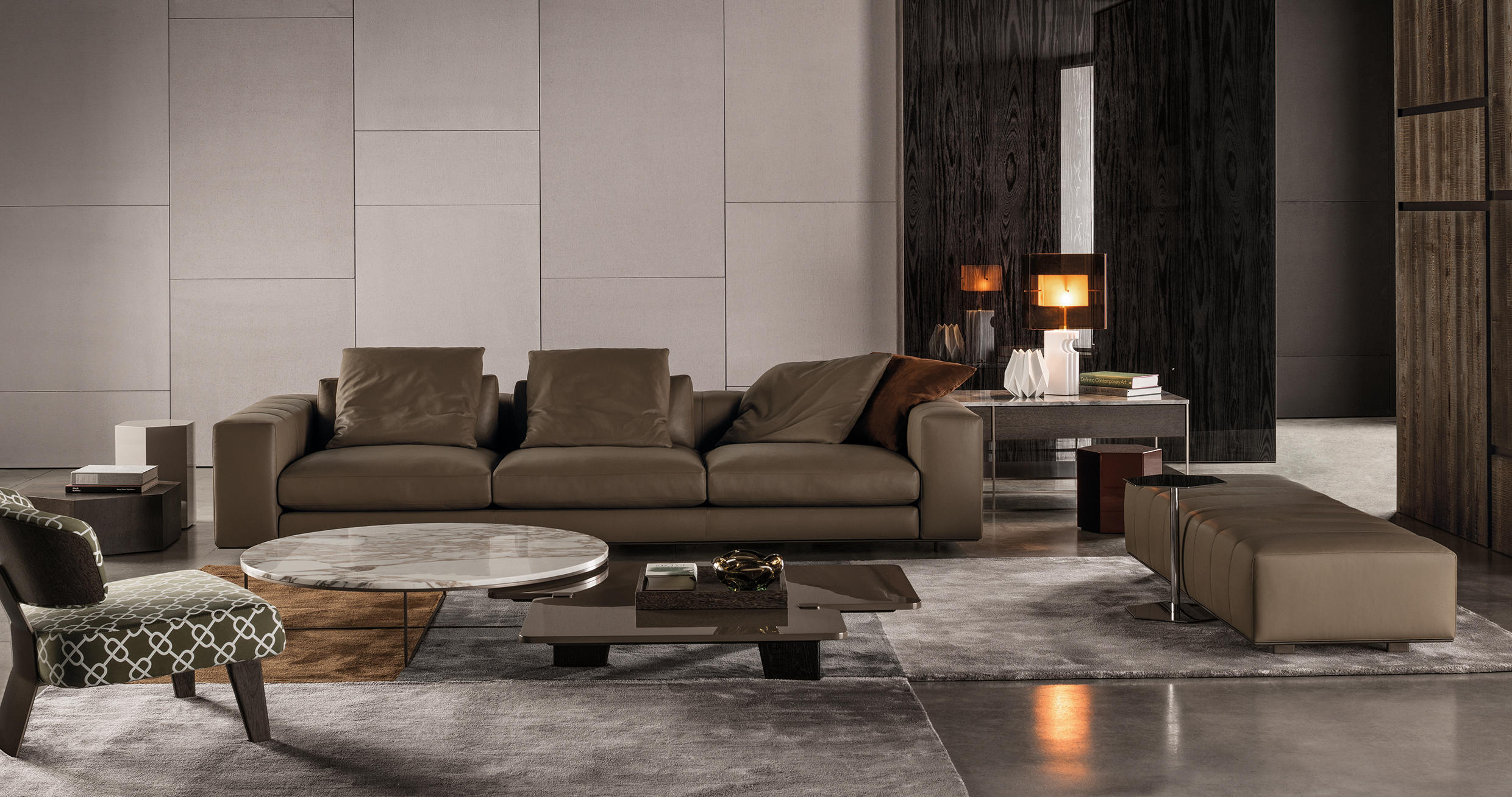大理石是具有永恒魅力的材质,也为这组边几系列带来了优雅独特的灵感,产品摆放位置灵活多样,饰面种类繁多,此外还有多种造型和尺寸可供选择。桌面造型别具一格,支撑腿为黑色漆面的实心拉丝橡木。地面支撑的末端以及支撑腿顶端的部件采用铜色金属材质,这一细节设计为这款个性十足的产品平添一份精致的优雅感。饰面有不同材质可供选择:从米灰色的鲍迪豆木饰贴面,到精致考究的Calacatta或Bardiglio Nuvolato大理石台面,还有极具现代感的Sand色和灰褐色的亮光漆面。圆形桌面的边几样式不仅有米灰色的鲍迪豆木饰贴面,还有蓝绿色、花岗石色和Sand色的彩绘玻璃饰面。除了边几以外,Jacob家族的成员还包括一款写字台,其桌面样式有Sand色和灰褐色的亮漆饰面,还有米灰色的鲍迪豆木饰贴面。写字台还配有哑光黑漆的木制抽屉。