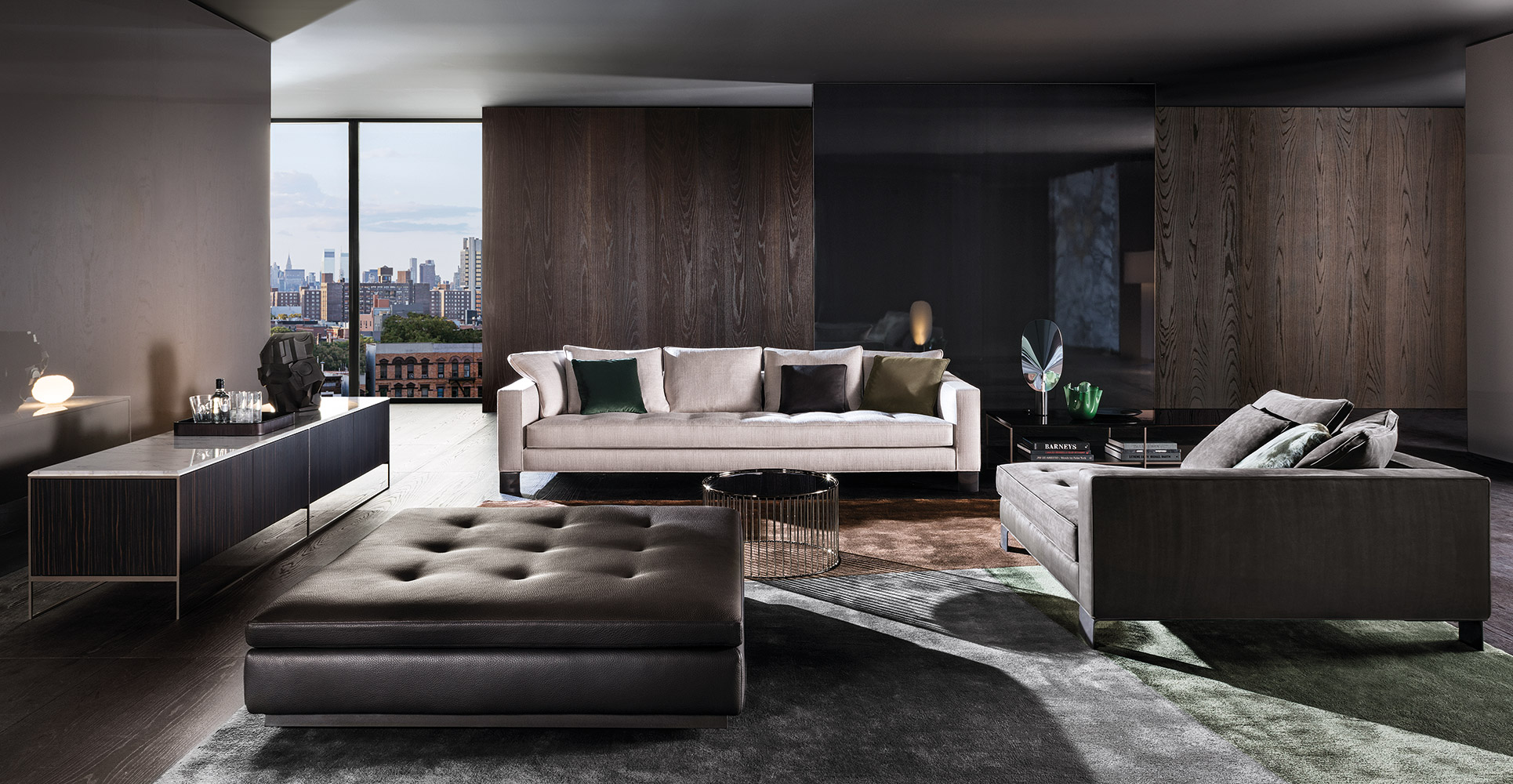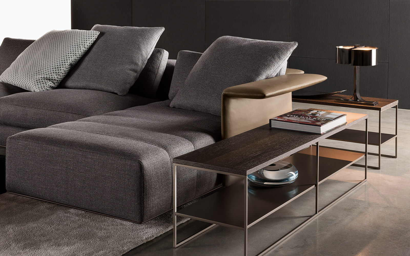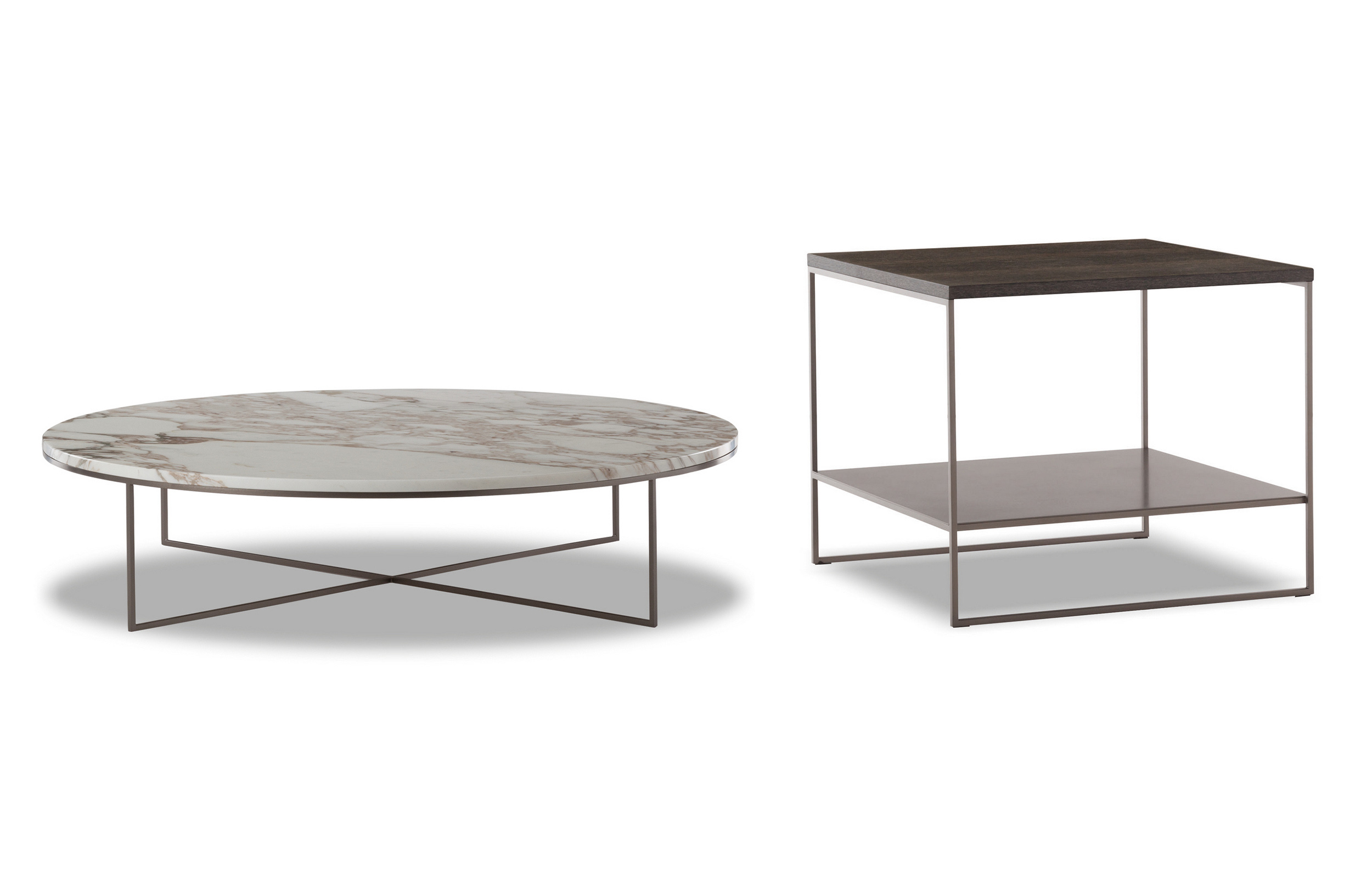 Calder家族有各种尺寸的边几和边桌,这一组全新的设计方案为其带来更为清新时尚的造型。铁架结构如今采用亚光浅铜色的表面。桌面也推出新版本:Sand色亮漆,米灰色的鲍迪豆木饰贴面,Bardiglio Nuvolato和Calacatta的大理石。中间层的桌面也为亚光浅铜漆面的金属。