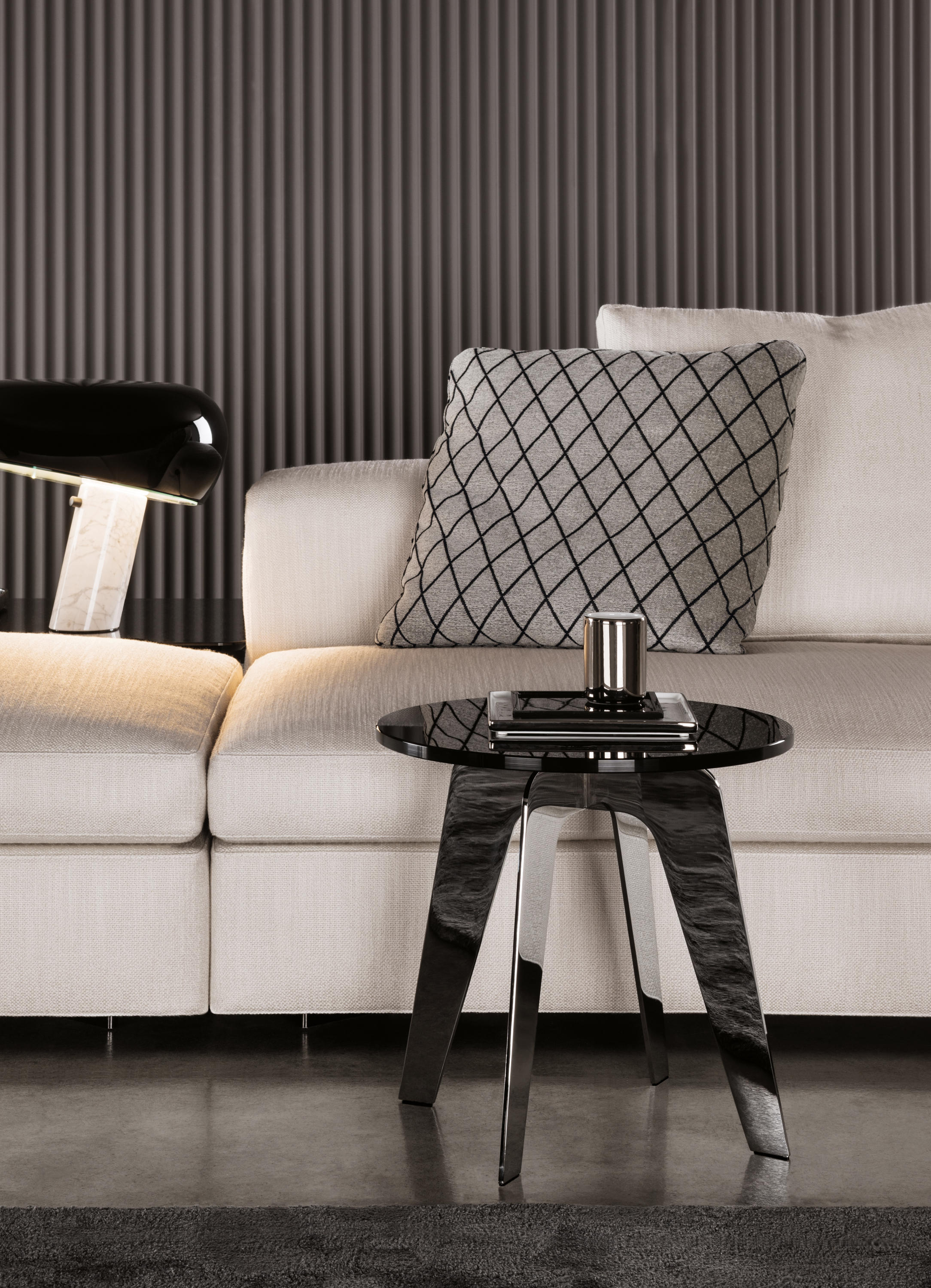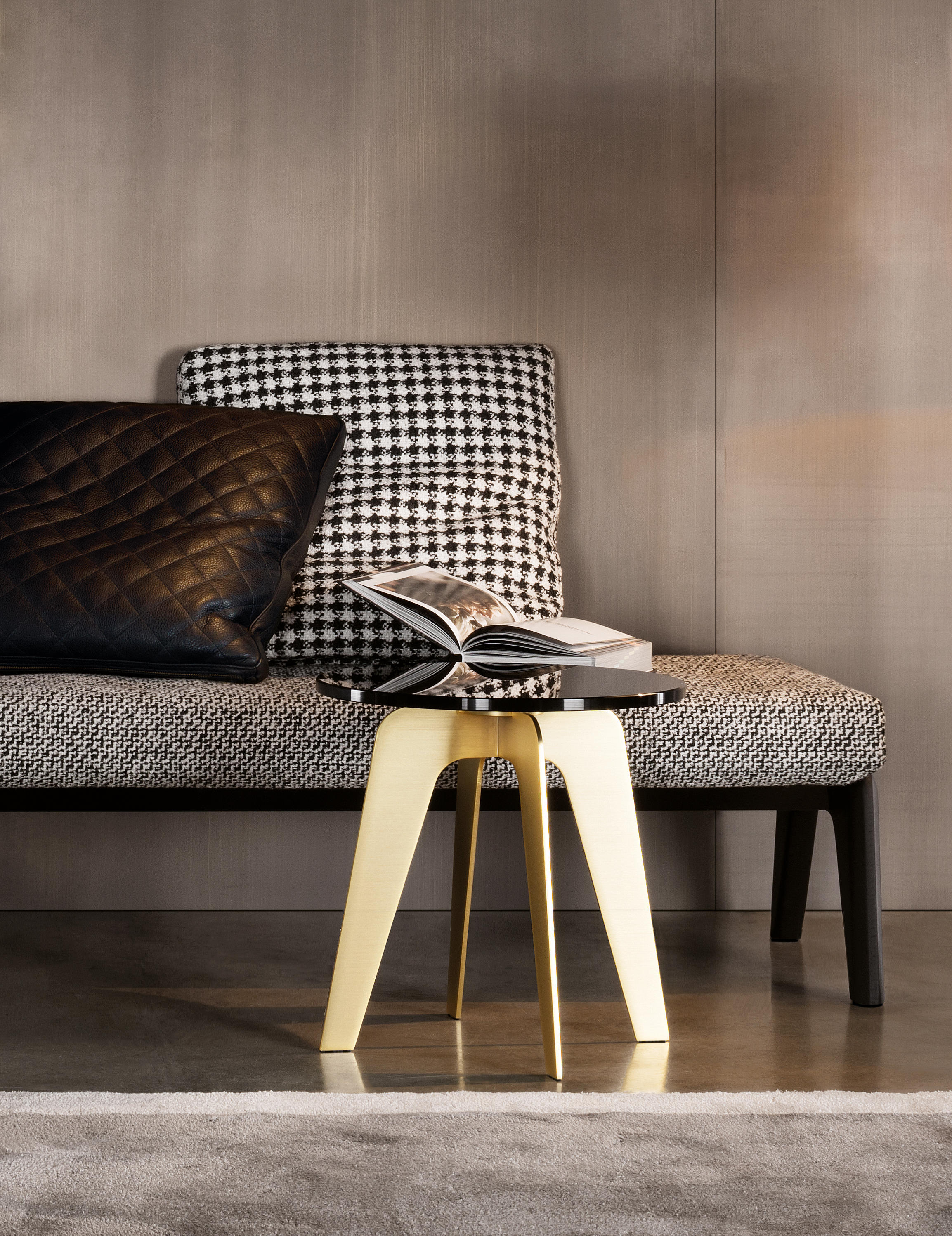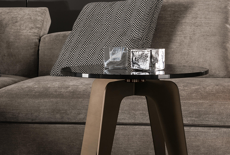 以精美梣木底座致敬传统黑檀木艺术,搭配拥有圆滑转角与柔和饰边的光泽漆面黑檀木、黑色脱蜡琉璃及 Marron Damasco 大理石台板。