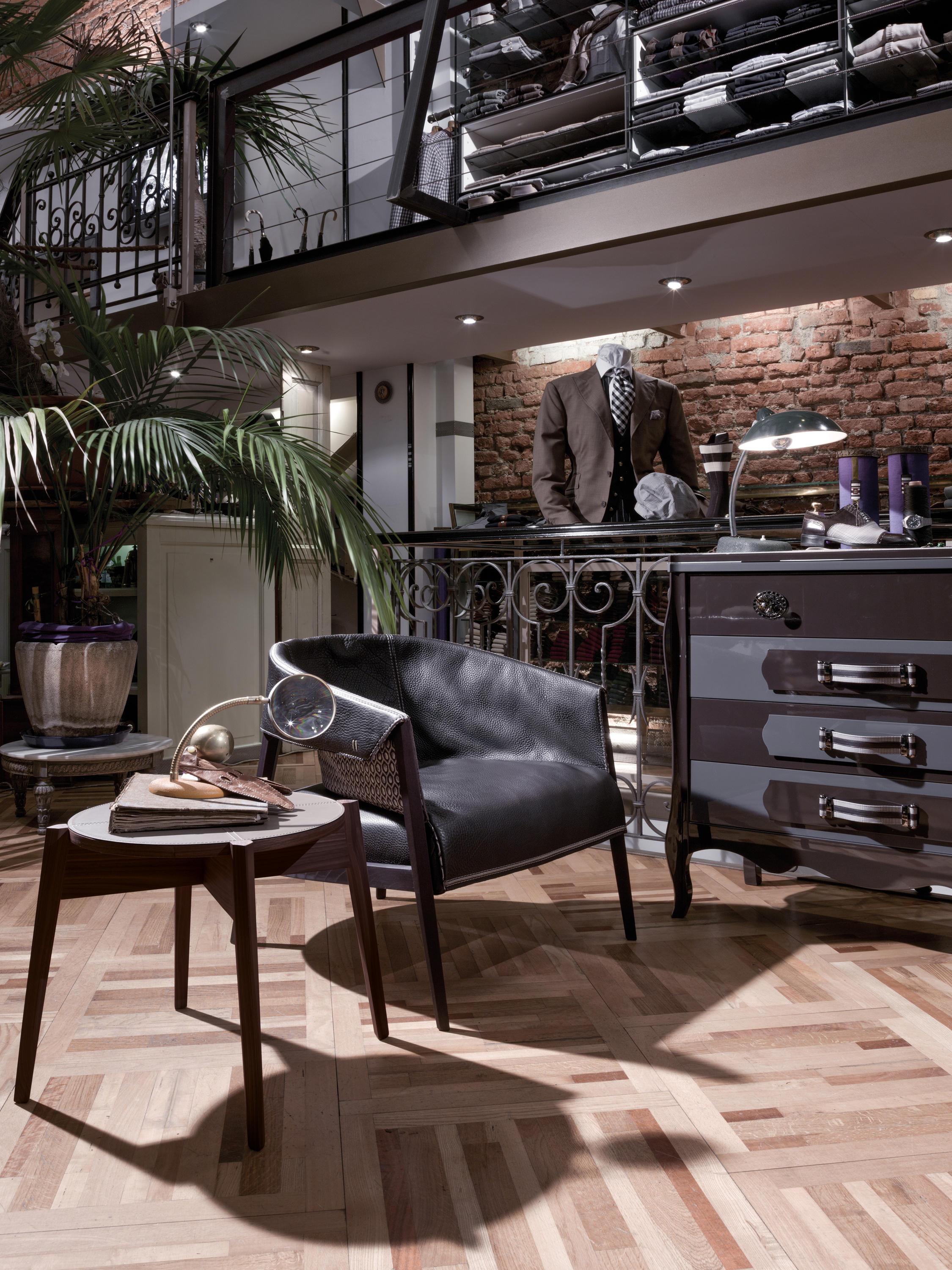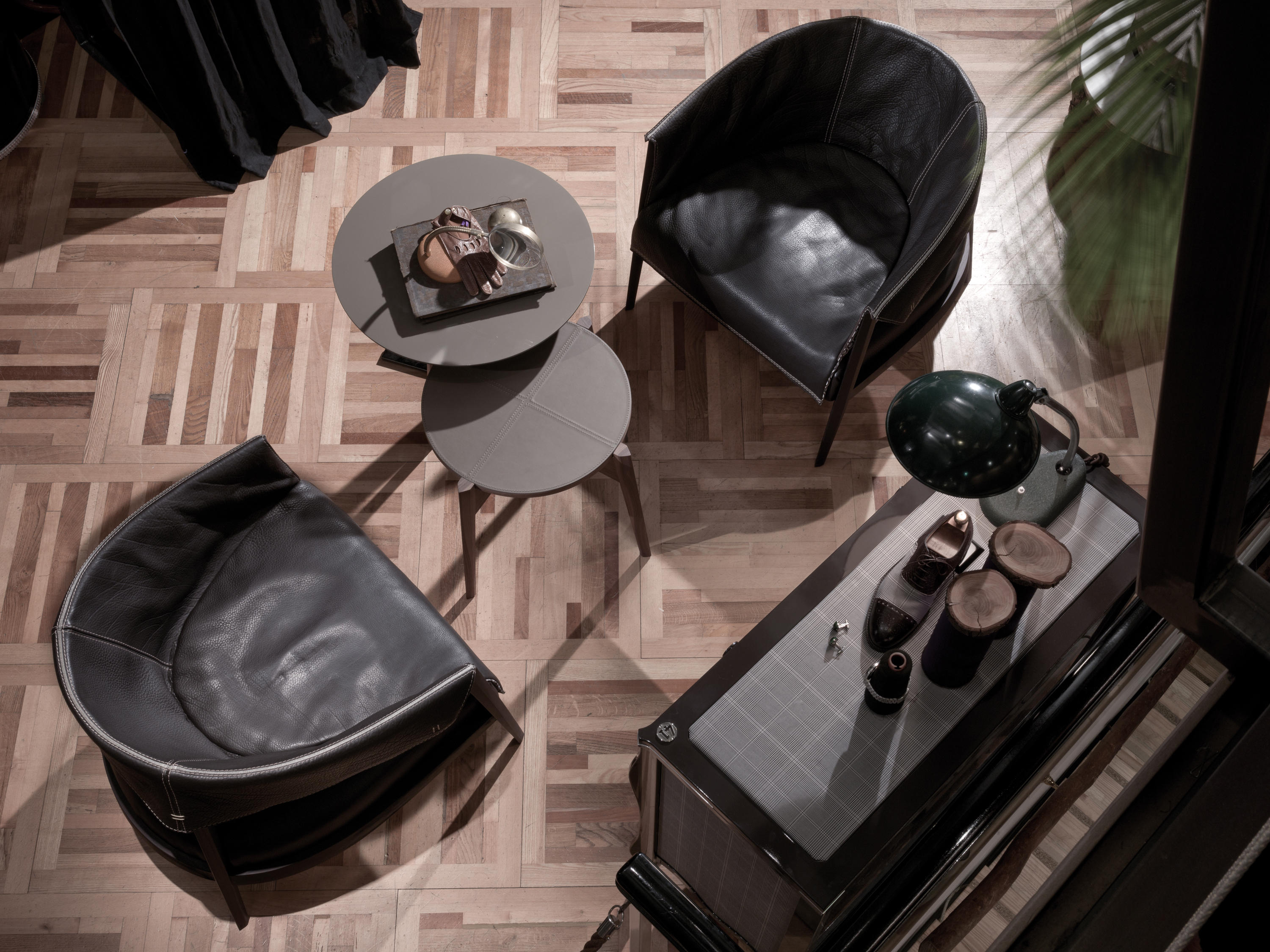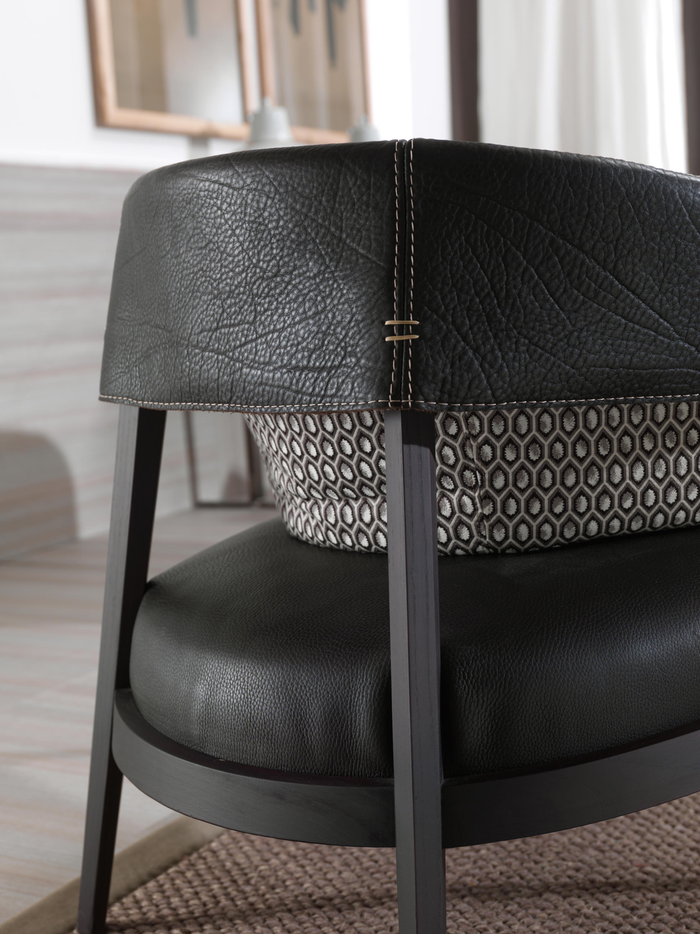 截锥形状特征的这把椅子是由特殊的耦合增强衬里的皮革和织物对比颜色深浅,模式和裁剪,座位和包裹起来的上层框架。 后者是几乎完全暴露,从而成为一个中心的整体组成、封面,还可以推出它完全删除了.