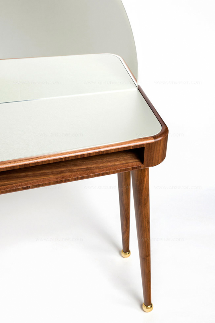 这张工作/化妆台左边有一个抽屉,右边有一个小壁龛,用来存放你的物品。表面皮革和黄铜是可定制的。