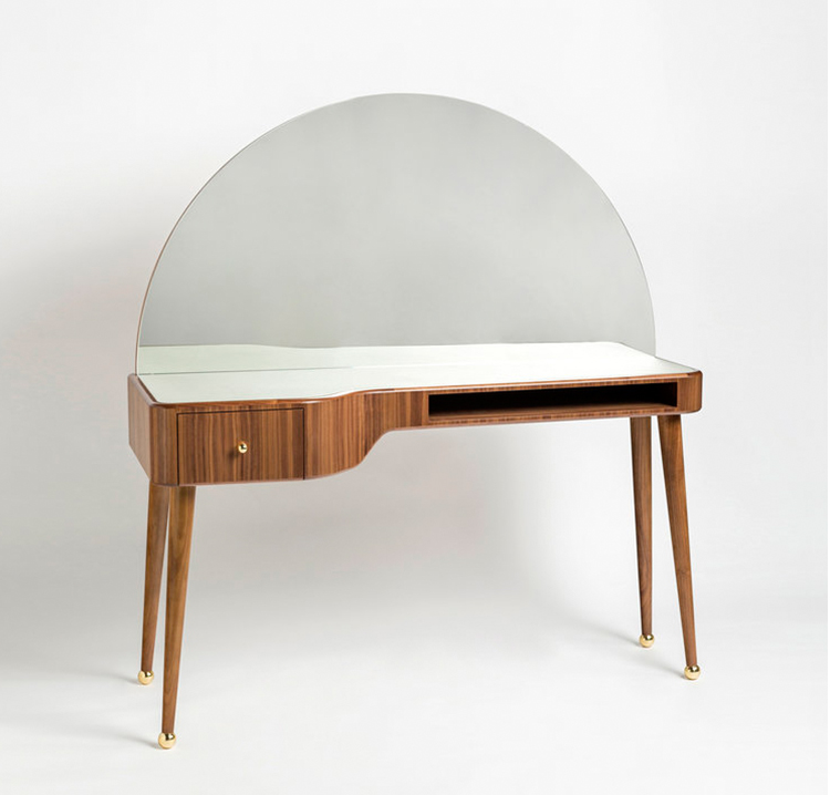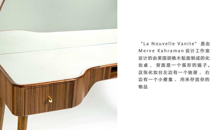 “La Nouvelle Vanite”是由Merve Kahraman设计工作室设计的由美国胡桃木贴面制成的化妆桌,背面是一个弧形的镜子。