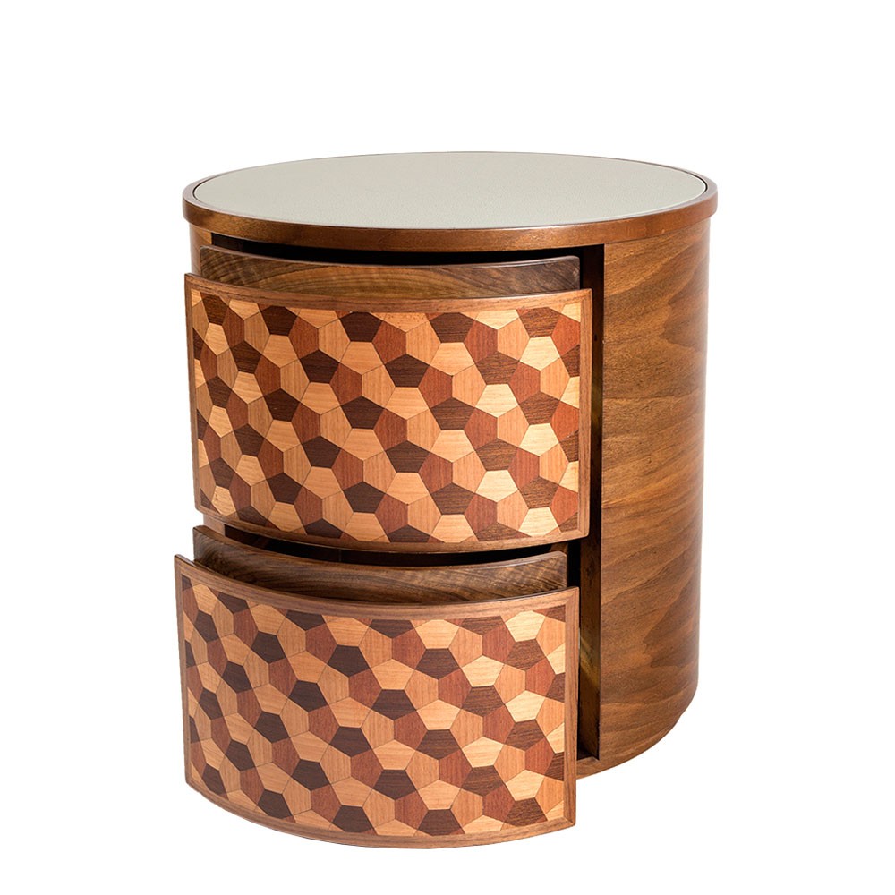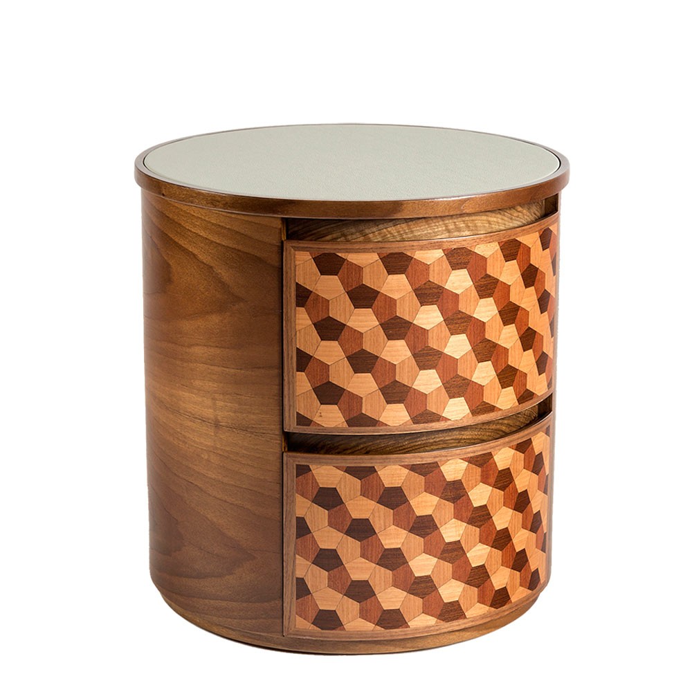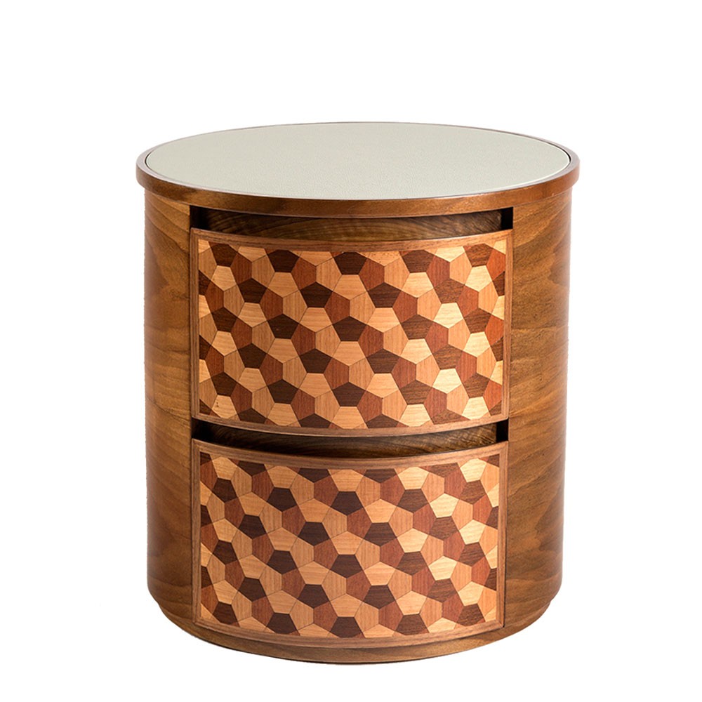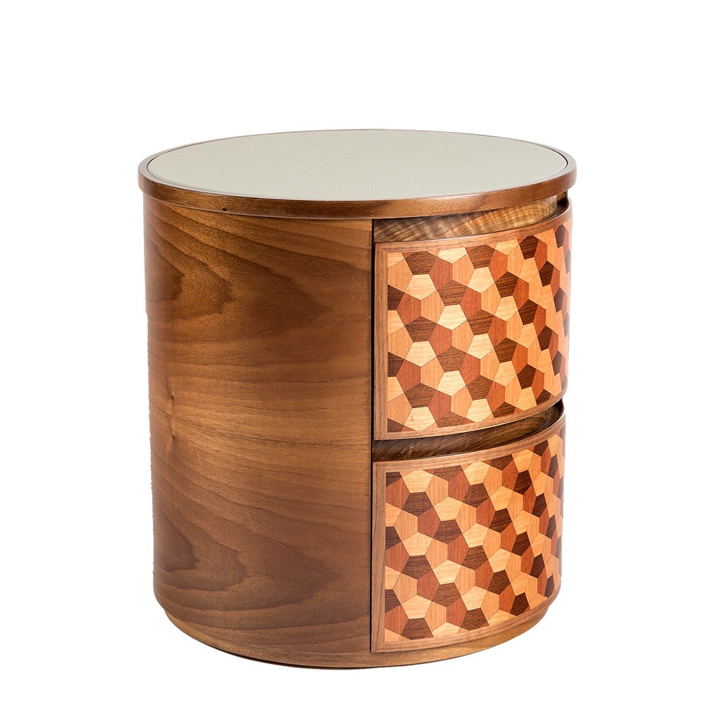 这款手工制作的圆形床头柜具有可定制的皮革顶部表面,包含整体复古感。