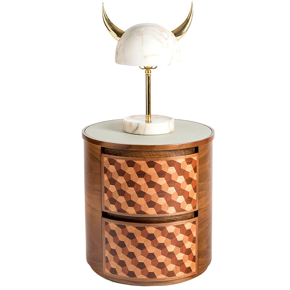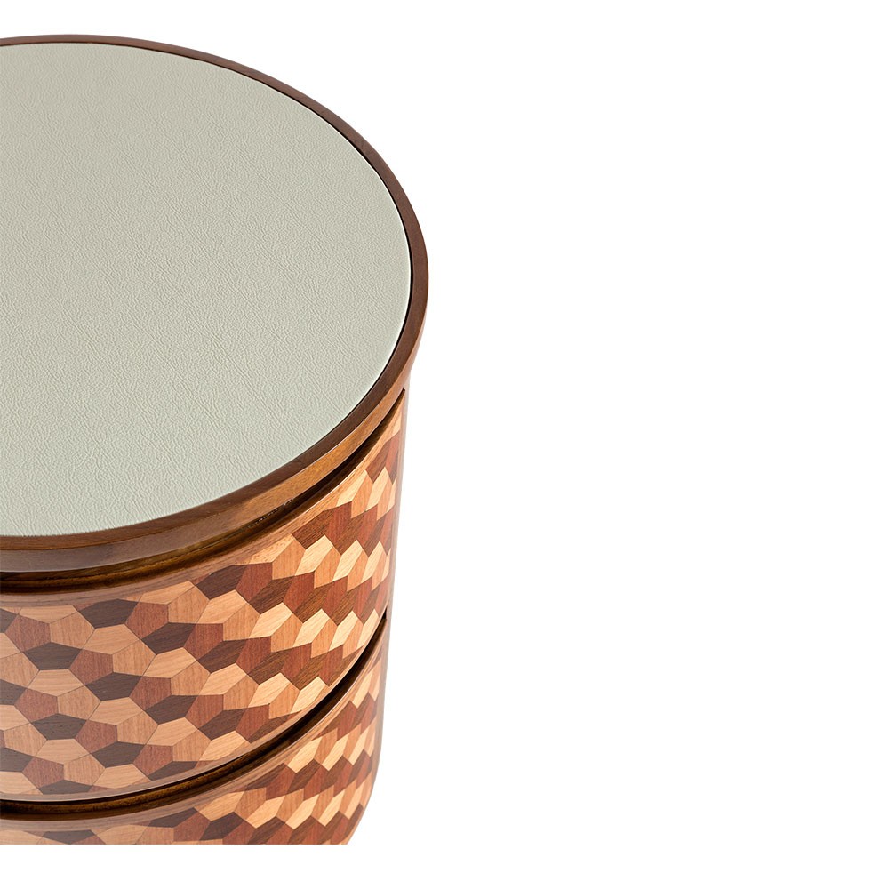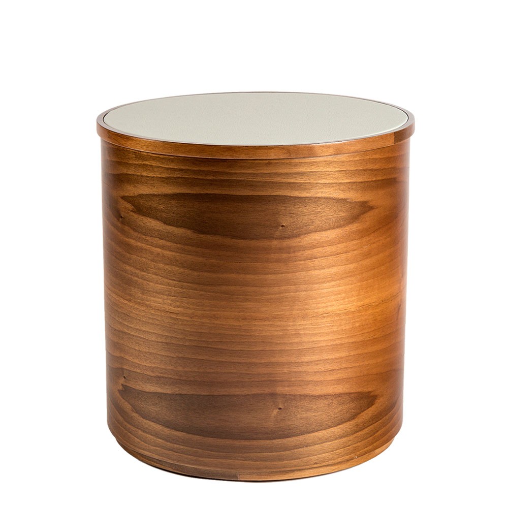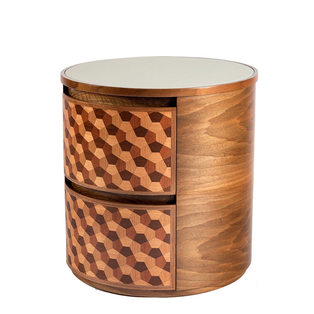 这款手工制作的圆形床头柜具有可定制的皮革顶部表面,包含整体复古感。