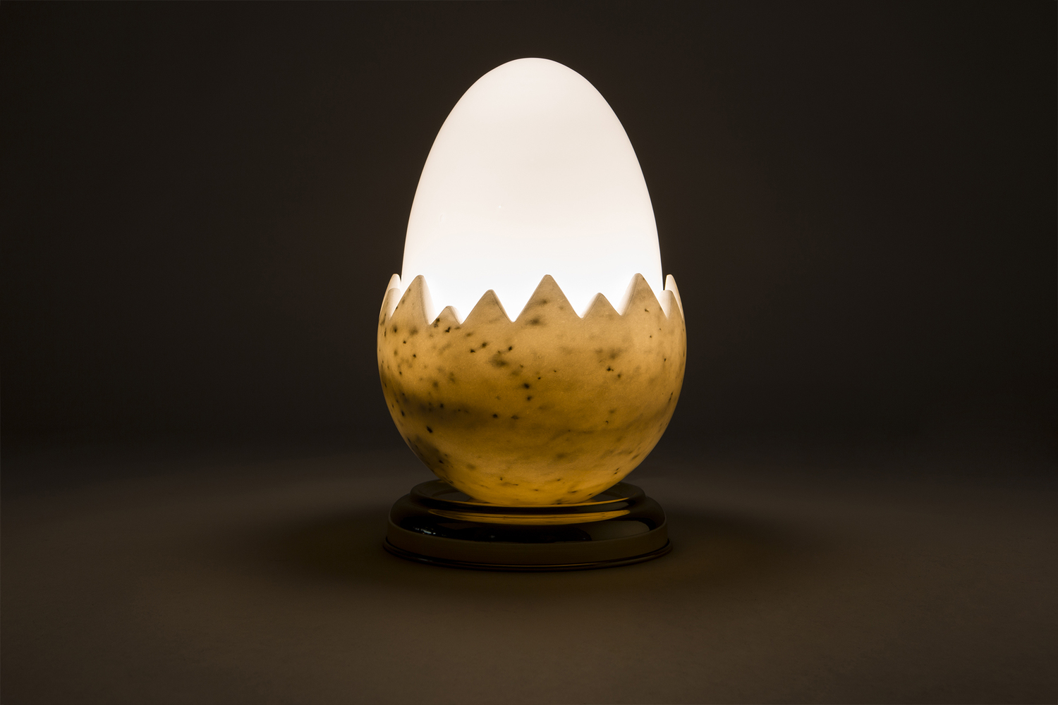 Oviraptor以恐龙蛋化石命名,类似于一个巨大的鸡蛋,外壳由玻璃和大理石制成。抛光的黄铜底座为这款照明产品增添了魅力,可用作台灯。 白色不透明玻璃和大理石外壳散发出宜人,温暖的光线。 大理石部分是手工雕塑,与黄铜底座相连。