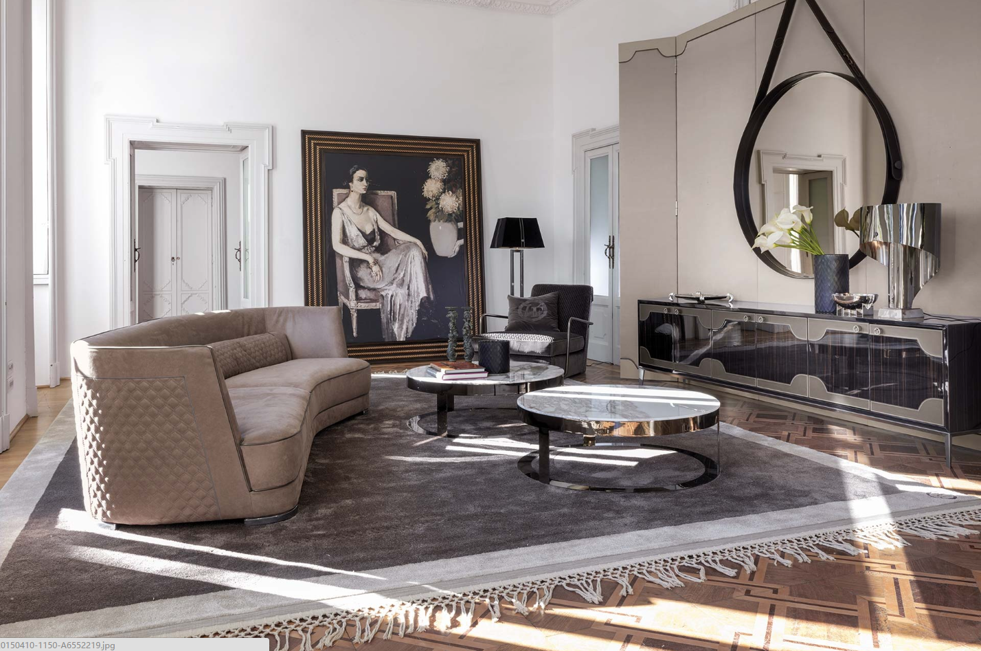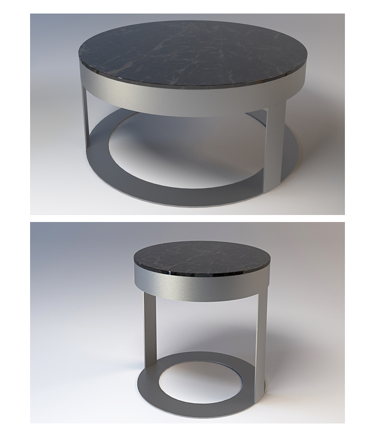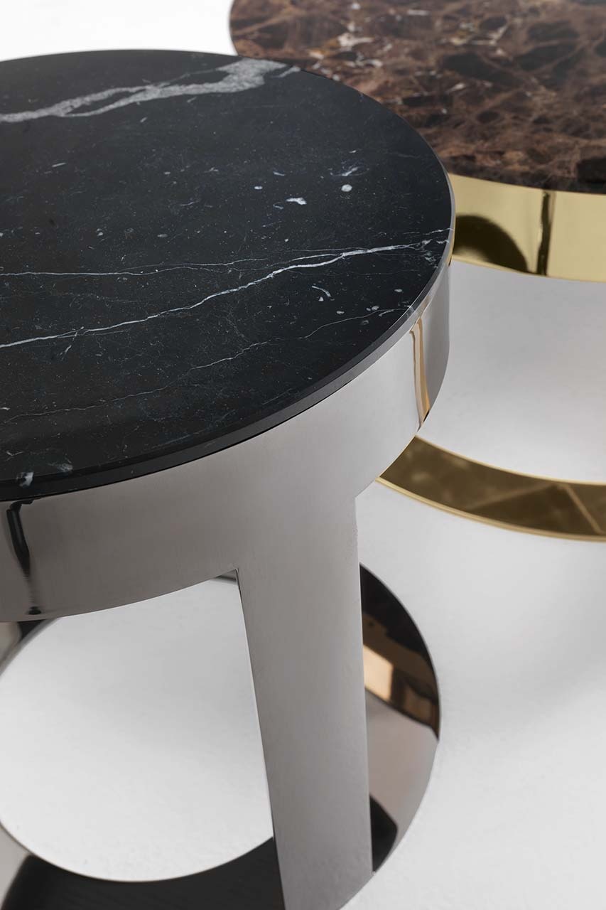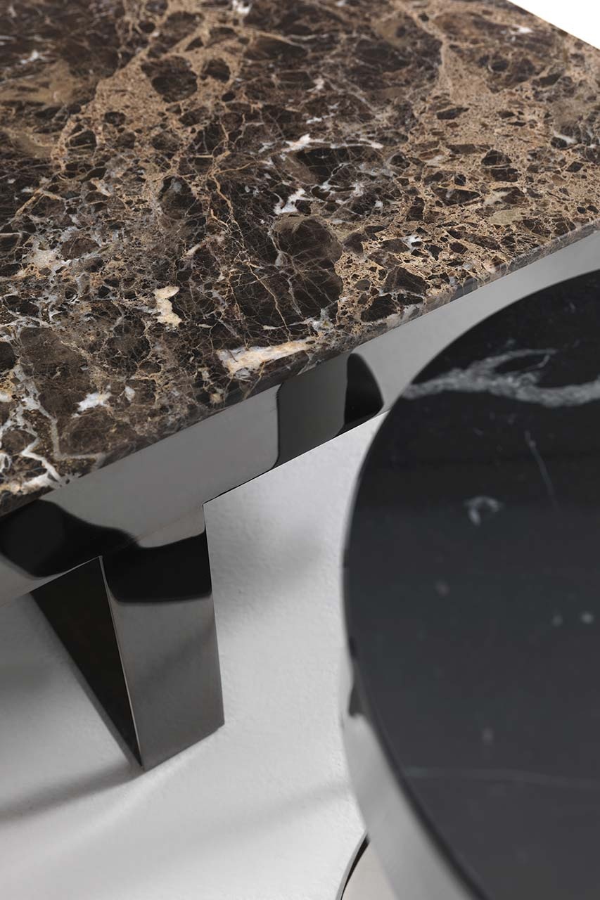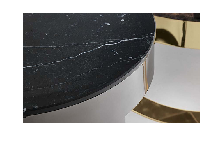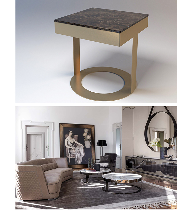 无论是正方形还是圆形,它把大理石的光泽和精致的金属底座或皮革的温暖结合起来。