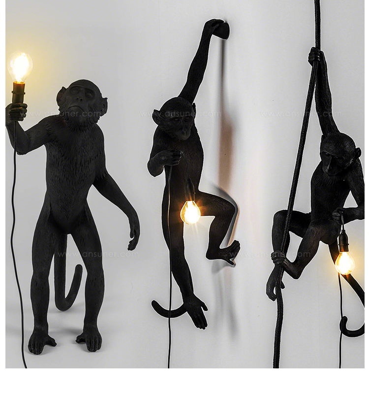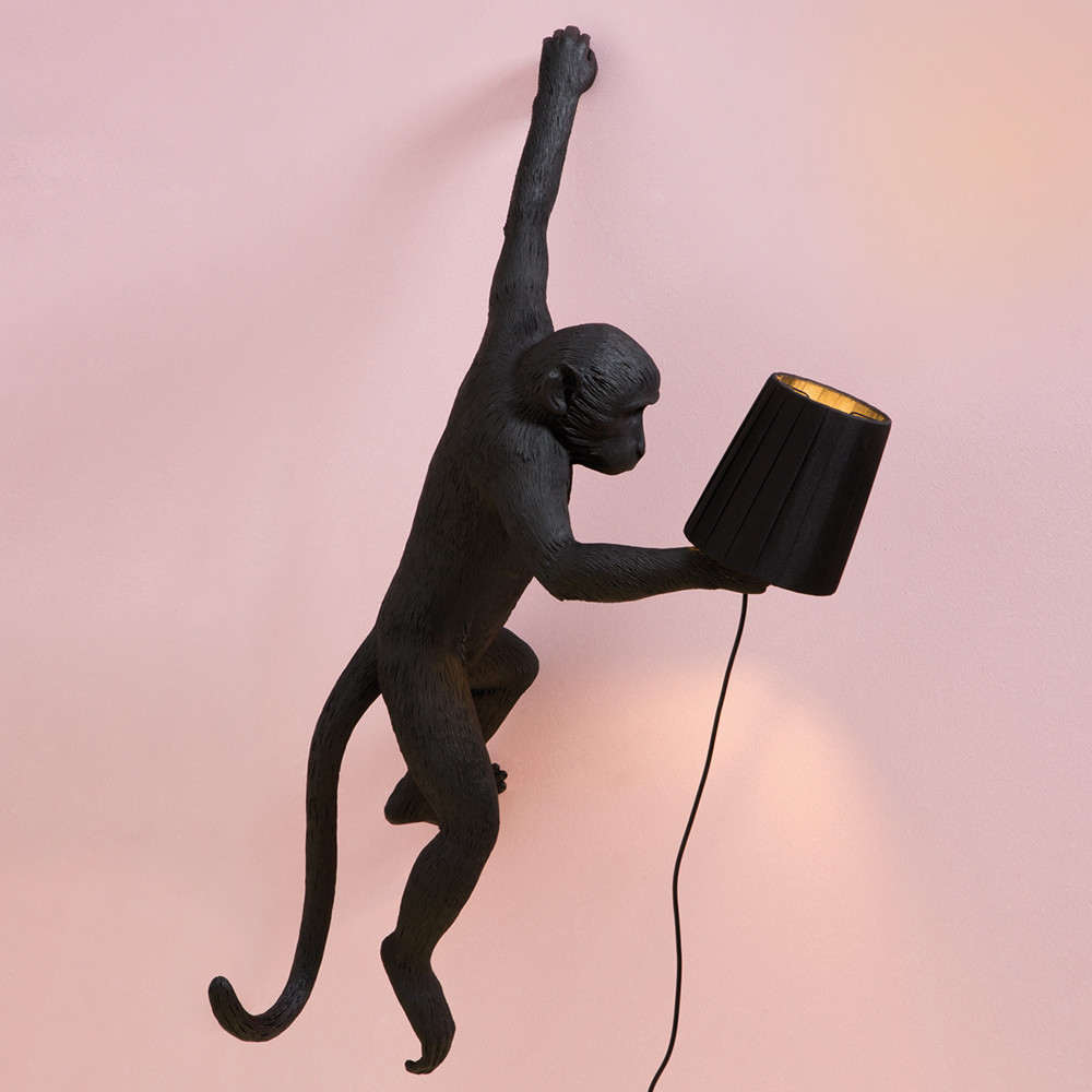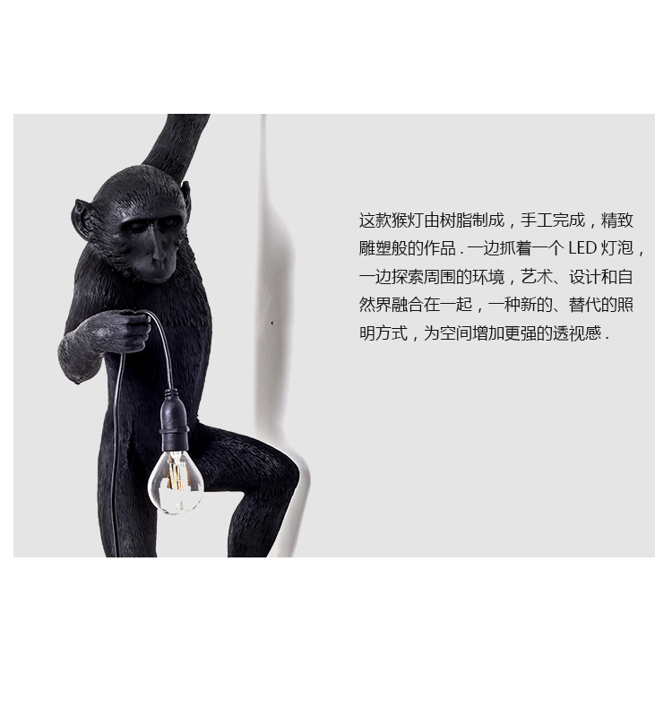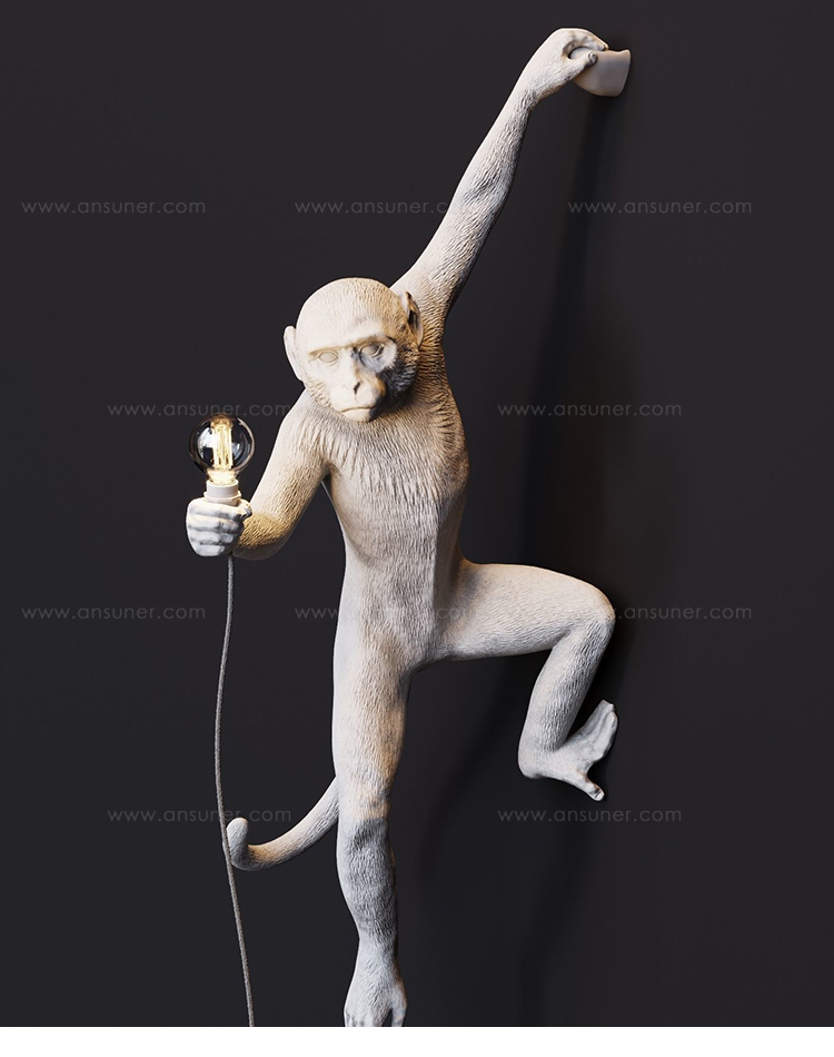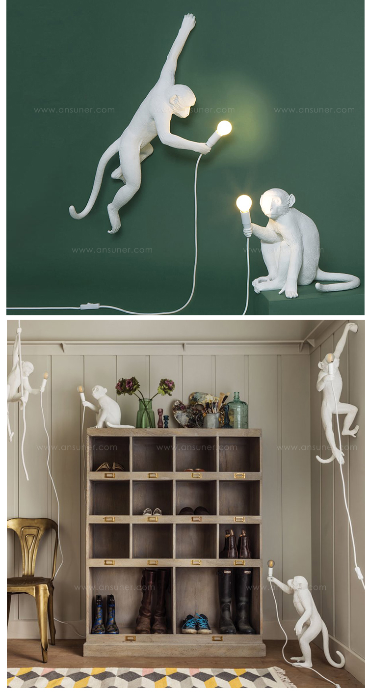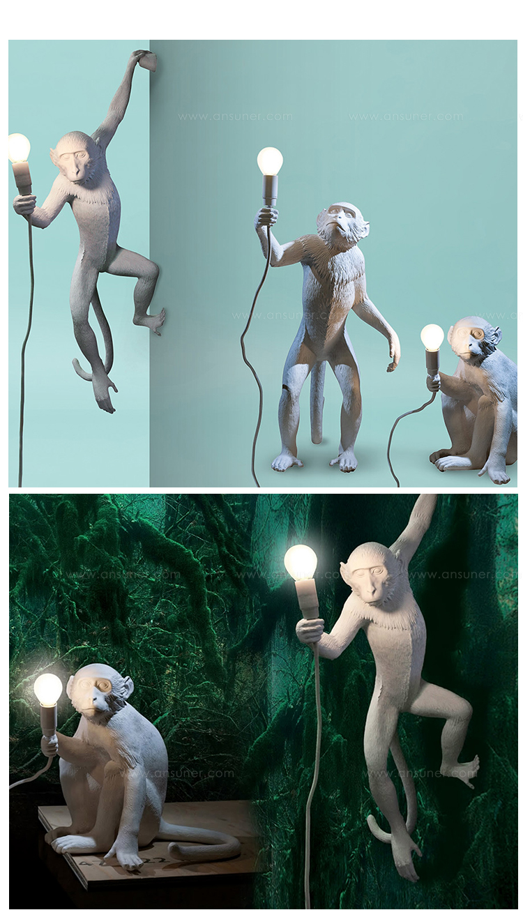这款猴灯由树脂制成,手工完成,描绘了一只猴子在三个不同的位置,一边抓着一个LED灯泡,一边探索周围的环境:一种新的、替代的照明方式。猴子很容易让人联想到人类:这就是为什么我经常在我的雕塑作品中提到它们。在Seletti的版本中,他们溜进了我们的房子,觉得他们是在偷那些灯泡,其实是在为我们服务。