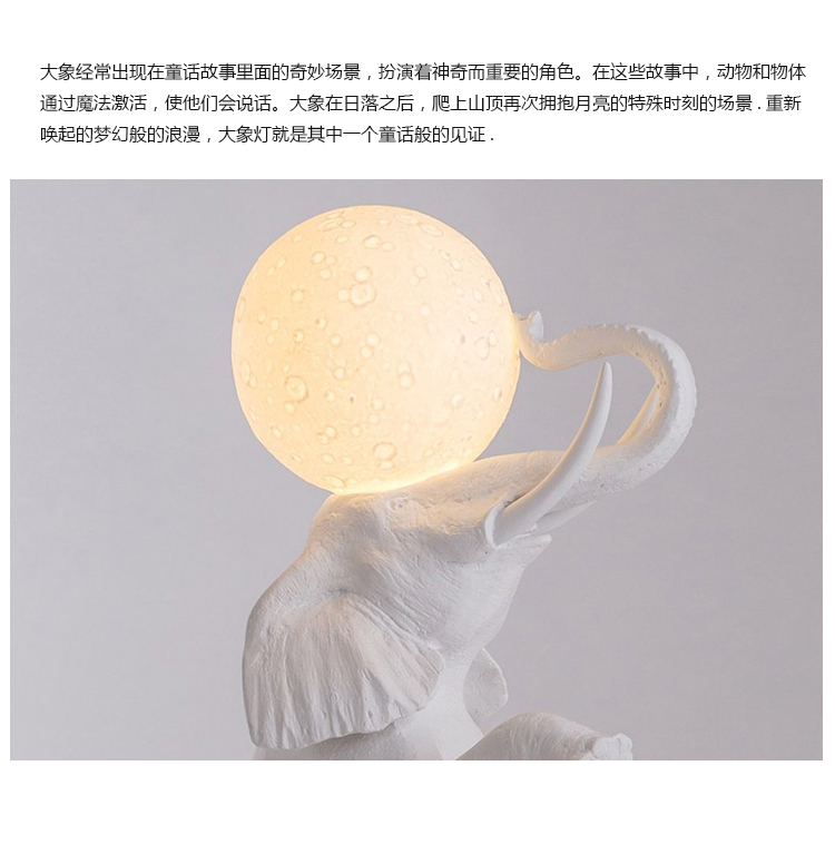 雕塑般的设计,表达对自然、动物、月亮之美的热爱,同时也是想要的重新唤起的梦幻般的浪漫,大象灯就是其中一个童话般的见证.