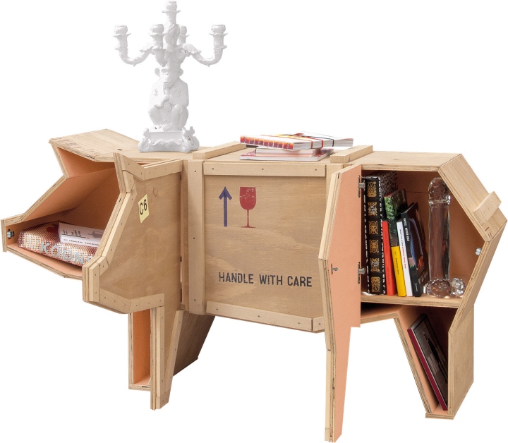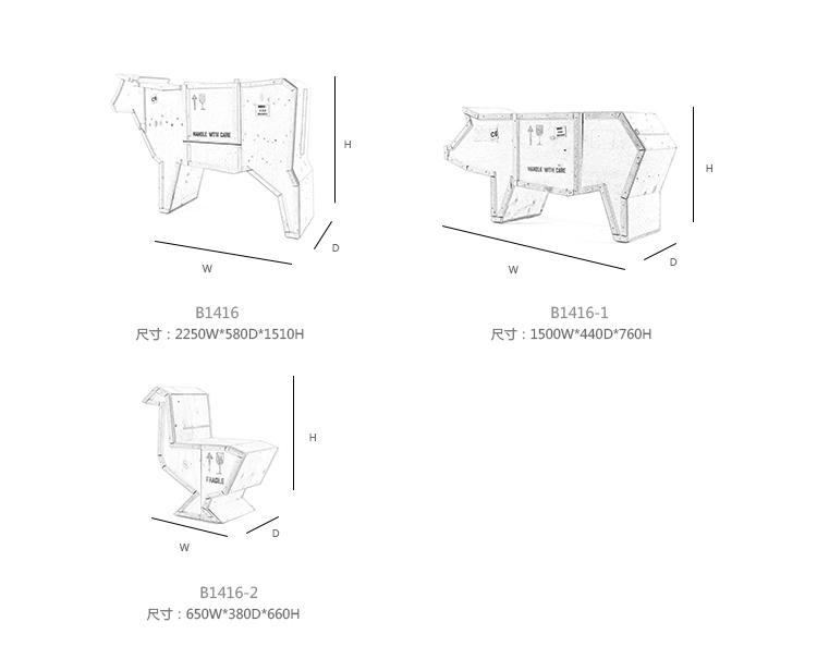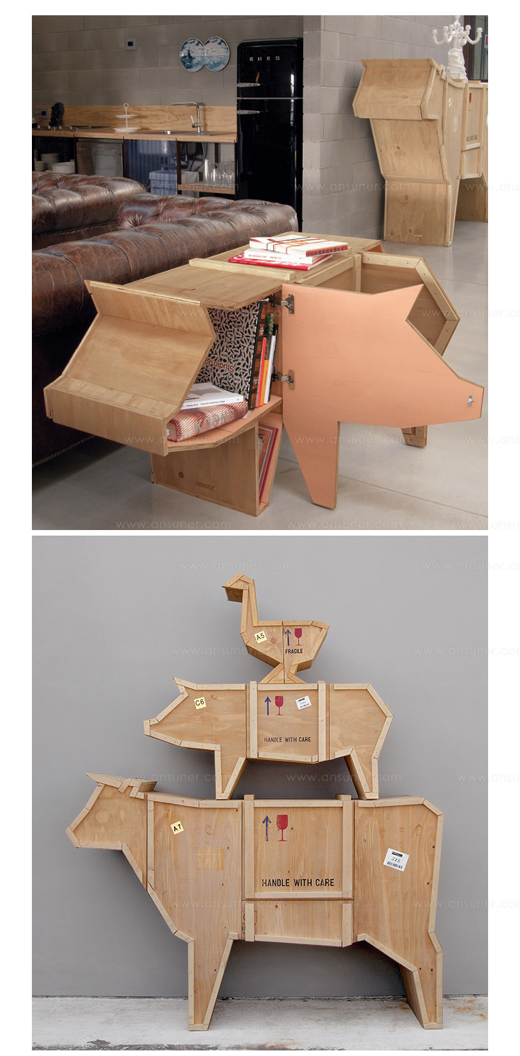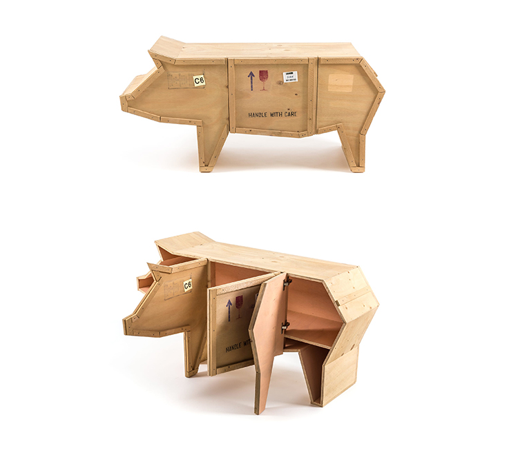 讽刺是一件严肃的事情,如果在微笑的同时让我们思考。动物板条箱协会很有趣,但同时也让我们对人类与自然的关系感到敏感。这件家具作品代表了一种荒谬的形象,动物们被运来运去。可能吗?为了更好地表达这个概念,我们选择了三种典型的农场动物,一头牛,一头猪和一只鸭子。每一个可见的瑕疵都是这件作品的特色,为了尊重原作的诗意,这些作品都是用同样的工艺制作而成,用于真正的运输板条箱。